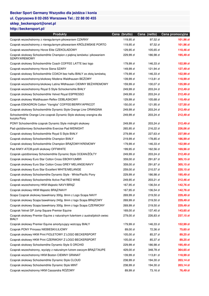 Becker Sport Germany Wszystko dla jeźdźca i konia ul. Cyprysowa 8 02-265 Warszawa Tel.: 22 88 00 455 [email protected] http://beckersport.pl/ Produkty Cena (brutto) Cena (netto) Cena promocyjna Czaprak wszechstronny z nieregularnym pikowaniem CZARNY 119,95 zł 97,52 zł 101,96 zł Czaprak wszechstronny z nieregularnym pikowaniem KRÓLEWSKIE PORTO 119,95 zł 97,52 zł 101,96 zł Czaprak wszechstronny Horze Elite CZEKOLADOWY 129,95 zł 105,65 zł 110,46 zł Czaprak skokowy Schockemöhle Champion z piękną lamówka i pikowaniem SZARY/KREMOWY 229,99 zł 186,98 zł 195,49 zł Czaprak skokowy Schockemöhle Coach COFFEE LATTE bez logo 179,99 zł 146,33 zł 152,99 zł Czaprak wszechstronny Horze Siena SZARY 149,99 zł 121,94 zł 127,49 zł Czaprak skokowy Schockemöhle COACH bez haftu BIAŁY ze złotą lamówką 179,99 zł 146,33 zł 152,99 zł Czaprak wszechstronny/skokowy Modena Waldhausen BEŻOWY 139,99 zł 113,81 zł 118,99 zł Czaprak wszechstronny/skokowy Latina Wldhausen CIEMNY BEŻ/KREMOWY 159,99 zł 130,07 zł 135,99 zł Czaprak wszechstronny Royal S Style Schockemohle BIAŁY 249,99 zł 203,24 zł 212,49 zł Czaprak skokowy Schockemöhle Velvet Royal ESPRESSO 249,99 zł 203,24 zł 212,49 zł Czaprak skokowy Waldhausen Reflex ODBLASKOWY 129,99 zł 105,68 zł 110,49 zł Czaprak ESKADRON Cotton ''Vaniglia'' COFFEE/BERRY/APRICOT 150,00 zł 121,95 zł 127,50 zł Czaprak skokowy Schockemöhle Dynamic Style Orange Line ORANGINA 249,99 zł 203,24 zł 212,49 zł Schockemöhle Orange Line czaprak Dynamic Style skokowy orangina dla kucyka Pony 249,99 zł 203,24 zł 212,49 zł PONY Schockemöhle czaprak Dynamic Style midnight skokowy 249,99 zł 203,24 zł 212,49 zł Pad ujeżdżeniowy Schockemöhle Exercise Pad MIDNIGHT 265,95 zł 216,22 zł 226,06 zł Czaprak skokowy Schockemöhle Royal S Style BIAŁY 279,99 zł 227,63 zł 237,99 zł Czaprak skokowy Schockemöhle Champion BIAŁY 219,99 zł 178,85 zł 186,99 zł Czaprak skokowy Schockemöhle Champion BRĄZOWY/KREMOWY 179,99 zł 146,33 zł 152,99 zł Pad ANKY-ATC® profil skokowy OFFWHITE 199,95 zł 162,56 zł 169,96 zł Czaprak ujeżdżeniowy Schockemöhle Dynamic Style OCEAN/ŻÓŁTY 249,99 zł 203,24 zł 212,49 zł Czaprak skokowy Euro Star Cotton Cross EBONY/UMBR 359,00 zł 291,87 zł 305,15 zł Czaprak skokowy Euro Star Cotton Cross GREY MELANGE/NAVY 359,00 zł 291,87 zł 305,15 zł Czaprak skokowy Euro Star Excellent WHITE/MELANGE 259,00 zł 210,57 zł 220,15 zł Czaprak skokowy Schockemöhe Dynamic Style - White/Pacific Pony 229,99 zł 186,98 zł 195,49 zł Czaprak skokowy Schockemöhle Active Pad RED WINE 249,95 zł 203,21 zł 212,46 zł Czaprak wszechstronny HKM Majestic NAVY/BRĄZ 167,95 zł 136,54 zł 142,76 zł Czaprak skokowy HKM Majestic BRĄZ/NAVY 167,95 zł 136,54 zł 142,76 zł Scapa Czaprak skokowy bawełniany 300g. 8mm z Logo Scapa NAVY 269,99 zł 219,50 zł 229,49 zł Czaprak skokowy Scapa bawełniany 240g. 8mm z logo Scapa BRĄZOWY 269,99 zł 219,50 zł 229,49 zł Czaprak skokowy Scapa bawełniany 300g. 8mm z logo Scapa CZERWONY 269,99 zł 219,50 zł 229,49 zł Czaprak Velvet GP Jump Square Premier Equine 169,00 zł 137,40 zł 143,65 zł Czaprak skokowy Premier Equine z naturalnym futerkiem z australijskich owiec BIAŁY 279,00 zł 226,83 zł 237,15 zł Czaprak skokowy Premier Equine amortyzujący wstrząsy BIAŁY 179,99 zł 146,33 zł 152,99 zł 89,00 zł 72,36 zł 75,65 zł Czaprak skokowy HKM Print FIOLETOWY Z LOGO BECKERSPORT 105,00 zł 85,37 zł 89,25 zł Czaprak skokowy HKM Print CZERWONY Z LOGO BECKERSPORT 105,00 zł 85,37 zł 89,25 zł Czaprak skokowy Schockemöhe Dynamic Style S ORCHID 229,99 zł 186,98 zł 195,49 zł Czaprak wszechstronny, wycięty z naturalnym futrem owczym BRĄZ/TAUPE 429,00 zł 348,78 zł 364,65 zł Czaprak wszechstronny HKM Boston CIEMNY GRANAT 139,99 zł 113,81 zł 118,99 zł Czaprak skokowy Schockemöhle Dynamic Style CLOUD 238,99 zł 194,30 zł 203,14 zł Czaprak skokowy Schockemöhle Dynamic Style MINT 238,99 zł 194,30 zł 203,14 zł 89,99 zł 73,16 zł 76,49 zł Czaprak PONY Princess NIEBIESKI/LILIOWY Czaprak wszechstronny HKM Cassandra RÓŻOWY Czaprak wszechstronny HKM Nizza NIEBIESKI 189,99 zł 154,46 zł 161,49 zł Czaprak wszechstronny/skokowy Waldhausen Rom - LIGHT GREY/MAUVE 179,99 zł 146,33 zł 152,99 zł Czaprak skokowy Horseware NewMarket NAVY/PINK 149,99 zł 121,94 zł 127,49 zł Czaprak wszechstronny Horze Hamptons BRĄZOWY 159,00 zł 129,27 zł 135,15 zł Czaprak Velvet GP Jump Square Premier Equine BIAŁY 169,00 zł 137,40 zł 143,65 zł Czaprak wszechstronny HKM Arctic Silver CIEMNY SZARY 169,99 zł 138,20 zł 144,49 zł Czaprak wszechstronny HKM Arctic Silver SZARY 169,99 zł 138,20 zł 144,49 zł Czaprak wszechstronny HKM Arctic Shine SZARY 169,99 zł 138,20 zł 144,49 zł Czaprak wszechstronny HKM Dynamic petrol 129,99 zł 105,68 zł 110,49 zł Czaprak wszechstronny HKM Dynamic BIAŁY 129,99 zł 105,68 zł 110,49 zł Czaprak wszechstronny HKM Dynamic granatowy 129,99 zł 105,68 zł 110,49 zł Czaprak wszechstronny/skokowy Waldhausen Rom WINE RED/NIGHT BLUE 179,99 zł 146,33 zł 152,99 zł PONY Czaprak wszechstronny Waldhausen Florenz AZALEA/NAVY 125,99 zł 102,43 zł 107,09 zł PONY Czaprak HKM wszechstronny MIODOWY 119,99 zł 97,55 zł 101,99 zł PONY Czaprak HKM wszechstronny BEŻOWY 119,99 zł 97,55 zł 101,99 zł PONY Czaprak HKM wszechstronny BIAŁY 119,99 zł 97,55 zł 101,99 zł Czaprak skokowy Schockemöhle Royal S Style BIAŁY/OCEAN 249,99 zł 203,24 zł 212,49 zł Czaprak wszechstronny HKM drobnopikowany z logiem HKM BIAŁY 109,99 zł 89,42 zł 93,49 zł Czaprak skokowy Schockemöhle COACH bez haftu BIAŁY BEZ LOGO 179,99 zł 146,33 zł 152,99 zł Czaprak skokowy Schockemöhle Coach BIAŁY bez logo 179,99 zł 146,33 zł 152,99 zł Czaprak skokowy Schockemöhle Coach BIAŁY ze srebrną lamówką 179,99 zł 146,33 zł 152,99 zł Czaprak skokowy HKM Neapel KHAKI 144,00 zł 117,07 zł 122,40 zł Czaprak skokowy Euro Star Superieur Badg EBONY/SESA 359,00 zł 291,87 z