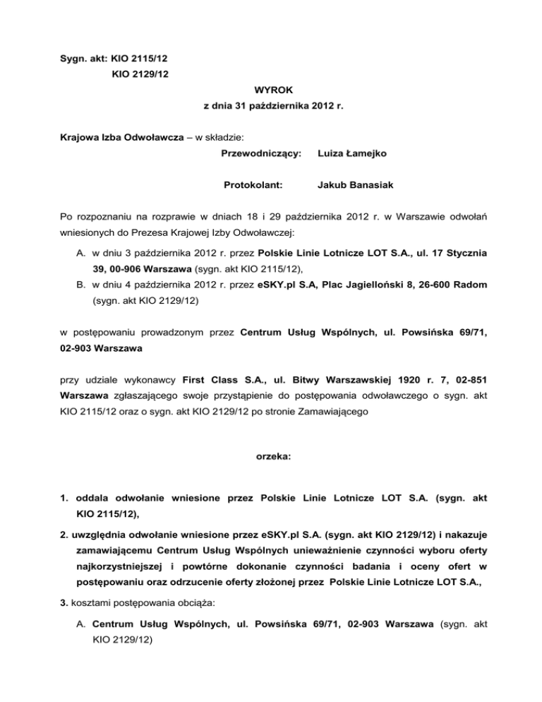 Sygn. akt: KIO 2115/12 KIO 2129/12 WYROK z dnia 31 października 2012 r. Krajowa Izba Odwoławcza – w składzie: Przewodniczący: Luiza Łamejko Protokolant: Jakub Banasiak Po rozpoznaniu na rozprawie w dniach 18 i 29 października 2012 r. w Warszawie odwołań wniesionych do Prezesa Krajowej Izby Odwoławczej: A. w dniu 3 października 2012 r. przez Polskie Linie Lotnicze LOT S.A., ul. 17 Stycznia 39, 00-906 Warszawa (sygn. akt KIO 2115/12), B. w dniu 4 października 2012 r. przez eSKY.pl S.A, Plac Jagielloński 8, 26-600 Radom (sygn. akt KIO 2129/12) w postępowaniu prowadzonym przez Centrum Usług Wspólnych, ul. Powsińska 69/71, 02-903 Warszawa przy udziale wykonawcy First Class S.A., ul. Bitwy Warszawskiej 1920 r. 7, 02-851 Warszawa zgłaszającego swoje przystąpienie do postępowania odwoławczego o sygn. akt KIO 2115/12 oraz o sygn. akt KIO 2129/12 po stronie Zamawiającego orzeka: 1. oddala odwołanie wniesione przez Polskie Linie Lotnicze LOT S.A. (sygn. akt KIO 2115/12), 2. uwzględnia odwołanie wniesione przez eSKY.pl S.A. (sygn. akt KIO 2129/12) i nakazuje zamawiającemu Centrum Usług Wspólnych unieważnienie czynności wyboru oferty najkorzystniejszej i powtórne dokonanie czynności badania i oceny ofert w postępowaniu oraz odrzucenie oferty złożonej przez Polskie Linie Lotnicze LOT S.A., 3. kosztami postępowania obciąża: A. Centrum Usług Wspólnych, ul. Powsińska 69/71, 02-903 Warszawa (sygn. akt KIO 2129/12) B. Polskie Linie Lotnicze LOT S.A., ul. 17 Stycznia 39, 00-906 Warszawa (sygn. akt KIO 2115/12) i : 3.1. zalicza w poczet kosztów postępowania odwoławczego kwotę 30 000 zł 00 gr (słownie: trzydzieści tysięcy złotych zero groszy) uiszczoną przez wykonawców Polskie Linie Lotnicze LOT S.A., ul. 17 Stycznia 39, 00-906 Warszawa oraz eSKY.pl S.A, Plac Jagielloński 8, 26-600 Radom tytułem wpisów od odwołań, 3.2. zasądza od wykonawcy Polskie Linie Lotnicze LOT S.A., ul. 17 Stycznia 39, 00-906 Warszawa na rzecz Centrum Usług Wspólnych, ul. Powsińska 69/71, 02-903 Warszawa kwotę 3 600 zł 00 gr (słownie: trzy tysiące sześćset złotych zero groszy) stanowiącą koszty postępowania odwoławczego poniesione z tytułu wynagrodzenia pełnomocnika, 3.3. zasądza od Centrum Usług Wspólnych, ul. Powsińska 69/71, 02-903 Warszawa na rzecz wykonawcy eSKY.pl S.A, Plac Jagielloński 8, 26-600 Radom kwotę 18 600 zł 00 gr (słownie: osiemnaście tysięcy sześćset złotych zero groszy) stanowiącą koszty postępowania odwoławczego poniesione z tytułu wpisu od odwołania oraz wynagrodzenia pełnomocnika. Stosownie do art. 198a i 198b ustawy z dnia 29 stycznia 2004 r. - Prawo zamówień publicznych (t.j. Dz. U. z 2010 r. 113, poz. 759 ze zm.) na niniejszy wyrok - w terminie 7 dni od dnia jego doręczenia - przysługuje skarga za pośrednictwem Prezesa Krajowej Izby Odwoławczej do Sądu Okręgowego w Warszawie. Przewodniczący: …………………… Sygn. akt: KIO 2115/12 KIO 2129/12 Uzasadnienie Centrum Usług Wspólnych (dalej: „zamawiający”) prowadzi w trybie przetargu nieograniczonego postępowanie o udzielenie zamówienia na zakup biletów lotniczych dla Jednostek Administracji Publicznej. Ogłoszenie o zamówieniu zostało opublikowane w Dzienniku Urzędowym Unii Europejskiej w dniu 28 lipca 2012 r. pod pozycją 2012/S 144-240562. Sprawa o sygn. akt KIO 2115/12: W postępowaniu tym wykonawca Polskie Linie Lotnicze LOT S.A. wniósł do Prezesa Krajowej Izby Odwoławczej odwołanie wobec czynności zamawiającego wyboru jako najkorzystniejszej oferty wykonawcy First Class S.A. zarzucając zamawiającemu naruszenie: - art. 24 ust. 2 pkt 3 i 4 ustawy Prawo zamówień publicznych (dalej: „ustawa Pzp”) przez zaniechanie wykluczenia z postępowania First Class S.A., która złożyła nieprawdziwe informacje mające wpływ na wynik postępowania i oraz nie wykazała spełnienia warunków udziału w postępowaniu, gdyż złożyła oświadczenie, że oferowane przez tego wykonawcę narzędzie rezerwacyjne online BTM zapewnia dostęp do 636 linii lotniczych, mimo że zadeklarowana liczba przewoźników lotniczych nie odpowiada faktycznej liczbie linii lotniczych dostępnych przez narzędzie BTM, oraz że spełnia istotne warunki zamówienia w zakresie istotnych postanowień umowy, tj. zapewnia możliwość zweryfikowania przez zamawiającego propozycji lotów, jeżeli zamawiający stwierdzi, że połączenie zaoferowane przez wykonawcę nie jest najkorzystniejsze, co jest nieprawdą, - art. 89 ust. 1 pkt 1 i 5 w zw. z art. 24 ust. 4 ustawy Pzp poprzez zaniechanie odrzucenia oferty złożonej przez wykonawcę podlegającego wykluczeniu z udziału w postępowaniu, - art. 89 ust. 1 pkt 2 i pkt 5 w zw. z art. 24 ust 4 ustawy Pzp poprzez zaniechanie odrzucenia oferty, która nie odpowiada treści specyfikacji istotnych warunków zamówienia w zakresie istotnych postanowień umowy i zaniechania odrzucenia oferty złożonej przez wykonawcę podlegającego wykluczeniu z udziału w postępowaniu. Polskie Linie Lotnicze LOT S.A. wniosła o: - uwzględnienie odwołania w całości, - unieważnienie najkorzystniejszej, decyzji zamawiającego o wyborze oferty First Class S.A. jako - powtórzenie czynności badania i oceny oferty First Class S.A. pod względem spełnienia wymogów ustawy Pzp oraz kryteriów zawartych w specyfikacji istotnych warunków zamówienia z uwzględnieniem wskazanych wyżej okoliczności, faktów i dokumentów, - odrzucenie oferty First Class S.A. jako niezgodnej z ustawą Pzp oraz treścią specyfikacji istotnych warunków zamówienia w zakresie istotnych postanowień umowy §2 pkt 16 Umowy, - powtórzenie czynności oceny ofert oraz wybór jako najkorzystniejszej oferty złożonej przez Polskie Linie Lotnicze LOT S.A., - przyznanie na rzecz Polskich Linii Lotniczych LOT S.A. kosztów postępowania przed Krajową Izbą Odwoławczą Ponadto, Polskie Linie Lotnicze LOT S.A. wniosła o: - zobowiązanie First Class S.A. do przedł
