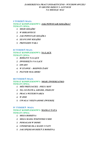 ZAMIERZENIA PRACY DYDAKTYCZNO - WYCHOWAWCZEJ W GRUPIE DZIECI 5- LETNICH NA MIESIĄC MAJ I TYDZIEŃ MAJA TEMAT KOMPLEKSOWY: JAK POWSTAJE KSIĄŻKA? TEMATY DNIA: 1. MOJE KSIĄŻKI 2. W BIBLIOTECE 3. JAK POWSTAJE KSIĄŻKA 4. SZANUJMY KSIĄŻKI 5. PRZYGODY PAKA II TYDZIEŃ MAJA TEMAT KOMPLEKSOWY: NA ŁĄCE TEMATY DNIA: 1. ROŚLINY NA ŁĄCE 2. ZWIERZĘTA NA ŁĄCE 3. OWADY 4. W STAWIE – ROZWÓJ ŻABY 5. PLENER MALARSKI III TYDZIEŃ MAJA TEMAT KOMPLEKSOWY: MOJE ZWIERZĄTKO TEMATY DNIA: 1. MÓJ PRZYJACIEL –PIES I KOT 2. TO, CO PŁYWA, GRYZIE, PISZCZY 3. PRACA WETERYNARZA 4. W ZOO 5. UWAGA! NIEZNAJOME ZWIERZĘ IV TYDZIEŃ MAJA TEMAT KOMPLEKSOWY: MAMA I TATA TEMATY DNIA: 1. MOJA RODZINA 2. MOJA MAMA WSZYSTKO UMIE 3. POMAGAM W DOMU 4. UPOMINKI DLA MAMY I TATY 5. JAK SPĘDZAM DZIEŃ Z RODZINĄ Cele główne: Rozwijanie koordynacji wzrokowo-ruchowo-słuchowej podczas zabaw ruchowych, plastycznych. Zachęcanie do prowadzenia obserwacji i wyciągania wniosków na ich podstawie. Kształcenie umiejętności uważnego słuchania utworów literackich. Uświadamianie, że dzielenie się może sprawiać radość wszystkim. Aktywne włączanie dzieci w przygotowania do rodzinnego święta. Umożliwienie wspólnej zabawy dzieciom i ich rodzicom; czerpanie radości ze wspólnej zabawy. Rozwijanie umiejętności różnicowania i nazywania kierunków w przestrzeni i na kartce. Poszerzanie czynnego słownika dziecka. Utrwalenie umiejętności dokonywania analizy i syntezy słuchowej wyrazów. Uświadomienie niebezpieczeństwa wynikającego ze spotkania z nieznajomym zwierzęciem. Poznanie funkcji instytucji niosących pomoc: weterynarz. Odbieranie otaczającego nas świat poprzez różne zmysły. Kształtowanie umiejętności sprawnego przeliczania w granicach możliwości dzieci. Wprowadzenie wzoru graficznego liczb 9, 0. Posługiwanie się w zabawach literami i cyframi. Kształcenie percepcji wzrokowej – odszukiwanie elementów na obrazku, układanie symboli (liter, cyfr) według wzoru i z pamięci – przygotowanie do czytania i pisania. Nauka piosenek i pląsów. Wdrażanie do udziału w zabawach muzyczno-rytmicznych przy piosenkach znanych dzieciom. Przewidziane osiągnięcia dzieci: a) Aktywność językowo - literacka i słuchowa: Na zadany temat wypowiada się w sposób logiczny, uzasadniając swoje zdanie lub wybór. Dokonuje porównania, np. sposobu powstawania książki dawniej i dziś. Posługuje się pojęciami: encyklopedia, czasopismo, album, księgarnia, biblioteka, łąka, weterynarz, łąka, owady, ssaki. Tworzy definicję na podstawie pojęcia, np. przy układaniu zagadek. Posługuje się przymiotnikami podczas określania osoby, przedmiotu, miejsca. Interesuje się książkami, czasopismami i chętnie z nich korzysta. Wyróżnia głoski ł, y w wygłosie, w śródgłosie i w nagłosie. Usprawnia aparat mowy w zabawach z zakresu gimnastyki buzi i języka. Usprawnia postrzeganie z zabawach z zakresu gimnastyki oka. Tworzy liczbę mnogą rzeczowników. Tworzy rodzaj żeński i męski przymiotników. Czyta globalnie wyrazy: komary, łapa. Rozpoznaje i nazywa litery: c, C, y Układa z rozsypanki literowej wyrazy według wzoru i z pamięci. Czyta proste teksty wyrazowo-obrazkowe. b) Aktywność społeczno - przyrodnicza: Aktywnie uczestniczy w zabawach tematycznych, np. w sklep. Ocenia zachowanie, sytuację, przedstawione na obrazku. Stosuje zasady właściwego obchodzenia się z książką. Obserwuje zachowanie owadów z wykorzystaniem lupy. Nazywa charakterystyczne zwierzęta i rośliny występujące na łące. Porządkuje obrazki przedstawiające rozwój żaby, motyla. Koncentruje się na zadaniu, poprawnie wykonuje polecenia N. Wyjaśnia zastosowanie różnorodnych urządzeń technicznych w domu. Rozumie konieczność codziennej opieki nad zwierzętami domowymi. Aktywność matematyczna: Posługuje się umownymi środkami płatniczymi podczas zabawy w sklep. Różnicuje i nazywa kierunki w przestrzeni i na kartce. Tworzy zbiory dziewięcioelementowe i zbiór pusty. Posługuje się liczebnikami głównymi i porządkowymi co najmniej w zakresie 10. Orientuje się na kartce papieru; wskazuje górę i dół, lewą i prawą stronę kartki. Mierzy odległości, długość za pomocą umownej miarki i porównuje otrzymane długości z zastosowaniem pojęć dłuższy, krótszy, bliżej, dalej. Doskonali umiejętność ilustrowania i rozwiązywania zadań z treścią. Planuje kolejne czynności, zadania przy organizowaniu przyjęcia dla rodziców. Posługuje się liczbami 0-9 do określania liczebności zbiorów. c) d) Aktywność plastyczno-techniczna i grafomotoryczna: Wykonuje prace plastyczne wykorzystaniem różnorodnych materiałów. Dokładnie koloruje obszar ograniczony linią. Kontroluje napięcie mięśniowe podczas kolorowania, rysowania, kreślenia po śladzie, itp. Koloruje obrazek według kodu. Wykonuje ciasteczka owsiane według przepisu z zachowaniem zasad higieny. Tworzy obraz przez dorysowywanie, doklejanie elementów do podanego kształtu, plamy, itp. Kreśli po śladzie i z pamięci ornamenty w ograniczonym polu, w liniaturze. Odwzorowuje według wzoru litery y, ł oraz cyfrę 0. e) Aktywność muzyczna: Realizuje rytm przedstawiony graficznie. Tańczy proste układy taneczne. Tworzy improwizacje ruchowe do muzyki klasycznej. Śpiewa piosenki indywidualnie przy akompaniamencie. f) Aktywność ruchowo – zdrowotna: Rozwija koordynację ruchową, dużą motorykę i umiejętność współpracy podczas zabaw ruchowych i ćwiczeń gimnastycznych. Doskonali umiejętność utrzymania równowagi podczas zabaw na ławeczce. Kontroluje własną aktywność ruchową podczas zabaw pobudzająco-hamujących. Sprawnie rzuca i chwyta piłkę. Rozumie niebezpieczeństwo płynące z włączania urządzeń elektrycznych przez dzieci. Zna zagrożenia płynące ze spotkania z dzikim, obcym zwierzęciem. Wie, jak należy dbać o swojego pupila. Potrafi przybrać bezpieczną pozycję, chroniącą pr
