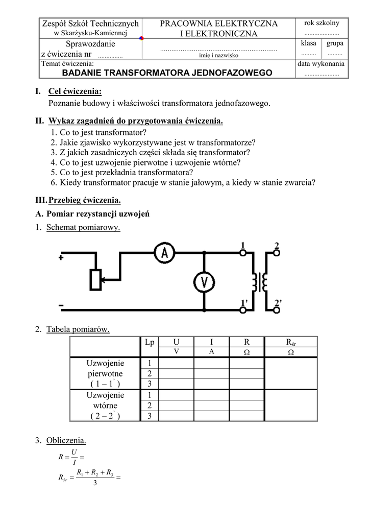 Zespół Szkół Technicznych rok szkolny PRACOWNIA ELEKTRYCZNA I ELEKTRONICZNA w Skarżysku-Kamiennej Sprawozdanie z ćwiczenia nr …………… ………………… ……………………………………………………… imię i nazwisko Temat ćwiczenia: klasa grupa ……… ……… data wykonania BADANIE TRANSFORMATORA JEDNOFAZOWEGO ………………… I. Cel ćwiczenia: Poznanie budowy i właściwości transformatora jednofazowego. II. Wykaz zagadnień do przygotowania ćwiczenia. 1. Co to jest transformator? 2. Jakie zjawisko wykorzystywane jest w transformatorze? 3. Z jakich zasadniczych części składa się transformator? 4. Co to jest uzwojenie pierwotne i uzwojenie wtórne? 5. Co to jest przekładnia transformatora? 6. Kiedy transformator pracuje w stanie jałowym, a kiedy w stanie zwarcia? III. Przebieg ćwiczenia. A. Pomiar rezystancji uzwojeń 1. Schemat pomiarowy. 2. Tabela pomiarów. Lp Uzwojenie pierwotne ( 1 – 1’ ) Uzwojenie wtórne ( 2 – 2’ ) 3. Obliczenia. R Rśr U I R1 R2 3 R3 1 2 3 1 2 3 U I V A R Rśr Badanie transformatora jednofazowego strona 2 z 7 B. Pomiar rezystancji izolacji 1. Schemat pomiarowy. Stosunek wartości rezystancji R60 po 60 s trwania pomiaru do wartości rezystancji R15 po 15 s, nazywa się współczynnikiem absorpcji i umożliwia ocenę stopnia zawilgocenia izolacji. 2. Tabela pomiarów. R15 R60 M M R60 R15 — Uzwojenie pierwotne – rdzeń Uzwojenie wtórne – rdzeń Uzwojenie pierwotne – uzwojenie wtórne 3. Obliczenia. R60 R15 C. Wyznaczanie przekładni transformatora W czasie pomiarów napięcie U1 nie powinno przekraczać wartości napięcia znamionowego. 1. Schemat pomiarowy. Badanie transformatora jednofazowego 2. Tabela pomiarów. Lp strona 3 z 7 U1 U2 V V śr — — 1 2 3 3. Obliczenia. U1 U2 1 śr 2 3 3 D. Próba stanu jałowego Nastawiając za pomocą autotransformatora wartość napięcia U1 od 1,1 U1n do 0,3 U1n, odczytywać wskazania mierników; wyniki zanotować w tabeli. U1n – napięcie znamionowe strony pierwotnej transformatora. 1. Schemat pomiarowy. 2. Tabela pomiarów. Lp U1 V 1 2 3 4 5 6 7 8 9 10 I0 PFe A W cos – 0 Q I IFe var A A Badanie transformatora jednofazowego strona 4 z 7 3. Obliczenia. cos 0 0 PFe U1 I 0 arc cos (cos Q PFe tg I I 0 sin I Fe I 0 cos 0 ) 0 0 0 4. Wykreślić charakterystyki transformatora w stanie jałowym. a) Straty w rdzeniu w funkcji napięcia zasilania – b) Prąd w stanie jałowym w funkcji napięcia zasilania – c) Moc bierna w funkcji napięcia zasilania – PFe=f(U1) I0=f(U1) Q=f(U1) Badanie transformatora jednofazowego strona 5 z 7 E. Próba zwarcia pomiarowego Nastawiając za pomocą autotransformatora wartość prądu I2 od 1,1 I2n do 0,3 I2n, odczytywać wskazania mierników; wyniki zanotować w tabeli. I2n – prąd znamionowy strony wtórnej transformatora. 1. Schemat pomiarowy. 2. Tabela pomiarów. Lp U I1 V A Pz W I2 cos A – z 1 2 3 4 5 6 3. Obliczenia. cos z Pz Uz Iz 4. Wykreślić charakterystyki transformatora w stanie zwarcia a) Straty w uzwojeniu w funkcji napięcia zasilania – b) Prąd zwarcia w funkcji napięcia zasilania – c) Współczynnik mocy w funkcji napięcia zasilania – Pz=f(U1) Iz=f(U1) cos z =f(U1) Badanie transformatora jednofazowego strona 6 z 7 F. Badanie transformatora obciążonego Regulując za pomocą rezystora Robc wartość prądu I2 od 1,1 I2n do 0,3 I2n, odczytywać wskazania mierników; wyniki zanotować w tabeli. I2n – prąd znamionowy strony wtórnej transformatora. 1. Schemat pomiarowy. 2. Tabela pomiarów. Lp I2 U2 P2 P1 A V W W % 1 2 3 4 5 6 7 8 9 10 3. Obliczenia. P2 100 % P1 4. Wykreślić charakterystyki transformatora w stanie obciążenia. a) Charakterystyka zewnętrzna – U2=f(I2) b) Sprawność w funkcji prądu obciążenia – =f(I2) Badanie transformatora jednofazowego strona 7 z 7 IV. Wykaz przyrządów. 1. Woltomierz ME kl. …… 2. Amperomierz ME kl. …… 3. Woltomierz EM kl. …… 4. Woltomierz EM kl. …… 5. Amperomierz EM kl. …… 6. Amperomierz EM kl. …… 7. Watomierz FD kl. …… 8. Watomierz FD kl. …… 9. Autotransformator …… 10. Rezystor suwakowy …… 11. … V. Wykaz zagadnień do opracowania ćwiczenia. 1. Jaką rezystancję ma uzwojenie pierwotne w porównaniu z rezystancją uzwojenia wtórnego? 2. Jaką rezystancję między uzwojeniem pierwotnym a uzwojeniem wtórnym powinien posiadać transformator? 3. Jaka powinna być rezystancja między uzwojeniami a rdzeniem transformatora? 4. Od czego zależy przekładnia transformatora? 5. Od czego zależy napięcie indukowane w uzwojeniu wtórnym? 6. Co to jest napięcie zwarcia? 7. Jaką sprawność ma maszyna elektryczna zwana transformatorem? 8. Jak wpływa wartość prądu obciążenia na napięcie wyjściowe transformatora? 9. Jak wpływa wartość prądu obciążenia na sprawność transformatora? VI. Spostrzeżenia i wnioski: