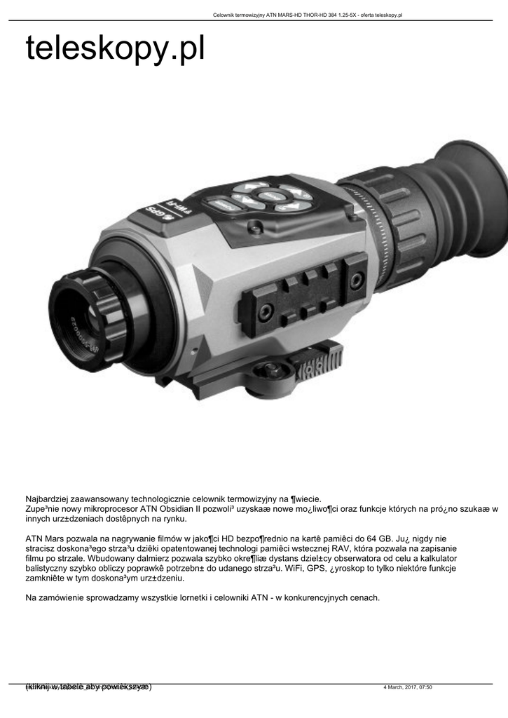 Celownik termowizyjny ATN MARS-HD THOR-HD 384 1.25-5X - oferta teleskopy.pl teleskopy.pl Najbardziej zaawansowany technologicznie celownik termowizyjny na ¶wiecie. Zupe³nie nowy mikroprocesor ATN Obsidian II pozwoli³ uzyskaæ nowe mo¿liwo¶ci oraz funkcje których na pró¿no szukaæ w innych urz±dzeniach dostêpnych na rynku. ATN Mars pozwala na nagrywanie filmów w jako¶ci HD bezpo¶rednio na kartê pamiêci do 64 GB. Ju¿ nigdy nie stracisz doskona³ego strza³u dziêki opatentowanej technologi pamiêci wstecznej RAV, która pozwala na zapisanie filmu po strzale. Wbudowany dalmierz pozwala szybko okre¶liæ dystans dziel±cy obserwatora od celu a kalkulator balistyczny szybko obliczy poprawkê potrzebn± do udanego strza³u. WiFi, GPS, ¿yroskop to tylko niektóre funkcje zamkniête w tym doskona³ym urz±dzeniu. Na zamówienie sprowadzamy wszystkie lornetki i celowniki ATN - w konkurencyjnych cenach. (kliknij w tabelê aby powiêkszyæ) http://teleskopy.pl/product_info.php?products_id=4283 4 March, 2017, 07:50 Celownik termowizyjny ATN MARS-HD THOR-HD 384 1.25-5X - oferta teleskopy.pl Gwarancja 3 lata >> CZÊSTO ZADAWANE PYTANIA << Pytanie: Czym ró¿ni siê noktowizor od termowizora? Odpowied¼: Noktowizor wzmacnia ¶wiat³o widzialne (380 - 780 nm) oraz nieco bliskiej podczerwieni. Termowizor jest czu³y na fale elektromagnetyczne o wiêkszej d³ugo¶ci, rzêdu kilku - kilkunastu µm, czyli o kilkadziesi±t razy wiêkszej d³ugo¶ci. Fale E-M, na które czu³y jest typowy termowizor, odpowiadaj± promieniowaniu termicznemu (cieplnemu). Noktowizor wymaga ¶wiat³a, które mo¿e wzmocniæ (dlatego w pe³nej ciemno¶ci potrzebujemy promienników IR), termowizor dzia³a równie¿ w ca³kowitej ciemno¶ci, w mgle, dymie itp. Przewag± noktowizji, poza zwyczajnie innym obrazowaniem i w zwi±zku z tym innym postrzeganiem detali, jest wy¿sza rozdzielczo¶æ i ni¿sza cena. Walorem termowizji jest praca w ka¿dych warunkach i ³atwo¶æ detekcji ¼róde³ ciep³a, co ma fundamentalne znaczenie w ratownictwie, a jest przydatne m.in. ³owiectwie, ochronie mienia, w nawigacji morskiej, w obserwacjach przyrodniczych. http://teleskopy.pl/product_info.php?products_id=4283 4 March, 2017, 07:50