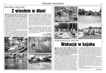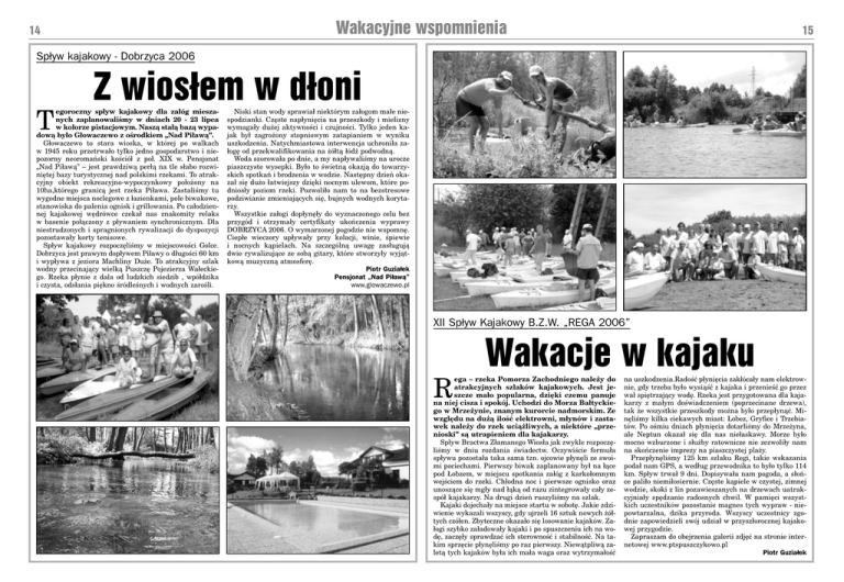 Wakacyjne wspomnienia 14 15 Sp³yw kajakowy - Dobrzyca 2006 T Z wios³em w d³oni egoroczny sp³yw kajakowy dla za³óg mieszanych zaplanowalimy w dniach 20 - 23 lipca w kolorze pistacjowym. Nasz¹ sta³¹ baz¹ wypadow¹ by³o G³owaczewo z orodkiem Nad Pi³aw¹. G³owaczewo to stara wioska, w której po walkach w 1945 roku przetrwa³o tylko jedno gospodarstwo i niepozorny neoromañski koció³ z po³. XIX w. Pensjonat Nad Pi³aw¹ jest prawdziw¹ per³¹ na tle s³abo rozwiniêtej bazy turystycznej nad polskimi rzekami. To atrakcyjny obiekt rekreacyjno-wypoczynkowy po³o¿ony na 10ha,którego granic¹ jest rzeka Pi³awa. Zastalimy tu wygodne miejsca noclegowe z ³azienkami, pole biwakowe, stanowiska do palenia ognisk i grillowania. Po ca³odziennej kajakowej wêdrówce czeka³ nas znakomity relaks w basenie po³¹czony z p³ywaniem synchronicznym. Dla niestrudzonych i spragnionych rywalizacji do dyspozycji pozostawa³y korty tenisowe. Sp³yw kajakowy rozpoczêlimy w miejscowoci Golce. Dobrzyca jest prawym dop³ywem Pi³awy o d³ugoci 60 km i wyp³ywa z jeziora Machliny Du¿e. To atrakcyjny szlak wodny przecinaj¹cy wielk¹ Puszczê Pojezierza Wa³eckiego. Rzeka p³ynie z dala od ludzkich siedzib , wpó³dzika i czysta, ods³ania piêkno ródlenych i wodnych zaroli. Niski stan wody sprawia³ niektórym za³ogom ma³e niespodzianki. Czêste nap³yniêcia na przeszkody i mielizny wymaga³y du¿ej aktywnoci i czujnoci. Tylko jeden kajak by³ zagro¿ony stopniowym zatapianiem w wyniku uszkodzenia. Natychmiastowa interwencja uchroni³a za³ogê od przekwalifikowania na ¿ó³t¹ ³ód podwodn¹. Woda szorowa³a po dnie, a my nap³ywalimy na urocze piaszczyste wysepki. By³o to wietn¹ okazj¹ do towarzyskich spotkañ i brodzenia w wodzie. Nastêpny dzieñ okaza³ siê du¿o ³atwiejszy dziêki nocnym ulewom, które podnios³y poziom rzeki. Pozwoli³o nam to na bezstresowe podziwianie zmieniaj¹cych siê, bujnych wodnych korytarzy. Wszystkie za³ogi dop³ynê³y do wyznaczonego celu bez przygód i otrzyma³y certyfikaty ukoñczenia wyprawy DOBRZYCA 2006. O wymarzonej pogodzie nie wspomnê. Ciep³e wieczory up³ywa³y przy kolacji, winie, piewie i nocnych k¹pielach. Na szczególn¹ uwagê zas³uguj¹ dwie rywalizuj¹ce ze sob¹ gitary, które stworzy³y wyj¹tkow¹ muzyczn¹ atmosferê. Piotr Guzia³ek Pensjonat Nad Pi³aw¹ www.glowaczewo.pl XII Sp³yw Kajakowy B.Z.W. REGA 2006 R Wakacje w kajaku ega rzeka Pomorza Zachodniego nale¿y do atrakcyjnych szlaków kajakowych. Jest jeszcze ma³o popularna, dziêki czemu panuje na niej cisza i spokój. Uchodzi do Morza Ba³tyckiego w Mrze¿ynie, znanym kurorcie nadmorskim. Ze wzglêdu na du¿¹ iloæ elektrowni, m³ynów i zastawek nale¿y do rzek uci¹¿liwych, a niektóre przenioski s¹ utrapieniem dla kajakarzy. Sp³yw Bractwa Z³amanego Wios³a jak zwykle rozpoczêlimy w dniu rozdania wiadectw. Oczywicie formu³a sp³ywu pozosta³a taka sama tzn. ojcowie p³ynêli ze swoimi pociechami. Pierwszy biwak zaplanowany by³ na ³¹ce pod £obzem, w miejscu spotkania za³óg z karko³omnym wejciem do rzeki. Ch³odna noc i pierwsze ognisko oraz unosz¹ce siê mg³y nad ³¹k¹ od razu zintegrowa³y ca³y zespó³ kajakarzy. Na drugi dzieñ ruszylimy na szlak. Kajaki dojecha³y na miejsce startu w sobotê. Jakie zdziwienie wykazali wszyscy, gdy ujrzeli 16 sztuk nowych ¿ó³tych czó³en. Zbyteczne okaza³o siê losowanie kajaków. Za³ogi szybko za³adowa³y kajaki i po spuszczeniu ich na wodê, zaczê³y sprawdzaæ ich sterownoæ i stabilnoæ. Na takim sprzêcie p³ynêlimy po raz pierwszy. Niew¹tpliw¹ zalet¹ tych kajaków by³a ich ma³a waga oraz wytrzyma³oæ na uszkodzenia.Radoæ p³yniêcia zak³óca³y nam elektrownie, gdy trzeba by³o wysi¹æ z kajaka i przenieæ go przez wa³ spiêtrzaj¹cy wodê. Rzeka jest przygotowana dla kajakarzy z ma³ym dowiadczeniem (poprzecinane drzewa), tak ¿e wszystkie przeszkody mo¿na by³o przep³yn¹æ. Minêlimy kilka ciekawych miast: £obez, Gryfice i Trzebiatów. Po omiu dniach p³yniêcia dotarlimy do Mrze¿yna, ale Neptun okaza³ siê dla nas nie³askawy. Morze by³o mocno wzburzone i s³u¿by ratownicze nie zezwoli³y nam na skoñczenie imprezy na piaszczystej pla¿y. Przep³ynêlimy 125 km szlaku Regi, takie wskazania poda³ nam GPS, a wed³ug przewodnika to by³o tylko 114 km. Sp³yw trwa³ 9 dni. Dopisywa³a nam pogoda, a s³oñce pali³o niemi³osiernie. Czêste k¹piele w czystej, zimnej wodzie, skoki z lin pozawieszanych na drzewach uatrakcyjnia³y spêdzanie radosnych chwil. W pamiêci wszystkich uczestników pozostanie magnes tych wypraw - niepowtarzalna, dzika przyroda. Wszyscy uczestnicy zgodnie zapowiedzieli swój udzia³ w przysz³orocznej kajakowej przygodzie. Zapraszam do obejrzenia galerii zdjêæ na stronie internetowej www.ptspuszczykowo.pl Piotr Guzia³ek