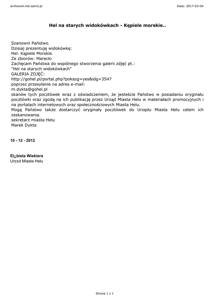 archiwum.hel.sam3.pl Data: 2017-03-04 Hel na starych widokówkach - Kępiele morskie.. Szanowni Państwo. Dzisiaj prezentuję widokówkę: Hel. Kąpiele Morskie. Ze zbiorów: Marecki Zachęcam Państwa do wspólnego stworzenia galerii zdjęć pt.: "Hel na starych widokówkach" GALERIA ZDJĘĆ: http://gohel.pl/portal.php?pokazg=yes&idg=3547 poprzez przesyłanie na adres e-mail: [email protected] skanów tych pocztówek wraz z oświadczeniem, że jesteście Państwo w posiadaniu oryginału pocztówki oraz zgodą na ich publikację przez Urząd Miasta Helu w materiałach promocyjnych i na portalach internetowych oraz społecznościowych Miasta Helu. Mogą Państwo także dostarczyć oryginały pocztówek do Urzędu Miasta Helu celem ich zeskanowania. sekretarz miasta Helu Marek Dykta 10 - 12 - 2012 El¿bieta Wiekiera Urz±d Miasta Helu Strona 1 z 1