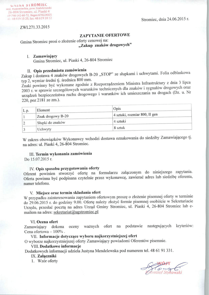 UiWilMA alKOMltC wo| mazowieckie, pow. hiatnbrzeski 26-804 Strotniec, ul. Piaski 4 W8-142-60-72, Regon:670224025 , 19 10 20. fax:48 619 10 12 Stromiec, dnia 24.06.2015 r. ZWI.271.33.2015 ZAPYTANIE OFERTOWE Gmina Stromiec prosi o ziozenie oferty cenowej na: „Zakup znakow drogowych I. Zamawiajacy Gmina Stromiec, ul. Piaski 4,26-804 Stromiec II. Opis przedmiotu zamowienia ,...„, Zakup idostawa 4znakow drogowych B-20 „STOP" ze slupkami , uchwytam.. Folia odblaskowa tvn 2 wvmiar sredni ti. srednica 800 mm. •>!•«„„ Znaki^winny bye wykonane zgodnie zRozporzadzeniem Ministra Infrastruktury zdn.a 3l.pca 2003 r wsprawie szczegoiowych warunkow technicznych dla znakow isygnalow drogowych on* urzadzen bezpieczehstwa ruchu drogowego i warunkow ich umieszczama na drogach (Dz. u. Nr 220, poz 2181 zezm.). Lp. Element Opis Znak drogowy B-20 4 sztuki, rozmiar 800,11 gen Slupki do znakow 4 sztuki Uchwyty 8 sztuk Wzakres obowiazkow Wykonawcy wchodzi dostawa oznakowania do siedziby Zamawiaj^cego tj. na adres: ul. Piaski 4,26-804 Stromiec. III. Termin wykonania zamowienia Do 15.07.2015 r. IV. Opis sposobu przygotowania oferty Oferent powinien stworzyc oferte na formularzu zataczonym do niniejszego zapytania. Oferta powinna bye podpisana czytelnie przez wykonawce, zawierac adres lub siedzibe oferenta, numer telefonu. V. Miejsce oraz termin skladania ofert Wprzypadku zainteresowania zapytaniem ofertowym prosze oziozenie pisemnej oferty wternunie do 29.06.2015 r. do godziny 9.00. Oferte nalezy zlozyc formie pisemnej osobiscie w Sekretariacie Urzedu, przeslac poczta. na adres Urz^d Gminy Stromiec, ul. Piaski 4, 26-804 Stromiec lub e- mailem na adres: [email protected] VI. Ocena ofert Zamawiajacy dokona oceny waznych ofert na podstawie nastepuj^cych kryteriow: Cena ofertowa - 100% . VII. Informacje dotycz^ce wyboru najkorzystniejszej ofert O wyborze najkorzystniejszej oferty Zamawiajqcy powiadomi Oferentow pisemnie. VIII. Dodatkowe informacje Dodatkowych informacji udziela Justyna Mendelewska pod numerem tel. 48 61 91 331. IX. Zalqczniki 1. Wzor oferty Nazwa i adres wykonawcy /pieczec wykonawcy/ OFERTA na: „Zakup znakow drogowych" 1. Oferujemy realizacje zamowienia zgodnie z dolaczona tabela; Koszt w zt netto Opis LP- Element 1 Znak drogowy B-20 4 sztuki, rozmiar 800, II gen 2 Sfupki do znak6w 4 sztuki 3 Uchwyty 8 sztuk Koszt w zt brutto SUMA Slownie (brutto). 2. Termin wykonania: do 15.07.2015r. 3. Warunki platnosci: w ciagu 14 dni od daty wprywu faktury do siedziby Zamawiajacego. 4. Oswiadczam, ze zapoznalem sie ze wszystkimi warunkami zawartymi w zapytaniu ofertowym. Data,podpis i pieczec wykonawcy