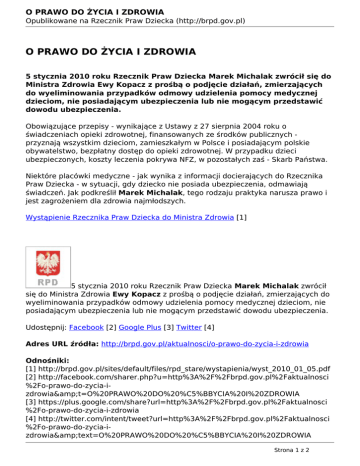 O PRAWO DO ŻYCIA I ZDROWIA Opublikowane na Rzecznik Praw Dziecka (http://brpd.gov.pl) O PRAWO DO ŻYCIA I ZDROWIA 5 stycznia 2010 roku Rzecznik Praw Dziecka Marek Michalak zwrócił się do Ministra Zdrowia Ewy Kopacz z prośbą o podjęcie działań, zmierzających do wyeliminowania przypadków odmowy udzielenia pomocy medycznej dzieciom, nie posiadającym ubezpieczenia lub nie mogącym przedstawić dowodu ubezpieczenia. Obowiązujące przepisy - wynikające z Ustawy z 27 sierpnia 2004 roku o świadczeniach opieki zdrowotnej, finansowanych ze środków publicznych przyznają wszystkim dzieciom, zamieszkałym w Polsce i posiadającym polskie obywatelstwo, bezpłatny dostęp do opieki zdrowotnej. W przypadku dzieci ubezpieczonych, koszty leczenia pokrywa NFZ, w pozostałych zaś - Skarb Państwa. Niektóre placówki medyczne - jak wynika z informacji docierających do Rzecznika Praw Dziecka - w sytuacji, gdy dziecko nie posiada ubezpieczenia, odmawiają świadczeń. Jak podkreślił Marek Michalak, tego rodzaju praktyka narusza prawo i jest zagrożeniem dla zdrowia najmłodszych. Wystąpienie Rzecznika Praw Dziecka do Ministra Zdrowia [1] 5 stycznia 2010 roku Rzecznik Praw Dziecka Marek Michalak zwrócił się do Ministra Zdrowia Ewy Kopacz z prośbą o podjęcie działań, zmierzających do wyeliminowania przypadków odmowy udzielenia pomocy medycznej dzieciom, nie posiadającym ubezpieczenia lub nie mogącym przedstawić dowodu ubezpieczenia. Udostępnij: Facebook [2] Google Plus [3] Twitter [4] Adres URL źródła: http://brpd.gov.pl/aktualnosci/o-prawo-do-zycia-i-zdrowia Odnośniki: [1] http://brpd.gov.pl/sites/default/files/rpd_stare/wystapienia/wyst_2010_01_05.pdf [2] http://facebook.com/sharer.php?u=http%3A%2F%2Fbrpd.gov.pl%2Faktualnosci %2Fo-prawo-do-zycia-izdrowia&t=O%20PRAWO%20DO%20%C5%BBYCIA%20I%20ZDROWIA [3] https://plus.google.com/share?url=http%3A%2F%2Fbrpd.gov.pl%2Faktualnosci %2Fo-prawo-do-zycia-i-zdrowia [4] http://twitter.com/intent/tweet?url=http%3A%2F%2Fbrpd.gov.pl%2Faktualnosci %2Fo-prawo-do-zycia-izdrowia&text=O%20PRAWO%20DO%20%C5%BBYCIA%20I%20ZDROWIA Strona 1 z 2 O PRAWO DO ŻYCIA I ZDROWIA Opublikowane na Rzecznik Praw Dziecka (http://brpd.gov.pl) Strona 2 z 2