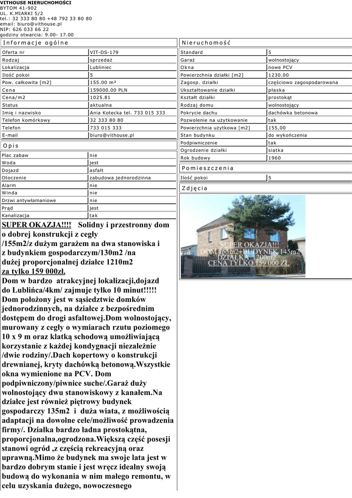 VITHOUSE NIERUCHOMOŚCI BYTOM 41-902 UL. K.MIARKI 5/2 tel.: 32 333 80 80 +48 792 33 80 80 email: [email protected] NIP: 626 033 66 22 godziny otwarcia: 9.00- 17.00 Informacje ogólne Nieruchomość Oferta nr VIT-DS-179 Standard 5 Rodzaj sprzedaż Garaż wolnostojący Lokalizacja Lubliniec Okna nowe PCV Ilość pokoi 5 Powierzchnia działki [m2] 1230.00 Pow. całkowita [m2] 155.00 m² Zagosp. działki częściowo zagospodarowana Cena 159000.00 PLN Ukształtowanie działki płaska Cena/m2 1025.81 Kształt działki prostokąt Status aktualna Rodzaj domu wolnostojący Imię i nazwisko Ania Kotecka tel. 733 015 333 Pokrycie dachu dachówka betonowa Telefon komórkowy 32 333 80 80 Pozwolenie na użytkowanie tak Telefon 733 015 333 Powierzchnia użytkowa [m2] 155,00 E-mail [email protected] Stan budynku do wykończenia Podpiwniczenie tak Ogrodzenie działki siatka Rok budowy 1960 Opis Plac zabaw nie Woda jest Dojazd asfalt Pomieszczenia Otoczenie zabudowa jednorodzinna Ilość pokoi Alarm nie Winda nie Drzwi antywłamaniowe nie Prąd jest Kanalizacja tak SUPER OKAZJA!!!! Solidny i przestronny dom o dobrej konstrukcji z cegły /155m2/z dużym garażem na dwa stanowiska i z budynkiem gospodarczym/130m2 /na dużej proporcjonalnej działce 1210m2 za tylko 159 000zł. Dom w bardzo atrakcyjnej lokalizacji,dojazd do Lublińca/4km/ zajmuje tylko 10 minut!!!!! Dom położony jest w sąsiedztwie domków jednorodzinnych, na działce z bezpośrednim dostępem do drogi asfaltowej.Dom wolnostojący, murowany z cegły o wymiarach rzutu poziomego 10 x 9 m oraz klatką schodową umożliwiającą korzystanie z każdej kondygnacji niezależnie /dwie rodziny/.Dach kopertowy o konstrukcji drewnianej, kryty dachówką betonową.Wszystkie okna wymienione na PCV. Dom podpiwniczony/piwnice suche/.Garaż duży wolnostojący dwu stanowiskowy z kanałem.Na działce jest również piętrowy budynek gospodarczy 135m2 i duża wiata, z możliwością adaptacji na dowolne cele/możliwość prowadzenia firmy/. Działka bardzo ładna prostokątna, proporcjonalna,ogrodzona.Większą część posesji stanowi ogród ,z częścią rekreacyjną oraz uprawną.Mimo że budynek ma swoje lata jest w bardzo dobrym stanie i jest wręcz idealny swoją budową do wykonania w nim małego remontu, w celu uzyskania dużego, nowoczesnego Zdjęcia 5 ,reprezentacyjnego domu rodzinnego lub przedstawicielstwa firmy. Bardzo dobry dojazd do głównej drogi do Tarnowskich Gór, Pyskowic, Olesna , Strzelec Opolskich , Opola, Częstochowy. Dom składa się z trzech kondygnacji: parter, I piętro oraz strych. Wysoki parter: 2 pokoje , kuchnia, przedpokój, łazienka z WC; pow. użytkowa ok. 80 m2. I piętro: 3 pokoje, przedpokój, łazienka z WC; pow. użytkowa ok. 75 m2 Piwnice są suche i można je zaadaptować na kotłownię, pralnię ,spiżarnię lub mały podręczny warsztat. Budynek o zdrowej solidnej konstrukcji , nadający się idealnie do remontu, do zaadoptowania według własnych potrzeb. POLECAM!!!!!!! GWARANTUJEMY: pomoc i profesjonalizm ,bezpieczeństwo transakcji, oferujemy bezpłatną fachową i bezpłatną pomoc przy uzyskaniu najkorzystniejszego kredytu hipotecznego, pomoc u notariusza , jesteśmy również ubezpieczeni od odpowiedzialności cywilnej w zakresie obrotu nieruchomościami. Powyższa oferta ma charakter informacyjny i nie stanowi oferty handlowej w rozumieniu przepisów KC. BARDZO ATRAKCYJNA OFERTA POLECAMY!!!!! Zapraszam na prezentację! www VITHOUSE.PL 733 015 333 Pośrednik odpowiedzialny zawodowo za wykonanie umowy pośrednictwa: Witold Kubacki tel.733 015 333 -oferta na wyłączność. Powyższa oferta ma charakter informacyjny i nie stanowi oferty handlowej w rozumieniu przepisów KC. VITHOUSE NIERUCHOMOŚCI BYTOM 41-902 UL. K.MIARKI 5/2 tel.: 32 333 80 80 +48 792 33 80 80 email: [email protected] NIP: 626 033 66 22 godziny otwarcia: 9.00- 17.00