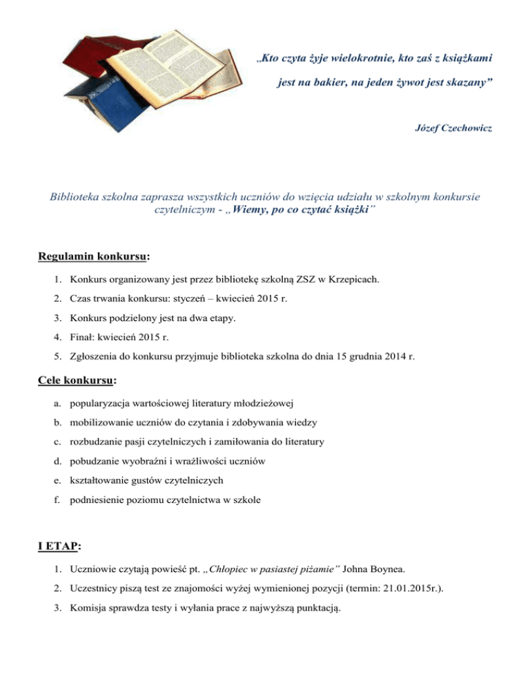 „Kto czyta żyje wielokrotnie, kto zaś z książkami jest na bakier, na jeden żywot jest skazany” Józef Czechowicz Biblioteka szkolna zaprasza wszystkich uczniów do wzięcia udziału w szkolnym konkursie czytelniczym - „Wiemy, po co czytać książki” Regulamin konkursu: 1. Konkurs organizowany jest przez bibliotekę szkolną ZSZ w Krzepicach. 2. Czas trwania konkursu: styczeń – kwiecień 2015 r. 3. Konkurs podzielony jest na dwa etapy. 4. Finał: kwiecień 2015 r. 5. Zgłoszenia do konkursu przyjmuje biblioteka szkolna do dnia 15 grudnia 2014 r. Cele konkursu: a. popularyzacja wartościowej literatury młodzieżowej b. mobilizowanie uczniów do czytania i zdobywania wiedzy c. rozbudzanie pasji czytelniczych i zamiłowania do literatury d. pobudzanie wyobraźni i wrażliwości uczniów e. kształtowanie gustów czytelniczych f. podniesienie poziomu czytelnictwa w szkole I ETAP: 1. Uczniowie czytają powieść pt. „Chłopiec w pasiastej piżamie” Johna Boynea. 2. Uczestnicy piszą test ze znajomości wyżej wymienionej pozycji (termin: 21.01.2015r.). 3. Komisja sprawdza testy i wyłania prace z najwyższą punktacją. II ETAP: 1. W Etapie II biorą udział uczestnicy, którzy zdobyli najwyższą ilość punktów w Etapie I. 2. Uczniowie czytają książkę pt. „Zaliczenie z tragedii” Elizabeth Laban. 3. Uczestnicy piszą test ze znajomości powieści (termin: 08.04.2015 r.). 4. Komisja sprawdza testy i przydziela punkty. 5. I miejsce zajmuje uczestnik, który z obu testów, po zsumowaniu, uzyska najwyższą ilość punktów. 6. Za I miejsce przyznana zostanie nagroda książkowa. 7. Organizatorzy konkursu zastrzegają sobie prawo do zmian w regulaminie. Organizatorzy: Marta Kałwak Teresa Kuc