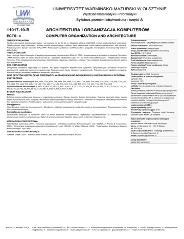 UNIWERSYTET WARMIŃSKO-MAZURSKI W OLSZTYNIE Wydział Matematyki i Informatyki Sylabus przedmiotu/modułu - część A 11017-10-B ARCHITEKTURA I ORGANIZACJA KOMPUTERÓW ECTS: 4 COMPUTER ORGANIZATION AND ARCHITECTURE TREŚCI WYKŁADÓW Struktura komputera jednoprocesorowego i jej ewolucja od lat 60 XX w. Magistrala główna, UNICODE, moduły wejścia/wyjścia, przerwania. Układy cyfrowe, mapy Karnaugha. Budowa modelu programowego - rejestry, tryby adresowania, model operacji warunkowych, lista instrukcji. Przechowywanie danych wewnątrz CPU, RPN. Przetwarzanie potokowe, konflikt zasobów, przypadki równoległości. Konwencje Big-Endian i Little-Endian. TREŚCI ĆWICZEŃ Kody Haminga. Mapy Karnaugha. Przegląd programowania mikrokontrolera DSM-51. RPN – programowanie w architekturze stosowej. Symulator „RAM Machine 2006’ ze strony www.ii.uni.wroc.pl . Symulator „Multimedia Logic 1.4” ze strony www.softtronix.com . Projektowanie formatu rozkazów. Tryby adresowania natychmiastowe, bezpośrednie, rejestrowe, indeksowe, stosowe. Typy rozkazów do przenoszenia danych, jedno i dwu argumentowe. CEL KSZTAŁCENIA Umiejetność udzielenia odpowiedzi na pytanie: Jak działa komputer? Klasyfikowanie systemów komputerowych. Określanie możliwości powiększenia wydajności systemu komputerowego. Rozpoznawanie typów rozkazów komputerowych. Poznanie zasady działania komputera, poznanie metod i sposobów zwiększania wydajności komputera. OPIS EFEKTÓW KSZTAŁCENIA PRZEDMIOTU W ODNIESIENIU DO OBSZAROWYCH I KIERUNKOWYCH EFEKTÓW KSZTAŁCENIA Symbole efektów obszarowych T1A_W01, T1A_W03, T1A_W04, T1A_W05, T1A_W07, T1A_W08, T1A_W09, T1A_W10, T1A_U02, T1A_U03, T1A_U04, T1A_U05, T1A_U06, T1A_U07, T1A_U09, T1A_U10, T1A_U14, T1A_U15, T1A_U16, T1A_K01, T1A_K03, T1A_K05 Symbole efektów kierunkowych K_W07, K_W03, K_W03, K_W07, K_W11, K_W12, KU_01, KU_06, KU_09, KU_13, KU_18, KU_22, KU_23, KU_25, KU_27, KU_30, KU_33, KU_34, K_K01, K_K02, K_K03, K_K04, K_K06 EFEKTY KSZTAŁCENIA Wiedza Definiuje pojęcia podstawowe związane z organizacja komputera. Opisuje elementy budowy komputerów. Rozumie parametry czasu trwania zadań wykonywanych przez komputer. Rozumienie logiczne powiązania między elementami i zadaniami w komputerze. Identyfikuje elementarne typy zasobów komputera. Potrafi wyjasnić i wytłumaczyć przeznaczenie systemu komputerowego. Umiejętności Klasyfikowanie systemów komputerowych. Określanie możliwości powiększenia wydajności systemu komputerowego. Rozpoznawanie typów rozkazów komputerowych. Kompetencje społeczne Zachowywać krytycyzm w wyrażaniu opinii na temat systemów komputerowych. Wykazywać odpowiedzialność za niezawodną pracę powierzonego systemu komputerowego. Dążyć do zrozumienia zasad działania najnowszych systemów komputerowych. LITERATURA PODSTAWOWA 1) Linda Null, Julia Lobur, 2004r., "Struktura organizacyjna i architektura systemów komputerowych", wyd. HELION, 2) Andrew S. Tanenbaum, 2006r., "Strukturalna organizacja systemów komputerowych", wyd. HELION, 3) Wiliam Stallings, 2004r., "Organizacja i Architektura Systemu Komputerowego", wyd. WNT. LITERATURA UZUPEŁNIAJĄCA 1) Marek Grajek, 2007r., "ENIGMA Bliżej Prawdy", wyd. Dom Wydawniczy REBIS, Poznań. Przedmiot/moduł: ARCHITEKTURA I ORGANIZACJA KOMPUTERÓW Obszar kształcenia: nauki techniczne Status przedmiotu: Obligatoryjny Grupa przedmiotów: B-przedmiot kierunkowy Kod ECTS: 11017-10-B Kierunek studiów: Informatyka Specjalność: Wszystkie specjalności Profil kształcenia: Ogólnoakademicki Forma studiów: Niestacjonarne Poziom studiów/Forma kształcenia: Studia pierwszego stopnia Rok/semestr: I / 2 Rodzaje zajęć: wykład, ćwiczenia Liczba godzin w semestrze/tygodniu: wykłady: 30/2 ćwiczenia: 15/1 Formy i metody dydaktyczne wykłady: forma:sokratesowa, metoda:holistyczna ćwiczenia: metody:podające,problemowe,eksponujące,programowane,prakt Forma i warunki zaliczenia: Zaliczenie na ocenę/1. elementarne programowanie MCU (μC) na przykładzie mikrokontrolera DSM-51. 2. kolkwium z projektownia prostych układów cyfrowych kombinacyjnych 3. kolokwium z kodów korygujacych. Liczba punktów ECTS: 4 Język wykładowy: polski Przedmioty wprowadzające: brak Wymagania wstępne: Podstawy logiki formalnej i rachunku zdań: Prawo De Morgana Nazwa jednostki organizacyjnej realizującej przedmiot: Katedra Metod Matematycznych Informatyki adres: ul. Słoneczna 54, , 10-710 Olsztyn tel. 523 34 14 Osoba odpowiedzialna za realizację przedmiotu: dr Sławomir Andrzej Popowicz, dr e-mail: [email protected] Uwagi dodatkowe: wykład bez egzaminu ! Kod ECTS: AAABB-CD-E_F AAA – Kod dziedziny w systemie ECTS, BB – numer kierunku, C – 1 studia pierwszego stopnia (inżynierskie lub licencjackie), 2 – studia drugiego stopnia, 3 – studia jednolite magisterskie, 4 – studia trzeciego stopnia, 5 – studia podyplomowe, D – numer specjalności, E – grupa przedmiotów, F – kolejny numer przedmiotu w podzbiorze. Szczegółowy opis przyznanej punktacji ECTS - część B ARCHITEKTURA I ORGANIZACJA KOMPUTERÓW ECTS: 4 COMPUTER ORGANIZATION AND ARCHITECTURE Na przyznaną liczbę punktów ECTS składają się : 1. Godziny kontaktowe z nauczycielem akademickim: - udział w wykładach 30,0 godz. - udział w ćwiczeniach/zajęciach laboratoryjnych/ 15,0 godz. - konsultacje 1,0 godz. 46,0 godz. 2. Samodzielna praca studenta: - przygotowanie do ćwiczeń 15,0 godz. - przygotowanie do kolokwiów 10,0 godz. - opracowanie sprawozdań z ćwiczeń 15,0 godz. - czytanie literatury podstawowej 10,0 godz. 50,0 godz. godziny kontaktowe + samodzielna praca studenta OGÓŁEM: 96,0 godz. 1 punkt ECTS = 25,00 godz. pracy przeciętnego studenta, liczba punktów ECTS = 96,00 godz.: 25,00 godz./ECTS = 3,84 ECTS w zaokrągleniu: 4 ECTS - w tym liczba punktów ECTS za godziny kontaktowe z bezpośrednim udziałem nauczyciela akademickiego - 1,92 punktów ECTS, - w tym liczba punktów ECTS za godziny realizowane w formie sa