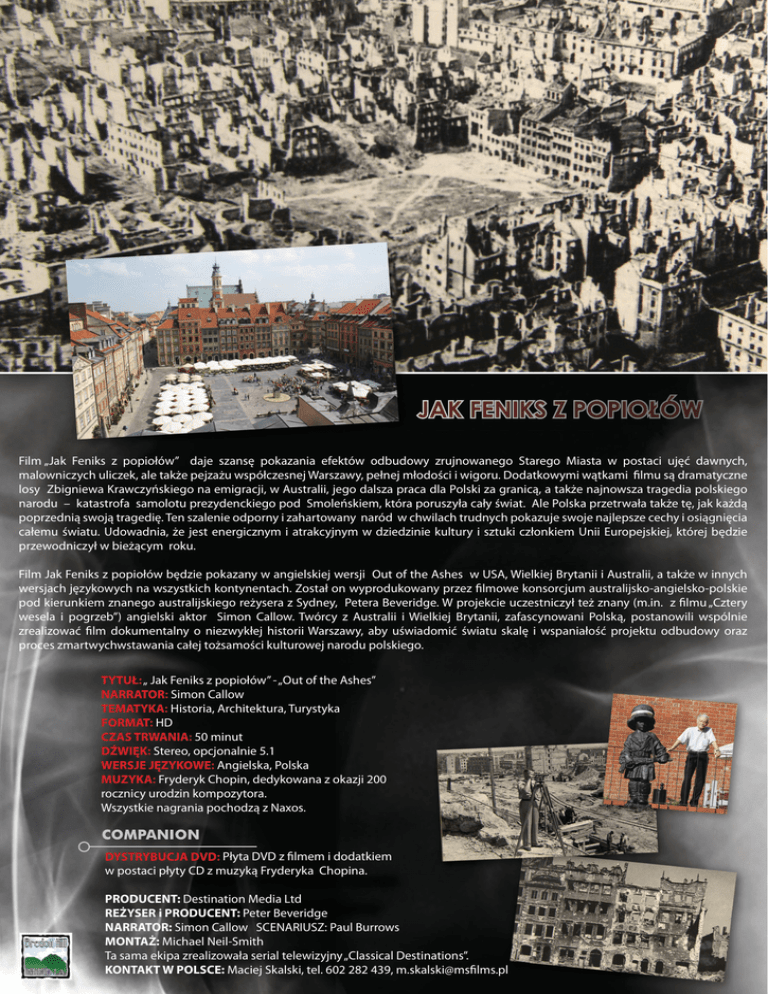 Film „Jak Feniks z popiołów” daje szansę pokazania efektów odbudowy zrujnowanego Starego Miasta w postaci ujęć dawnych, malowniczych uliczek, ale także pejzażu współczesnej Warszawy, pełnej młodości i wigoru. Dodatkowymi wątkami filmu są dramatyczne losy Zbigniewa Krawczyńskiego na emigracji, w Australii, jego dalsza praca dla Polski za granicą, a także najnowsza tragedia polskiego narodu – katastrofa samolotu prezydenckiego pod Smoleńskiem, która poruszyła cały świat. Ale Polska przetrwała także tę, jak każdą poprzednią swoją tragedię. Ten szalenie odporny i zahartowany naród w chwilach trudnych pokazuje swoje najlepsze cechy i osiągnięcia całemu światu. Udowadnia, że jest energicznym i atrakcyjnym w dziedzinie kultury i sztuki członkiem Unii Europejskiej, której będzie przewodniczył w bieżącym roku. Film Jak Feniks z popiołów będzie pokazany w angielskiej wersji Out of the Ashes w USA, Wielkiej Brytanii i Australii, a także w innych wersjach językowych na wszystkich kontynentach. Został on wyprodukowany przez filmowe konsorcjum australijsko-angielsko-polskie pod kierunkiem znanego australijskiego reżysera z Sydney, Petera Beveridge. W projekcie uczestniczył też znany (m.in. z filmu „Cztery wesela i pogrzeb”) angielski aktor Simon Callow. Twórcy z Australii i Wielkiej Brytanii, zafascynowani Polską, postanowili wspólnie zrealizować film dokumentalny o niezwykłej historii Warszawy, aby uświadomić światu skalę i wspaniałość projektu odbudowy oraz proces zmartwychwstawania całej tożsamości kulturowej narodu polskiego. TYTUŁ: „ Jak Feniks z popiołów” - „Out of the Ashes” NARRATOR: Simon Callow TEMATYKA: Historia, Architektura, Turystyka FORMAT: HD CZAS TRWANIA: 50 minut DŹWIĘK: Stereo, opcjonalnie 5.1 WERSJE JĘZYKOWE: Angielska, Polska MUZYKA: Fryderyk Chopin, dedykowana z okazji 200 rocznicy urodzin kompozytora. Wszystkie nagrania pochodzą z Naxos. DYSTRYBUCJA DVD: Płyta DVD z filmem i dodatkiem w postaci płyty CD z muzyką Fryderyka Chopina. PRODUCENT: Destination Media Ltd REŻYSER i PRODUCENT: Peter Beveridge NARRATOR: Simon Callow SCENARIUSZ: Paul Burrows MONTAŻ: Michael Neil-Smith Ta sama ekipa zrealizowała serial telewizyjny „Classical Destinations”. KONTAKT W POLSCE: Maciej Skalski, tel. 602 282 439, [email protected]
