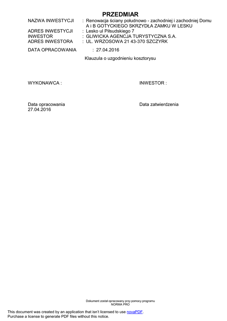 PRZEDMIAR NAZWA INWESTYCJI ADRES INWESTYCJI INWESTOR ADRES INWESTORA DATA OPRACOWANIA : Renowacja ściany połudnowo - zachodniej i zachodniej Domu A i B GOTYCKIEGO SKRZYDŁA ZAMKU W LESKU : Lesko ul Piłsudskiego 7 : GLIWICKA AGENCJA TURYSTYCZNA S.A. : UL. WRZOSOWA 21 43-370 SZCZYRK : 27.04.2016 Klauzula o uzgodnieniu kosztorysu WYKONAWCA : INWESTOR : Data opracowania 27.04.2016 Data zatwierdzenia Dokument został opracowany przy pomocy programu NORMA PRO This document was created by an application that isn’t licensed to use novaPDF. Purchase a license to generate PDF files without this notice. LESKO2016-7.kst PRZEDMIAR Lp. Podstawa Opis i wyliczenia Remont elewacji 1 Elewacja zachodnia 1 KNR-W 2-02 Rusztowania ramowe przyścienne RR - 1/30 wysokość do 16 m d.1 1609-02 16.6*15.10 j.m. 4 KNR 19-01 d.1 0829-01 m2 dzierżawa rusztowania na okres 60 dni m2 250.66 m2 Oczyszczenie ścierne lub chemiczne wykutych spoin - mury gładkie m2 250.66 m2 5 KNR BC 02- Czyszczenie powierzchni ściany-metoda hydrodynamiczna d.1 0203-05 250.66 6 KNR 19-01 d.1 0317-01 7 KNR BC-02 d.1 0121-03 8 KNR 19-01 d.1 0801-01 9 KNR AT-32 d.1 0603-01 10 KNR 2-02 d.1 0923-04 11 KNR 19-01 d.1 0538-07 12 KNR 4-01 d.1 0610-01 13 KNNR-W 3 d.1 1011-03 Razem m2 2 KNR-W 2-02 Instalacje odgromowe na rusztowaniach zewnętrznych przyściennych o wysokości m2 d.1 1612-03 do 20 m 250.66 m2 3 kalkulacja d.1 własna Poszcz. 250.660 RAZEM 250.660 250.660 RAZEM 250.660 250.660 RAZEM 250.660 250.660 RAZEM 250.660 250.660 RAZEM 250.660 20.000 RAZEM 20.000 238.127 RAZEM 238.127 238.127 RAZEM 238.127 238.127 RAZEM 238.127 1.200 RAZEM 1.200 1.950 RAZEM 1.950 14.560 RAZEM 14.560 14.560 RAZEM 14.560 1253.300 RAZEM 1253.300 1253.300 RAZEM 1253.300 1253.300 RAZEM 1253.300 1253.300 RAZEM 1253.300 37.599 RAZEM 37.599 m2 m2 Naprawa powierzchni murów z kamienia z wykuciem o gł. do 15 cm i pow. do 0,15 msc m2 20 msc Przygotowanie podłoży pod wykonanie tynków renowacyjnych - naprawa podłoża i m2 wypełnienie spoin 250.66*95% m2 Uzupełnienie tynków zewnętrznych kat. III z zaprawy wapiennej lub cementowowapiennej 250.66*95% m2 Wyprawy tynkarskie z zaprawy szpachlowej do renowacji fasad grubości 3-4 mm wykonywane sposobem ręcznym bez siatki zbrojeniowej 238.127 m2 Spadki pod obróbki blacharskie z zaprawy m2 1.50*0.4*2 m2 m2 m2 Wykonanie i montaż podokienników o szer. 25-50 cm z blachy cynkowo-tytanowej m2 1.50*0.65*2 m2 Odgrzybianie elementów drewnianych przy użyciu szczotek stalowych - oczyczenie podbitki 18.2*0.8 m2 Lakierowanie powierzchni drewnianych-podbitka m2 18.2*0.8 m2 m2 14 TZKNC N-K/ Usuwanie z powierzchni kamienia zaprawy cementowo-wapiennej i gipsu - kamień dm2 d.1 VI 1/6-b porowaty - piaskowiec 1253.3 dm2 15 TZKNC N-K/ Zniszczenie żywotności mikroorganizmów w porach kamienia metodą chemiczną d.1 VI 1/13-b (dezynfekcja) - kamień porowaty - piaskowiec 1253.3 dm2 dm2 16 TZKNC N-K/ Usuwanie plam i wykwitów powstałych od tlenków metali metodami chemicznymi - dm2 d.1 VI 1/15-b kamień porowaty - piaskowiec 1253.3 dm2 17 TZKNC N-K/ Wypełnienie starych wykruszonych połączeń kamieni (spoiny fugi) d.1 VI 3/8-a 1253.3 dm2 dm2 18 TZKNC N-K/ Uzupełnianie ubytków za pomocą kitów na bazie wapna dotowanego lub cementu dm2 d.1 VI 3/4-a nisko alkalicznego z ewentualnymi dodatkami modyfikującymi (kity podbarwione w masie na kolor otoczenia) 1253.3*3% dm2 -2- This document was created by an application that isn’t licensed to use novaPDF. PRO Wersja 4.52 Nr seryjny: 17633 Użytkownik: Jerzy Śliwa Purchase a Norma license to generate PDF files without this notice. LESKO2016-7.kst PRZEDMIAR Lp. Podstawa Opis i wyliczenia 19 TZKNC N-K/ hydrofobizacja strukturalna obiektu kamiennego d.1 VI 2/1-a 1253.3 2 Elewacja południowo-zachodnia 20 KNR-W 2-02 Rusztowania ramowe przyścienne RR - 1/30 wysokość do 16 m d.2 1609-02 40 21 kalkulacja d.2 własna 22 KNR 19-01 d.2 0309-08 j.m. dm2 dm2 m2 m2 40 m2 Mury na otwartym terenie - murki, ogrodzenia, skarpy z kamienia polnego na zaprawie cementowo-wapiennej-przypora muru 42.50 m3 This document was created by an application that isn’t licensed to use novaPDF. PRO Wersja 4.52 Nr seryjny: 17633 Użytkownik: Jerzy Śliwa Purchase a Norma license to generate PDF files without this notice. Razem 1253.300 RAZEM 1253.300 40.000 RAZEM 40.000 40.000 RAZEM 40.000 42.500 RAZEM 42.500 m2 dzierżawa rusztowania na okres 30 dni -3- Poszcz. m3