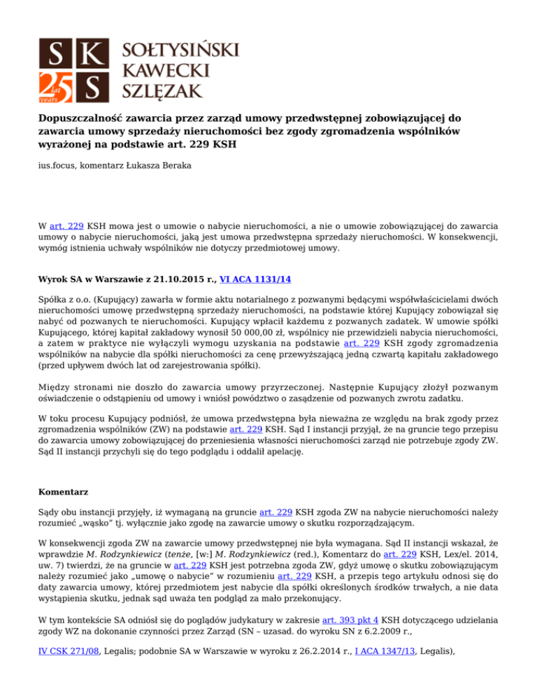 Dopuszczalność zawarcia przez zarząd umowy przedwstępnej zobowiązującej do zawarcia umowy sprzedaży nieruchomości bez zgody zgromadzenia wspólników wyrażonej na podstawie art. 229 KSH ius.focus, komentarz Łukasza Beraka W art. 229 KSH mowa jest o umowie o nabycie nieruchomości, a nie o umowie zobowiązującej do zawarcia umowy o nabycie nieruchomości, jaką jest umowa przedwstępna sprzedaży nieruchomości. W konsekwencji, wymóg istnienia uchwały wspólników nie dotyczy przedmiotowej umowy. Wyrok SA w Warszawie z 21.10.2015 r., VI ACA 1131/14 Spółka z o.o. (Kupujący) zawarła w formie aktu notarialnego z pozwanymi będącymi współwłaścicielami dwóch nieruchomości umowę przedwstępną sprzedaży nieruchomości, na podstawie której Kupujący zobowiązał się nabyć od pozwanych te nieruchomości. Kupujący wpłacił każdemu z pozwanych zadatek. W umowie spółki Kupującego, której kapitał zakładowy wynosił 50 000,00 zł, wspólnicy nie przewidzieli nabycia nieruchomości, a zatem w praktyce nie wyłączyli wymogu uzyskania na podstawie art. 229 KSH zgody zgromadzenia wspólników na nabycie dla spółki nieruchomości za cenę przewyższającą jedną czwartą kapitału zakładowego (przed upływem dwóch lat od zarejestrowania spółki). Między stronami nie doszło do zawarcia umowy przyrzeczonej. Następnie Kupujący złożył pozwanym oświadczenie o odstąpieniu od umowy i wniósł powództwo o zasądzenie od pozwanych zwrotu zadatku. W toku procesu Kupujący podniósł, że umowa przedwstępna była nieważna ze względu na brak zgody przez zgromadzenia wspólników (ZW) na podstawie art. 229 KSH. Sąd I instancji przyjął, że na gruncie tego przepisu do zawarcia umowy zobowiązującej do przeniesienia własności nieruchomości zarząd nie potrzebuje zgody ZW. Sąd II instancji przychyli się do tego podglądu i oddalił apelację. Komentarz Sądy obu instancji przyjęły, iż wymaganą na gruncie art. 229 KSH zgoda ZW na nabycie nieruchomości należy rozumieć „wąsko” tj. wyłącznie jako zgodę na zawarcie umowy o skutku rozporządzającym. W konsekwencji zgoda ZW na zawarcie umowy przedwstępnej nie była wymagana. Sąd II instancji wskazał, że wprawdzie M. Rodzynkiewicz (tenże, [w:] M. Rodzynkiewicz (red.), Komentarz do art. 229 KSH, Lex/el. 2014, uw. 7) twierdzi, że na gruncie w art. 229 KSH jest potrzebna zgoda ZW, gdyż umowę o skutku zobowiązującym należy rozumieć jako „umowę o nabycie” w rozumieniu art. 229 KSH, a przepis tego artykułu odnosi się do daty zawarcia umowy, której przedmiotem jest nabycie dla spółki określonych środków trwałych, a nie data wystąpienia skutku, jednak sąd uważa ten podgląd za mało przekonujący. W tym kontekście SA odniósł się do poglądów judykatury w zakresie art. 393 pkt 4 KSH dotyczącego udzielania zgody WZ na dokonanie czynności przez Zarząd (SN – uzasad. do wyroku SN z 6.2.2009 r., IV CSK 271/08, Legalis; podobnie SA w Warszawie w wyroku z 26.2.2014 r., I ACA 1347/13, Legalis), w których wskazano że „nabycie” w świetle art. 393 pkt 4 KSH może być rozumiane „ściśle”, jako „skutek rozporządzający” albo „szeroko”, jako czynność zobowiązującą i rozporządzającą umowy. Sąd Najwyższy uznał jednak, że norma ta ma restrykcyjny charakter, a zatem zgodnie z zasadą exceptiones non sunt extendendae przepisu tego nie należy interpretować rozszerzająco. W związku z tym, przez „nabycie” należy rozumieć wyłącznie czynność o skutku rozporządzającym. Sąd Najwyższy wskazał również, że WZ ma możliwość zgodnie z art. 17 § 2 KSH udzielić zgody ex post na każdą dokonaną przez zarząd czynność, a więc również na czynność o skutku rozporządzającym, dzięki czemu czynność ta stanie się ważna. W konsekwencji, trudno wg SN wymagać zgody wspólników na czynność, która może dopiero doprowadzić do takiego nabycia. Sąd Najwyższy wskazał również, że ww. przepisy Kodeksu spółek handlowych nie mają charakteru absolutnego, gdyż może je wyłączyć statut spółki. W rezultacie SN przyjął, że Zarząd może bez uzyskania zgody WZ z art. 393 pkt 4 KSH prowadzić negocjacje w sprawie zawarcia umowy zbycia nieruchomości oraz zawrzeć umowę przedwstępną, nawet o skutku silniejszym zobowiązującą do przeniesienia własności (art. 390 § 2 KC). Podobne argumenty przytoczył SN w uchwale z 21.2.2008 r. (III CZP 137/07, Legalis) w zakresie spółki z o.o. uznając, że dopuszczalne jest udzielenie przybicia własności nieruchomości na rzecz spółki z o.o. bez uchwały wspólników wyrażającej zgodę na nabycie nieruchomości, w sytuacji gdy umowa spółki nie wyłącza konieczności uzyskania takiej zgody przed wydaniem postanowienia o przybiciu. Wyżej powołany podgląd M. Rodzynkiewicza, który przyjął odmienną od SN wykładnię art. 229 KSH, poparł w doktrynie M. Stanik (tenże, komentarz do art. 229 KSH [w:] Z. Jara (red.) KSH. Komentarz, Legalis/el. 2016, uw. 11). Podobnie, już wcześniej wypowiedziała się M. Litwińska-Werner (M. Litwińska-Werner (red.), komentarz do art. 229 KSH, Legalis/el. 2007, uw. 4), twierdząc, iż taka wykładania przepisu służy zabezpieczeniu interesów spółki i ochrony wspólników przed wniesieniem tzw. ukrytych aportów. Pozostali komentatorzy wskazują jedynie na bezwzględnie wiążący charakter uchwały wspólników z art. 229 KSH nie rozstrzygając o tym, czy nie odnosząc się do kwestii „szerokiego” albo „wąskiego” rozumienia nabycia na gruncie tego przepisu (por. m.in.: A. Szajkowski, M. Tarska, A. Szumański, komentarz do art. 229 KSH, [w:] S. Sołtysiński (red.), Komentarz do Kodeksu spółek handlowych, Lex/el. 2014, uw. 4 i n.; A. Kidyba, komentarz do art. 229 KSH, [w:] A. Kidyba (red.), Komentarz akt. do 1–300 KSH, Lex/el. 2016; J. Strzępka, E. Zielińska, komentarz do art. 229 KSH, [w:] J. Strzępka (red.), Komentarz do 