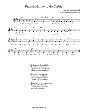 Przychodzimy tu do Ciebie muz. ks. Rafał Jaworski sł. Maciej Jarosław Dąbrowa ∀∀ 3 G‰ ι ι ι A ι ι Dι Hm % 3 œ œ œ œ œ œ œ œ− Ó 1. Pra- gnie- my Twe - go sło 5 % ∀∀ ‰ œ œ œ œ œ Ι Ι Ι G A Fis ∀∀ − Dι ι ι ι Gœ % −œ œ œ œ Ι 9 11 % ∀∀ E tu wy - ru - szyć z To - bą Pa ni, œ ι do œ ι by Em być z To - bą Pa - nie œ ι Je - zu ι œ A œ Cie - bie ι œι œι ι œι œι œι ι œ œ œ Hm D nio - sąc ι A œ œ ι 3. Błogosław swoje dzieci. Chcemy być silni Tobą, Kroczyć drogą świętości, Chwalić Cię dniem i nocą. 4. Pójdziemy w swą codzienność, By głosić Dzieła Boże. Z nami jest Twoja Matka, Ona nam dopomoże. œ - sze. nie. ι œ ser - ca œ Fism w da ι ι ι œ œ œ œ w Twym Ko - ście - le 2. Nakarm nas Swoim Ciałem, By z Tobą zjednoczeni, Żyć tylko dla Twej chwały, Miłością świat przemienić. www.nuty.religijne.org ι - A ι ι œ œι œ − Ó œ ‰ œι œι œι œ Hm - A Prze- mie- niaj ser - ca na wa. œ œ ˙ Przez Cie - bie po - u - cze Ref. Przy - cho - dzi - my - ‰ ι ι ι ι ι ιœ − Ó œ œ œ œ œ œ œ G D ra - - rze, œ zem. −−