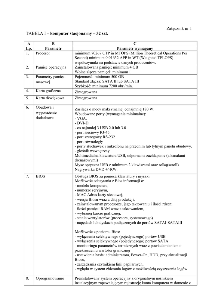 Załącznik nr 1 TABELA I – komputer stacjonarny – 32 szt.