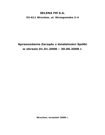 SELENA FM S.A. 53-611 Wrocław, ul. Strzegomska 2-4 Sprawozdanie Zarządu z działalności Spółki w okresie 01.01.2008 – 30.06.2008 r. Wrocław, wrzesień 2008 r. Spółka Selena FM S.A. z siedzibą we Wrocławiu, przy ul. Strzegomskiej 2-4, jest wpisana do rejestru przedsiębiorców prowadzonego przez Sąd Rejonowy dla Wrocławia-Fabrycznej we Wrocławiu, VI Wydział Gospodarczy Krajowego Rejestru Sądowego pod numerem KRS 0000292032. Spółka powstała z przekształcenia spółki Selena FM sp. z o.o. w spółkę akcyjną, uchwalonego przez Nadzwyczajne Walne Zgromadzenie Wspólników Spółki w dniu 26 września 2007 roku, a zarejestrowanego 31 października 2007 roku przez Sąd Rejonowy dla Wrocławia-Fabrycznej we Wrocławiu w Krajowym Rejestrze Sądowym. W okresie sprawozdawczym Spółka osiągnęła przychody ze sprzedaŜy w wysokości 4 958 tys. zł. co stanowi wzrost o ponad 143 % w stosunku do analogicznego okresu roku poprzedniego i wykazała stratę netto w wysokości 5 747 tys. zł. Suma bilansowa na koniec I półrocza 2008 roku wynosiła 200 537 tys. zł. Największy udział w tej kwocie przypada na aktywa obrotowe 124 499 tys. zł, w których największą wartość stanowią środki pienięŜne i ich ekwiwalenty 69 660 tys. zł i krótkoterminowe aktywa finansowe 44 806 tys. zł. Majątek ten finansowany jest przede wszystkim przez kapitał własny w wysokości 196 546 tys. zł. 1. Podstawowa działalność Spółki jest realizowana poprzez zarządzanie strategiczne i operacyjne grupą kapitałową, dostarczanie jej podmiotom zaleŜnym wyspecjalizowanych usług stanowiących uzupełnienie ich podstawowej działalności, świadczonych wg jednolitych standardów i obejmujących przede wszystkim: doradztwo strategiczne (w tym prawne), doradztwo finansowe, doradztwo personalne, prowadzenie ksiąg rachunkowych oraz tworzenie i realizację strategii sprzedaŜy. 2. SprzedaŜ usług realizowana jest przez Spółkę w całości na rynku krajowym. W okresie sprawozdawczym nie zaszły Ŝadne zmiany w zakresie rynków obsługiwanych przez Spółkę. W okresie objętym raportem nie zaszły Ŝadne istotne zmiany w charakterze prowadzonej przez nią działalności. 3. W okresie sprawozdawczym Spółka zawarła ze spółką Libra sp. z o.o. (swoim podmiotem zaleŜnym) dwie umowy wypełniające łącznie kryterium znaczącej umowy. Dotyczyły one zobowiązania Libra sp. z o.o. do wyemitowania obligacji, które w całości zostały objęte przez Selena FM S.A. Łączna wartość zawartych umów wyniosła 18 525 431,82 zł. Szczegółowe informacje dotyczące tej operacji zostały opisane w raporcie bieŜącym nr 20/2008 z dn. 24.06.2008 r. Poza tymi umowami Selena FM S.A. nie zawierała w okresie sprawozdawczym umów spełniających kryterium „znaczącej umowy”. Półroczne sprawozdanie Zarządu z działalności SELENA FM S.A. strona 2 W I półroczu 2008 r. Spółka nie zawarła Ŝadnych umów ubezpieczenia. Spółka nie posiada informacji o umowach zawartych pomiędzy akcjonariuszami. jej 4. Powiązania organizacyjne lub kapitałowe Spółki z innymi podmiotami według stanu na dzień 30.06.2008 r. przedstawiono na poniŜszym schemacie 100% SELENA FM S.A. SELENA Co. S.A. Unia Europejska Europa Wschodnia Polska 99,95% 100% 100% 50% 100% Orion Sp. z o.o. 100% Selena Vostok OOO (Rosja) 100% Selena Sever OOO (Rosja) 100% Selena Ukraine Ltd (Ukraina) 100% Selena CA L.L.P. (Kazachstan) Carina Sp. z o.o. Libra Sp. z o.o. Selena S.A. 50% Sima Sp. z o.o. Siloxane Sp. z o.o. Azja Płd.-Wsch. i Bliski Wschód 99,5% 30% 66,7% Europa Środkowo-Wschodnia Selena Bohemia s.r.o. (Czechy) 100% Selena Hungaria Kft. (Węgry) 100% Selena Romania SRL (Rumunia) 100% Selena Bulgaria Ltd (Bułgaria) 100% Selena Shanghai Trading Co. Ltd (Chiny) 85% POLYFOAM Yalitim Ltd (Turcja) UE15+EOG3 100% FinSelena Oy (Finlandia) 50% Selena Deutschland GmbH (Niemcy) 100% Foshan Chinuri-Selena Chemical Co. Ltd (Chiny) 100% 100% Selena Italia srl (Włochy) Hamil-Selena Co. Ltd (Korea Południowa) Ameryki Selena USA Inc. (USA) 95% Selena Sulamericana Ltda (Brazylia) Legenda: spółka produkcyjna 95% Neue Hagfa Dr Schenk (Niemcy) spółka produkcyjno-handlowa spółka handlowa Półroczne sprawozdanie Zarządu z działalności SELENA FM S.A. strona 3 5. W I półroczu 2008 r. pomiędzy Selena FM S.A. a jej podmiotami zaleŜnymi (Carina sp. z o.o., Libra sp. z o.o., Selena Co S.A., Selena S.A.) zostały zawarte umowy zobowiązujące te spółki do wyemitowania obligacji, które w całości zostały objęte przez Selena FM S.A., a łączna ich wartość wyniosła 44 525 tys. zł. Dokładny opis tych transakcji przedstawia nota nr 21 sprawozdania finansowego. Poza tymi umowami w I półroczu 2008 r. Selena FM S.A. zawierała ze spółką Selena Co S.A. transakcje, których łączna wartość w całym okresie sprawozdawczym przekroczyła 500 tys. EUR. Transakcje te miały charakter typowy i rutynowy, a ich warunki wynikały z bieŜącej działalności operacyjnej i zawierane były na warunkach rynkowych. Ponadto w czerwcu 2008 r. Spółka dokonała wykupu znaczącej części obligacji wyemitowanych we wrześniu 2007 r. dla podmiotu zaleŜnego – spółki Orion sp. z o.o. za kwotę 48,2 mln zł. Pozostałe obligacje zostały wykupione w dniu 2.07.2008 r. 6. W okresie sprawozdawczym Spółka nie zaciągała kredytów ani poŜyczek. 7. Na dzień 30.06.2008 r. Spółka była poręczycielem kredytów udzielonych jej podmiotom zaleŜnym. Łączna wartość zobowiązania z tego tytułu wynosi 25 000 tys. zł. Szczegółowe informacje przedstawione są w nocie 32.2 sprawozdania finansowego Spółki. W okresie sprawozdawczym Spółka nie udzielała poŜyczek. 8. W okresie objętym raportem Spółka przeprowadziła publiczną emisję akcji, w wyniku której uzyskała kwotę 165 mln zł. Środki te wg stanu na dzień 30.06.2008 r. zostały wykorzystane następująco: - 69,5 mln zł – lokaty bankowe do czasu wydatkowania na cele emisyj
