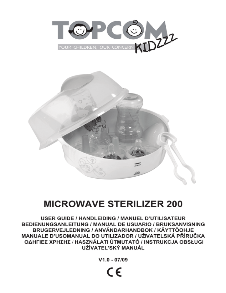 MICROWAVE STERILIZER 200 USER GUIDE / HANDLEIDING / MANUEL D’UTILISATEUR BEDIENUNGSANLEITUNG / MANUAL DE USUARIO / BRUKSANVISNING BRUGERVEJLEDNING / ANVÄNDARHANDBOK / KÄYTTÖOHJE MANUALE D’USOMANUAL DO UTILIZADOR / UŽIVATELSKÁ P@ÍRUBKA CDEFGHI JKEIEI / HASZNÁLATI ÚTMUTATÓ / INSTRUKCJA OBSNUGI UŽÍVATEL’SKÝ MANUÁL V1.0 - 07/09 Topcom Microwave Sterilizer 200 1 Przeznaczenie Aby zapewni[ bezpiecze\stwo Pa\stwa dziecku, wa@ne jest, aby sterylizowa[ butelki, smoczki, zatyczki smoczków i zakr]tki wedBug zalece\ lekarza. Sterylizacja parowa jest najbardziej efektywnym sposobem ochrony Pa\stwa dziecka przed szkodliwymi drobnoustrojami. W oparciu o zasady szpitalne, intensywne ciepBo z pary niszczy szkodliwe bakterie. 2 Porady dotycz`ce bezpieczecstwa OSTRZEmENIE POLSKI – UrzPdzenie jest przeznaczone tylko do zastosowa\ opisanych w niniejszym podr]czniku u@ytkownika. Producent nie ponosi odpowiedzialnoNci za zranienia lub uszkodzenia spowodowane niezgodnym z przeznaczeniem lub nieostro@nym u@ytkowaniem. – DokBadnie przeczyta[ instrukcje bezpiecze\stwa i zachowa[ niniejszy podr]cznik u@ytkownika do pó^niejszego wglPdu. – UrzPdzenie przeznaczone jest wyBPcznie do u@ytku domowego. Nie jest przystosowane do zastosowa\ medycznych lub komercyjnych. – Nieprzestrzeganie podanych tutaj wskazówek mo@e prowadzi[ do uszkodzenia produktu oraz kuchenki mikrofalowej. NIEBEZPIECZEnSTWO – To nie jest zabawka. Nie pozwala[ dziecku na zabaw] tym urzPdzeniem. – Nale@y zapewni[ NcisBy nadzór, gdy urzPdzenie jest u@ywane w pobli@u dziecka. 3 3.1 1. 2. 3. 4. 5. Opis urz`dzenia Akcesoria Pokrywa Szczypce Uchwyt Stojak na butelki Misa sterylizatora 4 4.1 • • • Rozpoczjcie pracy Wkkadanie butelek Umy[ wszystkie butelki oraz smoczki w wodzie z Bagodnym detergentem, nast]pnie dokBadnie wypBuka[. Wla[ 80 ml wody do misy sterylizatora 5 . Butelki nale@y umieNci[ na stojaku do góry nogami 4 . DBu@sze butelki mo@na ustawi[ pod kPtem. 31 Topcom Microwave Sterilizer 200 • • Wolne miejsce mo@na zapeBni[ smoczkami przykrytymi pokrywkami. ZaBo@y[ uchwyt 3 tak, jak pokazano na ilustracji i umieN[ w nim pozostaBe smoczki, odciPgacze pokarmu lub zabawki 3 . ZaBo@y[ pokryw] na mis] 5 sterylizatora i zablokowa[ znajdujPce si] po obu stronach zaczepy. • 4.2 Sterylizacja OSTRZEmENIE – Nigdy nie wolno u@ywa[ sterylizatora bez 80 ml wody w Nrodku. – Dodanie za maBej iloNci wody mo@e spowodowa[ uszkodzenie sterylizatora oraz jego zawartoNci. – Dodatnie zbyt du@ej iloNci wody mo@e spowodowa[, @e butelki oraz smoczki nie b]dP wysterylizowane. – Nie dotyka[ gorPcych powierzchni. U@y[ dostarczonych szczypiec 2 . – Nie umieszcza[ urzPdzenia na gorPcej powierzchni lub w piekarniku. – W niniejszym urzPdzeniu nie wolno u@ywa[ wybielaczy lub chemicznych Nrodków sterylizujPcych. – W przypadku kuchenek mikrofalowych z funkcjP grilla nale@y upewni[ si], @e funkcja ta jest wyBPczona oraz @e nagrzewnica ostygBa. – Nie przepeBnia[. – Nie wolno przekracza[ czasu sterylizacji, gdy@ mo@e to doprowadzi[ do uszkodzenia sterylizatora oraz jego zawartoNci. • • UmieNci[ sterylizator w kuchence mikrofalowej. Ustawi[ odpowiedniP moc kuchenki. Wyznaczy[ czas sterylizacji. Moc kuchenki mikforalowej Czas sterylizacji Czas studzenia >1100 W 4 minuty 2 minuty 810 W – 1100 W 6 minut 2 minuty <800 W 7 minut 2 minuty • • Przed przenoszeniem wysterylizowanych przedmiotów nale@y dokBadnie umy[ r]ce. Do przenoszenia butelek oraz smoczków nale@y u@ywa[ doBPczonych szczypiec 2 . OSTRZEmENIE – Po zako\czeniu procesu sterylizacji nale@y zawsze odczeka[ co najmniej 2 minuty przed wyj]ciem urzPdzenia z kuchenki mikrofalowej. – Sterylizowane przedmioty mogP by[ bardzo gorPce. Nie wyjmowa[ ich goBymi r]kami, gdy@ mo@e to spowodowa[ poparzenie. U@y[ dostarczonych szczypiec 2 ! – Podczas zdejmowania pokrywy , ze sterylizatora mo@e ulecie[ para. GorPca para mo@e spowodowa[ poparzenia. 5 Czyszczenie Po ka@dym u@yciu nale@y wyla[ pozostajPcP wod] i przepBuka[ tak, aby wewnPtrz nie osadzaB si] osad. Przemy[ urzPdzenie w wodzie z Bagodnym detergentem i przepBuka[ dokBadnie w czystej wodzie. Wysuszy[ dokBadnie i przechowywa[ w czystym miejscu. 32 Topcom Microwave Sterilizer 200