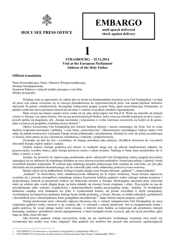 EMBARGO until speech delivered check against delivery HOLY SEE PRESS OFFICE 1 STRASBOURG – 25.11.2014 Visit at the European Parliament Address of the Holy Father Official translation Panie Przewodniczący, Panie i Panowie Wiceprzewodniczący, Dostojni Eurodeputowani, Szanowni Państwo z różnych tytułów pracujący w tej Izbie, Drodzy przyjaciele, Dziękuję wam za zaproszenie, by zabrać głos na forum tej fundamentalnej instytucji życia Unii Europejskiej i za daną mi przez was szansę zwrócenia się za waszym pośrednictwem do reprezentowanych przez was ponad pięciuset milionów obywateli 28 państw członkowskich. Szczególną wdzięczność pragnę wyrazić Panu, panie przewodniczący Parlamentu, za pańskie serdeczne słowa powitania skierowane do mnie w imieniu wszystkich członków Zgromadzenia. Moja wizyta ma miejsce ponad ćwierć wieku od tej, jaką złożył papież Jan Paweł II. Wiele się zmieniło od tamtych czasów w Europie i na całym świecie. Nie ma już przeciwstawnych bloków, które wówczas dzieliły kontynent na dwie części i powoli spełnia się pragnienie, aby „Europa suwerenna i wyposażona w wolne instytucje rozszerzyła się kiedyś aż do granic, jakie wyznacza jej geografia, a bardziej jeszcze historia”1. Oprócz rozszerzonej Unii Europejskiej jest również bardziej złożony i mocno zmieniający się świat. Jest on coraz bardziej wzajemnie powiązany i globalny, a więc mniej „eurocentryczny”. Obszerniejszej i posiadającej większy wpływ Unii zdaje się jednak towarzyszyć wizerunek Europy trochę podstarzałej i przytłumionej, skłonnej by czuć się mniej uczestniczącą w świecie, który patrzy na nią z dystansem, nieufnością, a niekiedy z podejrzliwością. Zwracając się dziś do was i wychodząc od mojego powołania jako pasterza, chciałbym skierować do wszystkich obywateli Europy orędzie nadziei i zachęty. Orędzie nadziei, którego podstawą jest ufność, że trudności mogą stać się silnymi katalizatorami jedności, by przezwyciężyć wszelkie obawy, jakie Europa przeżywa razem z całym światem. Nadzieję w Panu, który przekształca zło w dobro, a śmierć w życie. Zachęty, by powrócić do stanowczego przekonania ojców założycieli Unii Europejskiej, którzy pragnęli przyszłości opierającej się na zdolności do wspólnego działania na rzecz przezwyciężenia podziałów i krzewienia pokoju i jedności wśród wszystkich narodów kontynentu. W centrum tego ambitnego projektu politycznego było zaufanie do człowieka, nie tyle jako obywatela ani też podmiotu ekonomicznego, ale do człowieka jako osoby obdarzonej godnością transcendentną. Bardzo zależy mi na podkreśleniu ścisłego związku między tymi dwoma słowami: „godność” i „transcendentna”. „Godność” to słowo-klucz, które charakteryzowało odbudowę po II wojnie światowej. Nasza historia najnowsza wyróżnia się z powodu niewątpliwie centralnego miejsca krzewienia ludzkiej godności wobec różnego rodzaju przemocy i dyskryminacji, których na przestrzeni wieków nie brakowało również w Europie. Dostrzeganie znaczenia praw człowieka rodzi się właśnie jako wynik długiej drogi, na którą składały się również liczne cierpienia i ofiary. Przyczyniła się ona do uświadomienia sobie wartości, wyjątkowości i niepowtarzalności każdej poszczególnej osoby ludzkiej. Ta świadomość kulturowa znajduje swój fundament nie tylko w wydarzeniach historii, ale przede wszystkim w myśli europejskiej, wyróżniającej się bogactwem spotkania, którego liczne źródła pochodzą „z Grecji i Rzymu, ze źródeł celtyckich, germańskich i słowiańskich oraz z chrześcijaństwa, które ją dogłębnie ukształtowało”2, dając właśnie miejsce pojęciu „osoby”. Dzisiaj promowanie praw człowieka odgrywa kluczową rolę w ramach zaangażowania Unii Europejskiej na rzecz wspierania godności osoby, zarówno w jej wnętrzu, jak i w relacjach z innymi państwami. Jest to zaangażowanie ważne i godne podziwu, bo wciąż istnieje nazbyt wiele sytuacji, w których istoty ludzkie są traktowane jak przedmioty, których koncepcję, strukturę i przydatność można zaprogramować, a które następnie można wyrzucić, gdy nie są już potrzebne, gdyż stają się słabe, chore lub stare. Jaka bowiem godność istnieje rzeczywiście, kiedy nie ma możliwości swobodnego wyrażania swej myśli czy wyznawania bez ucisku swej wiary religijnej? Jaka godność jest możliwa bez jasnych ram prawnych, ograniczających 1 2 JAN PAWEŁ II, Przemówienie w Parlamencie Europejskim,11 października 1988, n.5. JAN PAWEŁ II, Przemówienie do Zgromadzenia Parlamentarnego Rady Europy, 8 października 1988, 3. HOLY SEE PRESS OFFICE 1/2 panowanie siły i sprawiających wyższość prawa nad tyranią władzy? Jaką godność może w ogóle posiadać mężczyzna lub kobieta, którzy stali się przedmiotem jakiejkolwiek dyskryminacji? Jaką godność może mieć kiedykolwiek osoba, która nie ma pożywienia czy minimum niezbędnego do życia, czy co gorsza, pracy, która namaszcza ją godnością? Krzewienie godności osoby oznacza uznanie, że posiada ona niezbywalne prawa, których nie może być pozbawiona arbitralnie przez nikogo, a tym mniej, na rzecz interesów ekonomicznych. Trzeba jednak zwracać uwagę, aby nie popaść w pewne dwuznaczności, które mogą wynikać z niezrozumienia idei praw człowieka i ich paradoksalnego nadużywania. Istnieje dziś bowiem skłonność, by rościć sobie coraz więcej praw indywidualnych. Tendencja ta skrywa koncepcję osoby ludzkiej oderwanej od wszelkiego kontekstu społecznego i antropologicznego, niemal jako „monady” (μονάς), coraz bardziej nieczułej na inne otaczające ją „monady”. Koncepcji prawa zdaje się już nie towarzyszyć równie istotna i dopełniająca koncepcja obowiązku, tak że w końcu dochodzi do potwierdzenia praw jednostki, nie uwzględniając, że ka