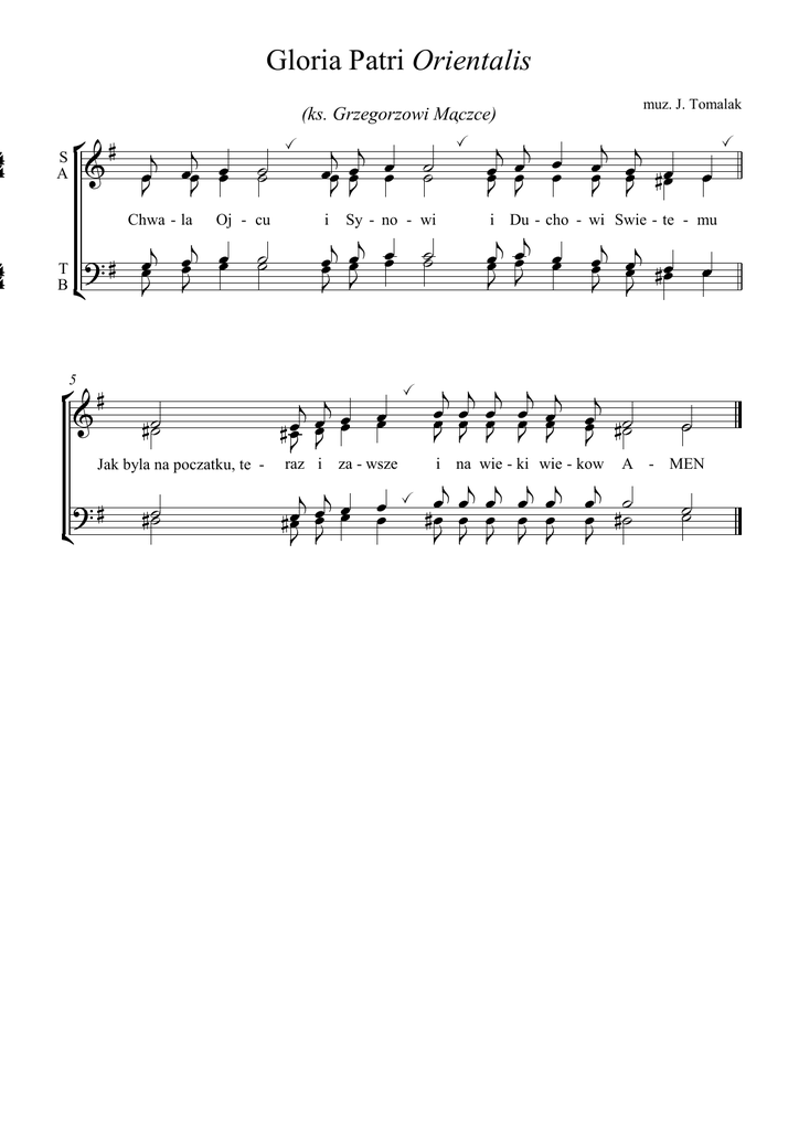 Gloria Patri Orientalis S A Chwa - la Jak byla na poczatku, te - i 5 Oj - cu T B (ks. Grzegorzowi Maczce) , Sy - no - wi za - wsze i Du - cho - wi Swie - te - mu raz i muz. J. Tomalak i na wie - ki wie - kow A - MEN