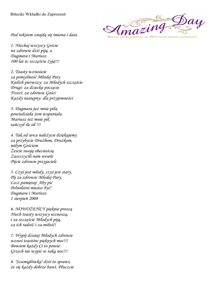 Bileciki Wkładki do Zaproszeń Pod tekstem znajdą się imiona i data 1. Niechaj wszyscy Goście na zdrowie dziś piją, a Dagmara i Mariusz 100 lat w szczęściu żyją!!! 2. Toasty wznosicie za pomyślność Młodej Pary Kielich pierwszy: za Młodych szczęście Drugi: za dziecka poczęcie Trzeci: za zdrowie Gości Każdy następny: dla przyjemności 3. Dagmara już mnie piła, powiedziała żem wspaniała. Mariusz też mnie pił, tańczył ile sił !!! 4. Tak od serca należycie dziękujemy za przybycie Drużbom, Drużkom, miłym Gościom Żeście swoją obecnością Zaszczycili nam wesele Pijcie zdrowie przyjaciele 5. Czyś jest młody, czyś jest stary, Pij za zdrowie Młodej Pary, Lecz pamiętaj: Aby pić Pełnoletni musisz być! Dagmara i Mariusz 1 sierpień 2008 6. NOWOŻEŃCY pięknie proszą Niech toasty wszyscy wznoszą, i za szczęście Młodych piją, za ich radość i za miłość! 7. Wypij dzisiaj Młodych zdrowie wznoś toastów pięknych moc!!! Bowiem każdy Ci to powie: Grzech nie wypić w taką noc!!! 8. "Szumigłówka" dziś to sprawi, że się każdy dobrze bawi. Płuczcie Bileciki Wkładki do Zaproszeń gardła aż do rana, sala ma być rozśpiewana. Zapewniają o tym MŁODZI, "Szumigłówka" - nie zaszkodzi. 9. Drodzy goście! Pijcie śmiało! Niech Alkohol dziś się leje Jak będziecie mieli mało To starosta Wam doleje!!! 10. Niech nam Państwo Młodzi żyją! Dla nich świat dziś nabrał blasku. Goście niech ich zdrowie piją I się bawią aż do brzasku! 11. Niech zakwitnie Młodej Parze złoty szczęścia kwiat niech nie znają nigdy smutku i żyją 100 lat! 12. Pijcie Drodzy Przyjaciele Wszakże mamy tu wesele Zdrowie Młodych szybko wznoście No i bawcie się radośnie !!!!! Dagmara i Mariusz 1 sierpień 2008 13. Sto lat! Sto lat! - dzisiaj śpiewaj, Pij toasty jednym łykiem, Baw się długo i nie ziewaj. Tańcz i swawol ale z szykiem! 14. Niech kieliszki głośno brzęczą Bo to dźwięk dla ucha miły. Gdy się goście tańcem zmęczą Trunek im przywróci siły. 15. Niech dzwonią kielichy niech dzwonią puchary na zdrowie i szczęście dla Młodej Pary! 16. Wszyscy w dniu dzisiejszym czujemy się młodzi więc Wódka Weselna nikomu nie zaszkodzi Bileciki Wkładki do Zaproszeń 17. Wznoście toast Goście mili, By Dagmara i Mariusz w szczęściu i zdrowiu bardzo długo żyli 18. Każdy się dziś raduje i Wódka Weselna wszystkim smakuje niechaj wszyscy Goście na zdrowie dziś piją, a Dagmara z Mariuszem niech 100 lat żyją! 19. Jak wesele, to wesele Jedzcie dużo, pijcie wiele! Vivat, vivat Młoda Para, dalej niech się bocian stara! Za ten bohaterski czyn, niechaj pierwszy będzie syn! 20. Jesteś brachu na weselu Pij więc zdrowo przyjacielu Chciałbym Ciebie jednak prosić Bym nie musiał Cię wynosić. 21. Instrukcję każdy dobrze zna, toast ... i do dna 22. Pijcie Drodzy Przyjaciele Wszakże mamy tu wesele! Zdrowie Młodych szybko wznoście No i bawcie sie radośnie !!!!! 23. Prawie każdy Wam to powie, Kto chce szczęścia Młodej Pary, Musi wypić za jej zdrowie, Tak jak każe zwyczaj stary 24. Zapraszamy naszych Gości, do jedzenia, tańcowania. By nie przeminęła miłość, również do toastowania. 25. Pijcie zdrowie drodzy Goście Dagmary i Mariusza. A po radosnym toaście, Bileciki Wkładki do Zaproszeń każdy niech do tańca rusza. 26. Bawmy się Kochani moi, na weselu Młodej Pary. Pijmy za ich żywot długi i za dobre losu dary. 27. Toast wznoście moi mili, by Dagmara i Mariusz w zdrowiu i szczęściu żyli. Niechaj zawsze się kochają i gromadkę dzieci maja. 28. Dziś Dagmara i Mariusz, wspólna drogę wybrali. Wiec wznieśmy za nich Toast, aby zawsze się kochali. 29. Odrobina czaru, nieco namiętności. W weselnym toaście, sto procent miłości. 30. Za Młodej Pary zdrowie; wszyscy Toast wznoście. Niech sto lat żyją Młodzi i dobrze bawią się Goście. 31. Gość Weselny Niech toast wznosi I sąsiada z boku, Do toastu prosi! 32. Zdrowie Dagmary i Mariusza za ich miłość i wspólna drogę życia, wybrana dzisiaj, a która trwać będzie wiecznie !! 33. Ta butelka ma zadanie dziś istotne niesłychanie, bo ma sprawić byście byli rozśpiewani, goście mili!!! 34. Prawie każdy Wam to powie, kto chce szczęścia Młodej Pary, Bileciki Wkładki do Zaproszeń musi wypić za jej zdrowie, tak jak każe zwyczaj stary! 35. Bawmy się Kochani moi, na weselu Młodej Pary. Pijmy za ich żywot długi i za dobre losu dary 36. Szczodrze sobie polewajcie, o sąsiadach pamiętajcie. 37. Młoda Para zachęca: korki proszę odkręcać i polewać śmiało, by wesele się udało. 38. Gość weselny ma prawo Do złożenia reklamacji. Jeśli nie zadziała jedna butelka – – Niech poprosi o następną. ;) 39. Szczęśliwy ten, kto się żeni, Odtąd ma stróża serca i KIESZENI!!! 40.Wznoście zdrowie Młodej Pary Za niepicie będą kary! 41. Gorzka wódka, kwaśna mina, Ktoś tu polać zapomina! 42. Minister zdrowia ostrzega: Spożywanie alkoholu jest główną przyczyną niewytłumaczalnych odcisków dywanu na czole! 43. Przed użyciem zapoznaj się z treścią zawieszki bądź skonsultuj się z Panem Młodym lub Świadkami.