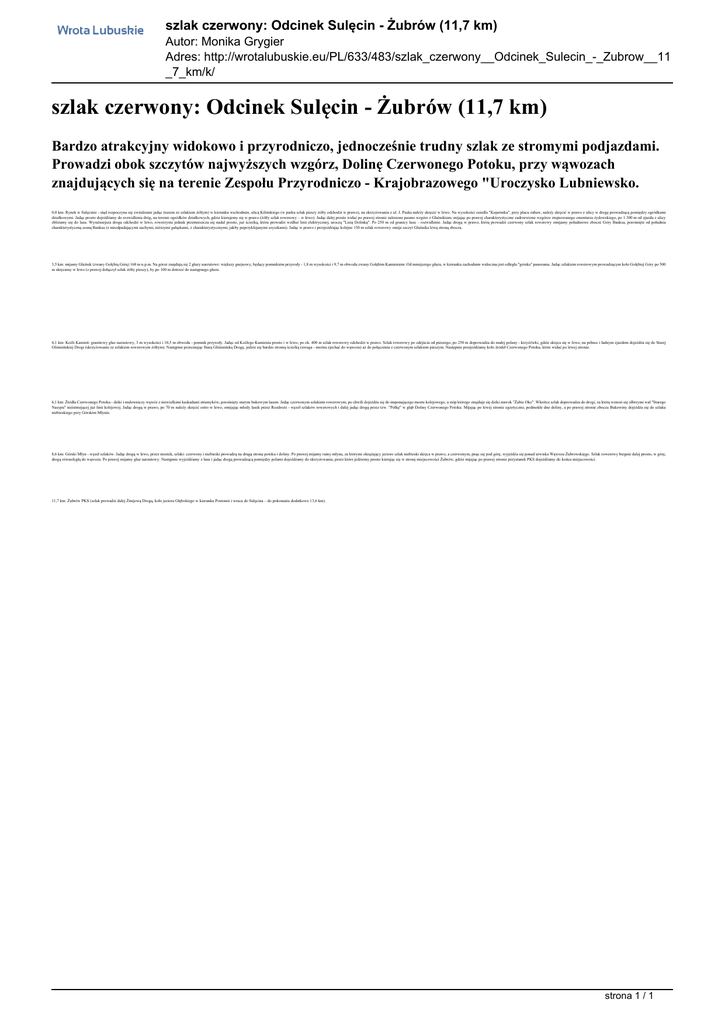 szlak czerwony: Odcinek Sulęcin - Żubrów (11,7 km) Autor: Monika Grygier Adres: http://wrotalubuskie.eu/PL/633/483/szlak_czerwony__Odcinek_Sulecin_-_Zubrow__11 _7_km/k/ szlak czerwony: Odcinek Sulęcin - Żubrów (11,7 km) Bardzo atrakcyjny widokowo i przyrodniczo, jednocześnie trudny szlak ze stromymi podjazdami. Prowadzi obok szczytów najwyższych wzgórz, Dolinę Czerwonego Potoku, przy wąwozach znajdujących się na terenie Zespołu Przyrodniczo - Krajobrazowego "Uroczysko Lubniewsko. 0,0 km: Rynek w Sulęcinie - stąd rozpoczyna się zwiedzanie jadąc (razem ze szlakiem żółtym) w kierunku wschodnim, ulicą Kilińskiego (w parku szlak pieszy żółty odchodzi w prawo), na skrzyżowaniu z ul. J. Paska należy skręcić w lewo. Na wysokości osiedla "Kopernika", przy placu zabaw, należy skręcić w prawo z ulicy w drogę prowadzącą pomiędzy ogródkami działkowymi. Jadąc prosto dojeżdżamy do rozwidlenia dróg, na terenie ogródków działkowych, gdzie kierujemy się w prawo (żółty szlak rowerowy – w lewo). Jadąc dalej prosto widać po prawej stronie zalesione pasmo wzgórz z Głaźnikiem; mijając po prawej charakterystyczne zadrzewione wzgórze zrujnowanego cmentarza żydowskiego, po 1.300 m od zjazdu z ulicy zbliżamy się do lasu. Wyraźniejsza droga odchodzi w lewo, rowerzysta jednak przemieszcza się nadal prosto, już ścieżką, która prowadzi wzdłuż linii elektrycznej, uroczą "Lisią Dolinką". Po 250 m od granicy lasu – rozwidlenie. Jadąc drogą w prawo, którą prowadzi czerwony szlak rowerowy omijamy południowe zbocze Góry Banksa, porośnięte od południa charakterystyczną sosną Banksa (z nieodpadającymi suchymi, niższymi gałązkami, z charakterystycznymi, jakby poprzyklejanymi szyszkami). Jadąc w prawo i przejeżdżając kolejne 150 m szlak rowerowy omija szczyt Głaźnika lewą stroną zbocza. 3,5 km: mijamy Głaźnik (zwany Gołębią Górą) 168 m n.p.m. Na górze znajdują się 2 głazy narzutowe: większy gnejsowy, będący pomnikiem przyrody - 1,8 m wysokości i 9,7 m obwodu zwany Gołębim Kamieniem. Od mniejszego głazu, w kierunku zachodnim widoczna jest odległa "górska" panorama. Jadąc szlakiem rowerowym prowadzącym koło Gołębiej Góry po 500 m skręcamy w lewo (z prawej dołączył szlak żółty pieszy), by po 100 m dotrzeć do następnego głazu. 4,1 km: Koźli Kamień: granitowy głaz narzutowy, 3 m wysokości i 10,5 m obwodu - pomnik przyrody. Jadąc od Koźlego Kamienia prosto i w lewo, po ok. 400 m szlak rowerowy odchodzi w prawo. Szlak rowerowy po odejściu od pieszego, po 250 m doprowadza do małej polany - krzyżówki, gdzie skręca się w lewo, na północ i ładnym zjazdem dojeżdża się do Starej Gliśnieńskiej Drogi (skrzyżowanie ze szlakiem rowerowym żółtym). Następnie przecinając Starą Gliśnieńską Drogę, jedzie się bardzo stromą ścieżką (uwaga - można zjechać do wąwozu) aż do połączenia z czerwonym szlakiem pieszym. Następnie przejeżdżamy koło źródeł Czerwonego Potoku, które widać po lewej stronie. 6,1 km: Źródła Czerwonego Potoku - dziki i malowniczy wąwóz z niewielkimi kaskadami strumyków, porośnięty starym bukowym lasem. Jadąc czerwonym szlakiem rowerowym, po chwili dojeżdża się do imponującego mostu kolejowego, u stóp którego znajduje się dziki stawek "Żabie Oko". Wkrótce szlak doprowadza do drogi, za którą wznosi się olbrzymi wał "Starego Nasypu" nieistniejącej już linii kolejowej. Jadąc drogą w prawo, po 70 m należy skręcić ostro w lewo, omijając młody lasek przez Rozdroże - węzeł szlaków rowerowych i dalej jadąc drogą przez tzw. "Półkę" w głąb Doliny Czerwonego Potoku. Mijając po lewej stronie egzotyczne, podmokłe dno doliny, a po prawej stronie zbocza Bukowiny dojeżdża się do szlaku niebieskiego przy Górskim Młynie. 8,6 km: Górski Młyn - węzeł szlaków. Jadąc drogą w lewo, przez mostek, szlaki: czerwony i niebieski prowadzą na drugą stronę potoku i doliny. Po prawej mijamy ruiny młyna, za którymi okrążający jezioro szlak niebieski skręca w prawo, a czerwonym, pnąc się pod górę, wyjeżdża się ponad urwiska Wąwozu Żubrowskięgo. Szlak rowerowy biegnie dalej prosto, w górę, drogą równoległą do wąwozu. Po prawej mijamy głaz narzutowy. Następnie wyjeżdżamy z lasu i jadąc drogą prowadzącą pomiędzy polami dojeżdżamy do skrzyżowania, przez które jedziemy prosto kierując się w stronę miejscowości Żubrów, gdzie mijając po prawej stronie przystanek PKS dojeżdżamy do końca miejscowości. 11,7 km: Żubrów PKS (szlak prowadzi dalej Żmijową Drogą, koło jeziora Głębokiego w kierunku Postomii i wraca do Sulęcina – do pokonania dodatkowe 13,6 km). strona 1 / 1 Powered by TCPDF (www.tcpdf.org)