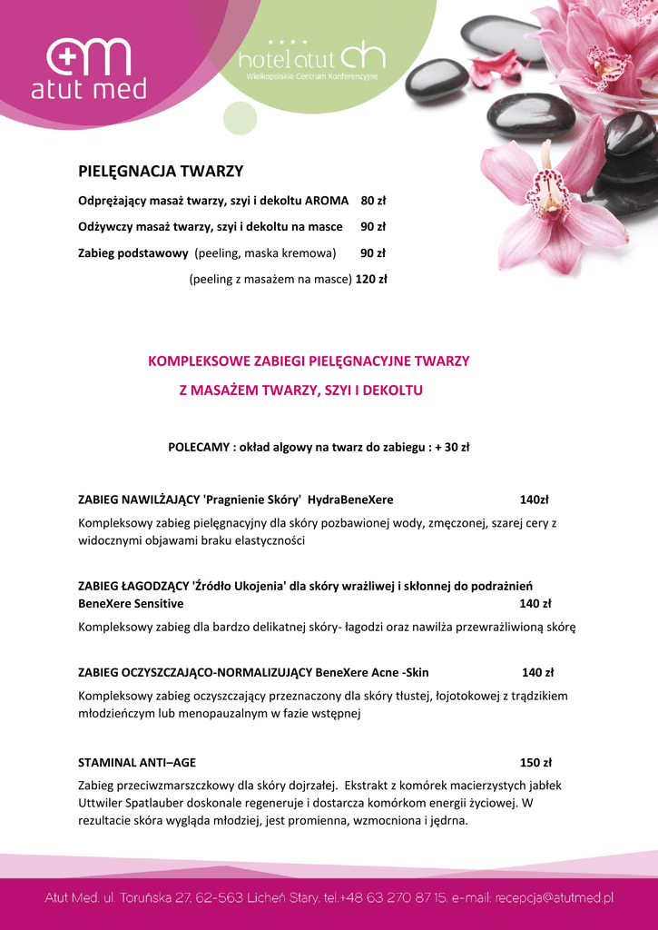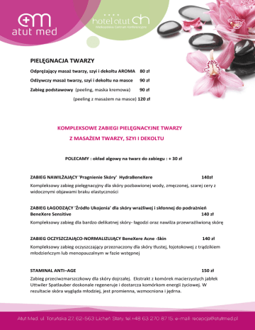 PIELĘGNACJA TWARZY Odprężający masaż twarzy, szyi i dekoltu AROMA 80 zł Odżywczy masaż twarzy, szyi i dekoltu na masce 90 zł Zabieg podstawowy (peeling, maska kremowa) 90 zł (peeling z masażem na masce) 120 zł KOMPLEKSOWE ZABIEGI PIELĘGNACYJNE TWARZY Z MASAŻEM TWARZY, SZYI I DEKOLTU POLECAMY : okład algowy na twarz do zabiegu : + 30 zł ZABIEG NAWILŻAJĄCY 'Pragnienie Skóry' HydraBeneXere 140zł Kompleksowy zabieg pielęgnacyjny dla skóry pozbawionej wody, zmęczonej, szarej cery z widocznymi objawami braku elastyczności ZABIEG ŁAGODZĄCY 'Źródło Ukojenia' dla skóry wrażliwej i skłonnej do podrażnień BeneXere Sensitive 140 zł Kompleksowy zabieg dla bardzo delikatnej skóry- łagodzi oraz nawilża przewrażliwioną skórę ZABIEG OCZYSZCZAJĄCO-NORMALIZUJĄCY BeneXere Acne -Skin 140 zł Kompleksowy zabieg oczyszczający przeznaczony dla skóry tłustej, łojotokowej z trądzikiem młodzieńczym lub menopauzalnym w fazie wstępnej STAMINAL ANTI–AGE 150 zł Zabieg przeciwzmarszczkowy dla skóry dojrzałej. Ekstrakt z komórek macierzystych jabłek Uttwiler Spatlauber doskonale regeneruje i dostarcza komórkom energii życiowej. W rezultacie skóra wygląda młodziej, jest promienna, wzmocniona i jędrna. ZABIEG KOLAGENOWY NA TWARZ 150 zł Kompleksowy zabieg wykorzystujący 100 % naturalny kolagen firmy Colway . Dzięki zabiegowi skóra jest odżywiona, ujędrniona oraz nawilżona. Poprawia spoistość skóry, skóra jest zregenerowana oraz promienna. ZABIEG KOLAGENOWY PRESTIGE – TWARZ ,SZYJA,DEKOLD 200 zł Połączenie kompleksowego zabiegu pielęgnacyjno- regenerującego wraz z dopełnieniem odrobiną luksusu w postaci maski kolagenowej z nanozłotem sprawi, że skóra twarzy odzyska naturalną świetlistość i promienny wygląd. ZABIEG - MASKA Z NANOZŁOTEM 70 zł Zabieg podstawowy (peeling + maska) MASAŻE MASAŻ KLASYCZNY CZĘŚCIOWY 70 zł Masaż mający na celu dotarcie do napiętych partii mięśni pleców, karku i ramion, rozluźnienie ich i przywrócenie dobrego samopoczucia. MASAŻ PLECÓW GORĄCYMI KAMIENIAMI 90zł Jest to masaż wykonywany za pomocą gorących kamieni bazaltowych. Ma na celu ogólne rozluźnienie mięśni, duże przekrwienie miejscowe, podniesienie podstawowej przemiany materii, oczyszczenie organizmu, zwiększenie procesów wymiany tkankowej oraz podniesienie progu odczuwania bólu. MASAŻ RELAKSACYJNY 120 zł To propozycja specjalnie przygotowana dla wszystkich zmęczonych, zapracowanych i zestresowanych osób. Celem tego masażu jest całkowite rozluźnienie ciała i zrelaksowanie umysłu. MASAŻ AROMATERAPEUTYCZNY 130 zł Masaż relaksacyjny, daje upust stresom dnia codziennego. Wonne olejki eteryczne wpływają na umysł i emocjonalny stan człowieka. Masaż ten wykorzystuje lecznicze działanie olejków eterycznych na skórę i na cały organizm. MASAŻ KLASYCZNY CAŁOŚCIOWY 140 zł Masaż oparty na klasycznych technikach. Głęboko relaksujący i odprężający o dość znacznym natężeniu. RYTUALNY MASAŻ ŚWIECĄ 150 zł Zaskakujący, obezwładniający zmysły zapachem i ciepłym dotykiem relaksacyjny masaż ciała. Wykonywany ciepłym woskiem świecy doskonale nawilża skórę. Daj się ponieść marzeniom i poczuj dotyk spa wszystkimi zmysłami. MASAŻ GORĄCYMI KAMIENIAMI 160 zł Masaż gorącymi kamieniami ma działanie relaksacyjne, witalizujące i lecznicze na cały organizm, doskonale likwiduje wszelkie spięcia i bóle mięśni, regenerując całe ciało i umysł. MASAŻ FIRMOWY- LAWENDOWE UKOJENIE (ciało,twarz ,głowa) 200 zł Delikatny, spokojny masaż ciała na bazie olejku lawendowego ,cudownie odprężający masaż głowy oraz uciski odpowiednich punktów na twarzy w połączeniu z aromatem olejku lawendowego spotęgują doznania, uwolnią ciało od napięć i spowodują uczucie całkowitego odprężenia. KĄPIELE PIELEGNACYJNE KĄPIEL PEREŁKOWA 30 zł Kąpiel działa na zasadzie mikro masażu. Kąpiel cudownie odpręża , rozluźnia mięśnie dając odczucie głębokiego rozluźnienia. KĄPIEL SOLANKOWA 30 zł Woda wzbogacona minerałami ma dobroczynne właściwości dla skóry, kości i organów wewnętrznych. Polecana jest osobom często łapiącym infekcje dróg oddechowych. Solanka uspokaja, poprawia nastrój, wycisza. KĄPIEL BOROWINOWA 50 zł Pomagają w leczeniu stanów zapalnych schorzeń kości, mięśni i stawów. Doskonale wpływają na stan skóry, która staje się dzięki nim gładka jak jedwab. OKŁADY BOROWINOWE OKŁAD BOROWINOWY 25 zł