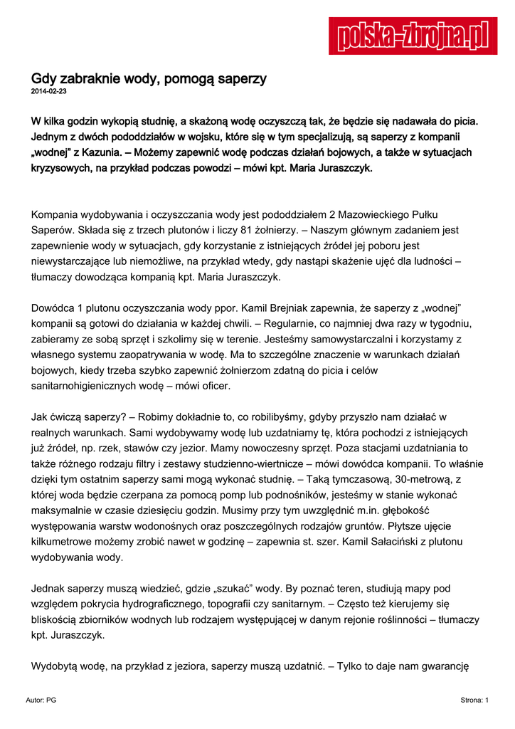Gdy zabraknie wody, pomogą saperzy 2014-02-23 W kilka godzin wykopią studnię, a skażoną wodę oczyszczą tak, że będzie się nadawała do picia. Jednym z dwóch pododdziałów w wojsku, które się w tym specjalizują, są saperzy z kompanii „wodnej” z Kazunia. – Możemy zapewnić wodę podczas działań bojowych, a także w sytuacjach kryzysowych, na przykład podczas powodzi – mówi kpt. Maria Juraszczyk. Kompania wydobywania i oczyszczania wody jest pododdziałem 2 Mazowieckiego Pułku Saperów. Składa się z trzech plutonów i liczy 81 żołnierzy. – Naszym głównym zadaniem jest zapewnienie wody w sytuacjach, gdy korzystanie z istniejących źródeł jej poboru jest niewystarczające lub niemożliwe, na przykład wtedy, gdy nastąpi skażenie ujęć dla ludności – tłumaczy dowodząca kompanią kpt. Maria Juraszczyk. Dowódca 1 plutonu oczyszczania wody ppor. Kamil Brejniak zapewnia, że saperzy z „wodnej” kompanii są gotowi do działania w każdej chwili. – Regularnie, co najmniej dwa razy w tygodniu, zabieramy ze sobą sprzęt i szkolimy się w terenie. Jesteśmy samowystarczalni i korzystamy z własnego systemu zaopatrywania w wodę. Ma to szczególne znaczenie w warunkach działań bojowych, kiedy trzeba szybko zapewnić żołnierzom zdatną do picia i celów sanitarnohigienicznych wodę – mówi oficer. Jak ćwiczą saperzy? – Robimy dokładnie to, co robilibyśmy, gdyby przyszło nam działać w realnych warunkach. Sami wydobywamy wodę lub uzdatniamy tę, która pochodzi z istniejących już źródeł, np. rzek, stawów czy jezior. Mamy nowoczesny sprzęt. Poza stacjami uzdatniania to także różnego rodzaju filtry i zestawy studzienno-wiertnicze – mówi dowódca kompanii. To właśnie dzięki tym ostatnim saperzy sami mogą wykonać studnię. – Taką tymczasową, 30-metrową, z której woda będzie czerpana za pomocą pomp lub podnośników, jesteśmy w stanie wykonać maksymalnie w czasie dziesięciu godzin. Musimy przy tym uwzględnić m.in. głębokość występowania warstw wodonośnych oraz poszczególnych rodzajów gruntów. Płytsze ujęcie kilkumetrowe możemy zrobić nawet w godzinę – zapewnia st. szer. Kamil Sałaciński z plutonu wydobywania wody. Jednak saperzy muszą wiedzieć, gdzie „szukać” wody. By poznać teren, studiują mapy pod względem pokrycia hydrograficznego, topografii czy sanitarnym. – Często też kierujemy się bliskością zbiorników wodnych lub rodzajem występującej w danym rejonie roślinności – tłumaczy kpt. Juraszczyk. Wydobytą wodę, na przykład z jeziora, saperzy muszą uzdatnić. – Tylko to daje nam gwarancję Autor: PG Strona: 1 otrzymania wody odpowiedniej jakości, zgodnej z przepisami sanitarnymi – przekonuje st. kpr. Paweł Fabisiak z plutonu oczyszczania. W takich sytuacjach sercem akcji jest zazwyczaj kontenerowa stacja oczyszczania wody KSW-12. Woda jest w niej filtrowana, i dzięki procesom fizykochemicznym (m.in. koagulacja, adsorpcja, hydroliza, dezynfekcja) traci 80–90% zanieczyszczeń mechanicznych, chemicznych i promieniotwórczych oraz 100% biologicznych. – To nasza najwydajniejsza stacja do uzdatniania. Choć wygląda niepozornie, jest w stanie w godzinę dostarczyć 12 tys. m3 sześciennych wody wolnej od zanieczyszczeń – mówi ppor. Brejniak. Stację można również wykorzystać podczas akcji pomagania ludności. – Wyobraźmy sobie sytuację, gdy w wyniku awarii szpital zostaje pozbawiony wody. Wtedy my możemy wkroczyć do działania. Wykorzystując istniejące ujęcia powierzchniowe i gruntowe oraz nasz sprzęt, możemy oczyścić wodę, i czystą, zdatną do użycia dostarczyć potrzebującym – mówi pani kapitan. To tylko jeden z możliwych scenariuszy działania saperów. Ale podobnych, zrealizowanych już przez kazuńskich saperów, jest więcej. – Podczas powodzi w 2010 roku uzdatnialiśmy wodę w miejscowości Ciężkowice. Rok wcześniej przez dwa miesiące robiliśmy to samo w Łomiankach, gdy doszło do skażenia wody trującymi substancjami – tłumaczy st. kpr. Fabisiak. Wydobyta i oczyszczona przez saperów woda zawsze, zanim trafi do odbiorców, jest badana. W przypadku, gdy jest dostarczana cywilom, kontroluje ją na przykład sanepid. W warunkach poligonowych opinię o jej przydatności do spożycia wydaje polowe laboratorium analizy wody. Wcześniej przeprowadza ono pełną jej ocenę, obejmującą badania dozymetryczne, toksykologiczne, fizykochemiczne i bakteriologiczne. – Musimy mieć pewność, że dostarczona przez nas woda nikomu nie zaszkodzi – mówi kpt. Juraszczyk. Kompania wydobywania i oczyszczania wody szkoli się również do podejmowania działań w ramach wojskowych jednostek odbudowy. Już niebawem pododdział przejdzie certyfikację. Gotowość do działania ma osiągnąć do końca 2014 roku. Wojskowe jednostki odbudowy – to nieetatowe zgrupowania wydzielane z jednostek inżynieryjnych w przypadku wystąpienia klęsk żywiołowych. Zadaniem saperów z tych jednostek będzie odbudowa zniszczonych dróg, mostów i wałów przeciwpowodziowych, ewakuacja ludzi z zalanych terenów, niszczenie zatorów lodowych, a także uzdatnianie skażonej wody. Autor: PG Strona: 2