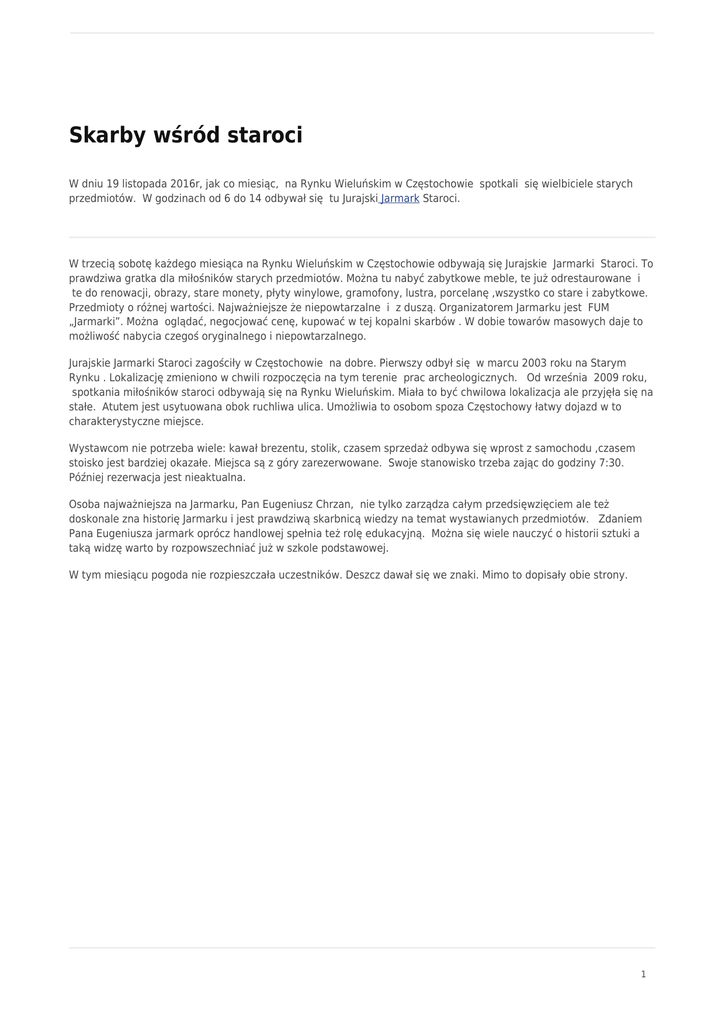 Skarby wśród staroci W dniu 19 listopada 2016r, jak co miesiąc, na Rynku Wieluńskim w Częstochowie spotkali się wielbiciele starych przedmiotów. W godzinach od 6 do 14 odbywał się tu Jurajski Jarmark Staroci. W trzecią sobotę każdego miesiąca na Rynku Wieluńskim w Częstochowie odbywają się Jurajskie Jarmarki Staroci. To prawdziwa gratka dla miłośników starych przedmiotów. Można tu nabyć zabytkowe meble, te już odrestaurowane i te do renowacji, obrazy, stare monety, płyty winylowe, gramofony, lustra, porcelanę ,wszystko co stare i zabytkowe. Przedmioty o różnej wartości. Najważniejsze że niepowtarzalne i z duszą. Organizatorem Jarmarku jest FUM „Jarmarki”. Można oglądać, negocjować cenę, kupować w tej kopalni skarbów . W dobie towarów masowych daje to możliwość nabycia czegoś oryginalnego i niepowtarzalnego. Jurajskie Jarmarki Staroci zagościły w Częstochowie na dobre. Pierwszy odbył się w marcu 2003 roku na Starym Rynku . Lokalizację zmieniono w chwili rozpoczęcia na tym terenie prac archeologicznych. Od września 2009 roku, spotkania miłośników staroci odbywają się na Rynku Wieluńskim. Miała to być chwilowa lokalizacja ale przyjęła się na stałe. Atutem jest usytuowana obok ruchliwa ulica. Umożliwia to osobom spoza Częstochowy łatwy dojazd w to charakterystyczne miejsce. Wystawcom nie potrzeba wiele: kawał brezentu, stolik, czasem sprzedaż odbywa się wprost z samochodu ,czasem stoisko jest bardziej okazałe. Miejsca są z góry zarezerwowane. Swoje stanowisko trzeba zając do godziny 7:30. Później rezerwacja jest nieaktualna. Osoba najważniejsza na Jarmarku, Pan Eugeniusz Chrzan, nie tylko zarządza całym przedsięwzięciem ale też doskonale zna historię Jarmarku i jest prawdziwą skarbnicą wiedzy na temat wystawianych przedmiotów. Zdaniem Pana Eugeniusza jarmark oprócz handlowej spełnia też rolę edukacyjną. Można się wiele nauczyć o historii sztuki a taką widzę warto by rozpowszechniać już w szkole podstawowej. W tym miesiącu pogoda nie rozpieszczała uczestników. Deszcz dawał się we znaki. Mimo to dopisały obie strony. 1 Na terenie targu można wypić kawę, herbatę , zjeść ciepły posiłek. Wszystko to stwarza niepowtarzalny klimat. Zapytałam kupujących co ich sprowadza w to miejsce: Pan Marek - interesuje mnie biała broń. Niestety przychodzę tylko popatrzeć. Ceny takich artykułów przerastają moje możliwości finansowe. Pani Ela - kupiłam bieżnik, będzie jak znalazł na świąteczny stół. 2 Jurajski Jarmark Staroci posiada profil na facebooku . JP 3