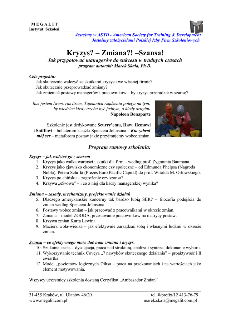 MEGALIT Instytut Szkoleń Jesteśmy w ASTD - American Society for Training & Development Jesteśmy założycielami Polskiej Izby Firm Szkoleniowych Kryzys? – Zmiana?! –Szansa! Jak przygotować managerów do sukcesu w trudnych czasach program autorski: Marek Skała, Ph.D. Cele projektu: Jak skutecznie walczyć ze skutkami kryzysu we własnej firmie? Jak skutecznie przeprowadzać zmiany? Jak zmieniać postawy managerów i pracowników – by kryzys przerodzić w szansę? Raz jestem lwem, raz lisem. Tajemnica rządzenia polega na tym, by wiedzieć kiedy trzeba być jednym, a kiedy drugim. Napoleon Bonaparte Szkolenie jest dedykowane Scurry’emu, Haw, Hemowi i Sniffowi – bohaterom książki Spencera Johnsona – Kto zabrał mój ser – metaforom postaw jakie przyjmujemy wobec zmian. Program ramowy szkolenia: Kryzys – jak widzieć go z sensem 1. Kryzys jako walka wartości i skutki dla firm – według prof. Zygmunta Baumana. 2. Kryzys jako zjawisko ekonomiczne czy społeczne – od Edmunda Phelpsa (Nagroda Nobla), Petera Schiffa (Prezes Euro Pacific Capital) do prof. Witolda M. Orłowskiego. 3. Kryzys po chińsku – zagrożenie czy szansa? 4. Krzywa „eS-owa” – i co z niej dla kadry managerskiej wynika? Zmiana – zasady, mechanizmy, projektowanie działań 5. Dlaczego amerykańskie koncerny tak bardzo lubią SER? – filozofia podejścia do zmian według Spencera Johnsona. 6. Postawy wobec zmian – jak pracować z pracownikami w okresie zmian. 7. Zmiana – model ZGODA, przesuwanie pracowników na matrycy postaw. 8. Krzywa zmian Kurta Lewina 9. Macierz wola-wiedza – jak efektywnie zarządzać sobą i własnymi ludźmi w okresie zmian. Szansa – co efektywnego może dać nam zmiana i kryzys. 10. Szukanie szans – dysocjacja, praca nad strukturą, analiza i synteza, dokonanie wyboru. 11. Wykorzystanie technik Coveya „7 nawyków skutecznego działania” – proaktywość i II ćwiartka. 12. Model „poziomów logicznych Diltsa – praca na przekonaniach i na wartościach jako element motywowania. Wszyscy uczestnicy szkolenia dostaną Certyfikat „Ambasador Zmian” 31-455 Kraków, ul. Ułanów 46/20 www.megalit.com.pl tel. 0/prefix/12 413-76-79 [email protected]