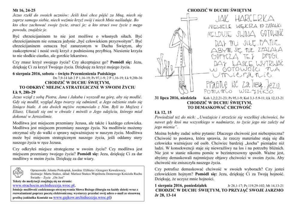 Mt 16, 24-25 Jezus rzekł do swoich uczniów: Jeśli ktoś chce pójść za Mną, niech się zaprze samego siebie, niech weźmie krzyż swój i niech Mnie naśladuje. Bo kto chce zachować swoje życie, straci je; a kto straci swe życie z mego powodu, znajdzie je. CHODZIĆ W DUCHU ŚWIĘTYM Być chrześcijaninem to nie jest możliwe o własnych siłach. Być chrześcijaninem nie oznacza jedynie „być człowiekiem przyzwoitym”. Być chrześcijaninem oznacza być zanurzonym w Duchu Świętym, aby zaakceptować i nosić swój krzyż z podniesioną przyłbicą. Niesienie krzyża to nie słodkie ciastko, ale gorzkie lekarstwo. Czy znasz krzyż swojego życia? Czy akceptujesz go? Pomódl się: Jezu, dziękuję Ci za krzyż Twojego życia. Dziękuję za krzyż mojego życia. 6 sierpnia 2016, sobota – święto Przemienienia Pańskiego Dn 7,9-14 lub 2 P 1,16-19; Ps 97,1-9; 2 P 1,16-19; Łk 9,28b-36 CHODZIĆ W DUCHU ŚWIĘTYM, TO ODKRYĆ MIEJSCA STRATEGICZNE W SWOIM ŻYCIU Łk 9, 28b-29 Jezus wziął z sobą Piotra, Jana i Jakuba i wyszedł na górę, aby się modlić. Gdy się modlił, wygląd Jego twarzy się odmienił, a Jego odzienie stało się lśniąco białe. A oto dwóch mężów rozmawiało z Nim. Byli to Mojżesz i Eliasz. Ukazali się oni w chwale i mówili o Jego odejściu, którego miał dokonać w Jerozolimie. Modlitwa jest miejscem przemiany Jezusa, ale także i każdego człowieka. Modlitwa jest miejscem przemiany naszego życia. Na modlitwie możemy otrzymać siły do walki o sprawy najważniejsze w naszym życiu. Modlitwa może być miejscem strategicznym naszego życia, jeśli oddamy stery naszego życia w ręce Jezusa. Czy odkryłeś miejsce strategiczne w swoim życiu? Czy modlitwa jest miejscem przemiany twojego życia? Pomódl się: Jezu, dziękuję Ci za dar modlitwy w moim życiu. Dziękuję za dar wiary. Opracowała: Jolanta Prokopiuk, korekta: Elżbieta i Grzegorz Kowalewscy, ilustracje: Marta Stańco, skład: Mariusz Stańco.Wspólnota Domowego Kościoła Ruchu Światło – Życie „On Jest” Teksty do medytacji znajdują się na stronie: www.strachocin.archidiecezja.wroc.pl. Istnieje możliwość codziennego otrzymywania Słowa Bożego (liturgia na każdy dzień) wraz z rozważaniami poprzez pocztę elektroniczną; wystarczy przesłać swój adres e-mail ze stosowną prośbą (zakładka Kontakt na www.gajkow.archidiecezja.wroc.pl) 31 lipca 2016, niedziela Koh 1,2;2,21-23; Ps 95,1-9; Kol 3,1-5.9-11; Łk 12,13-21 CHODZIĆ W DUCHU ŚWIĘTYM, TO DEMASKOWAĆ CHCIWOŚĆ Łk 12, 15 Powiedział też do nich: „Uważajcie i strzeżcie się wszelkiej chciwości, bo nawet gdy ktoś ma wszystkiego w nadmiarze, to życie jego nie zależy od jego mienia”. Można byłoby zadać sobie pytanie: Dlaczego chciwość jest niebezpieczna? Chciwość to postawa, która sprawia, że rzeczy materialne stają się dla człowieka ważniejsze od osób. Chciwiec bardziej „kocha” pieniądze niż ludzi. W konsekwencji staje się niewrażliwy na los i na potrzeby bliźnich. Nie jest w stanie nikomu pomóc w bezinteresowny sposób. Ważne jest, abyśmy demaskowali najmniejsze objawy chciwości w swoim życiu. Aby chciwość nie zniszczyła naszego życia. Czy potrafisz demaskować chciwość w swoich wyborach? Czy jesteś człowiekiem hojnym? Pomódl się: Jezu, dziękuję Ci za Twoją hojność. Dziękuję, że uczysz mnie hojności. 1 sierpnia 2016, poniedziałek Jr 28,1-17; Ps 119,29-102; Mt 14,13-21 CHODZIĆ W DUCHU ŚWIĘTYM, TO PRZYJĄĆ SWOJE JARZMO Jr 28, 13-14 Pan skierował do Jeremiasza następujące słowo: „Idź i powiedz Chananiaszowi: Tak mówi Pan: Połamałeś jarzmo drewniane, lecz przygotowałeś zamiast niego jarzmo żelazne. Tak bowiem mówi Pan Zastępów, Bóg Izraela: Wkładam jarzmo żelazne na kark wszystkich tych narodów, aby służyły Nabuchodonozorowi, królowi babilońskiemu, i były mu poddane; także dzikie zwierzęta mu poddaję”. Jarzma, które człowiek może nosić są różne. Jarzmo to uciążliwość życia, która jest nam potrzebna do wewnętrznego zahartowania. Jarzmo to trud prowadzący do zmiany naszego życia, aby miało właściwy smak. Ważne jest, abyśmy zaakceptowali nasze jarzmo i odkryli jego błogosławieństwo. Potrzebujemy dziękować Bogu za swoje jarzmo, abyśmy wzrastali w zaufaniu do Niego. Czy wiesz co jest jarzmem twojego życia? Co z nim robisz? Pomódl się: Jezu, dziękuję za jarzmo mojego życia. Dziękuję, że moje jarzmo pozwala mi dorastać do nowych wyzwań. 2 sierpnia 2016, wtorek Jr 30,1-22; Ps 102,16-29; Mt 14,22-36 CHODZIĆ W DUCHU ŚWIĘTYM, TO SPOGLĄDAĆ NA SWOJE ŻYCIE OCZAMI WIARY Jr 30, 12-15 Dotkliwa jest twoja klęska, nieuleczalna twoja rana. Nikt się nie troszczy o twoją sprawę, nie ma lekarstwa, by cię uzdrowić. Wszyscy, co cię kochali, zapomnieli o tobie, nie szukają już ciebie, gdyż cię dotknąłem, tak jak się rani wroga, surową karą. Przez wielką twą nieprawość pomnożyły się twoje grzechy. Dlaczego krzyczysz z powodu twej rany, że ból twój nie da się uśmierzyć? Z powodu twej wielkiej nieprawości i licznych twoich grzechów to ci uczyniłem. Potrzebujemy być wrażliwi na Boże wezwania i napomnienia. Wielokrotnie nie potrafimy ich właściwie odczytać. Będziemy winić wszystkich dookoła, ale nie zobaczymy, że to my jesteśmy wezwani do nawrócenia. Bóg oczekuje od nas zaufania i posłuszeństwa, ponieważ jest to droga konieczna do wzrostu. Trudne sytuacje, choroby nie są przypadkowe. Potrzebujemy spoglądać na swoje życie oczami wiary. Czy prosisz Jezusa o „oczy wiary”? Czy potrafisz spoglądać na swoje trudne wydarzenia oczami wiary? Pomódl się: Jezu, dziękuję Ci za „oczy serca”. Dziękuję za dar nawracania się. 3 sierpnia 2016, środa Jr 31,1-7; Ps: Jr 31,10-13; Mt 15,21-28 CHODZIĆ W DUCHU ŚWIĘTYM, TO UCZYĆ SIĘ POSŁUSZEŃSTWA Jr 31, 2-4 Tak mówi Pan: Znajdzie łaskę na pustyni naród, co wyszedł cało spod miecza; Izrael pójdzi