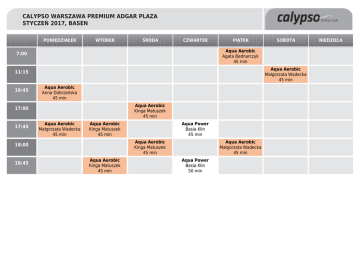 CALYPSO WARSZAWA PREMIUM ADGAR PLAZA STYCZEŃ 2017, BASEN PONIEDZIAŁEK WTOREK ŚRODA CZWARTEK PIĄTEK Aqua Aerobic Agata Bednarczyk 45 min 7:00 Aqua Aerobic Małgorzata Wadecka 45 min 11:15 16:45 Aqua Aerobic Anna Dobrzańska 45 min Aqua Aerobic Kinga Matuszek 45 min 17:00 17:45 Aqua Aerobic Małgorzata Wadecka 45 min Aqua Aerobic Kinga Matuszek 45 min Aqua Power Basia Klin 45 min Aqua Aerobic Kinga Matuszek 45 min 18:00 18:45 SOBOTA Aqua Aerobic Kinga Matuszek 45 min Aqua Aerobic Małgorzata Wadecka 45 min Aqua Power Basia Klin 50 min NIEDZIELA
