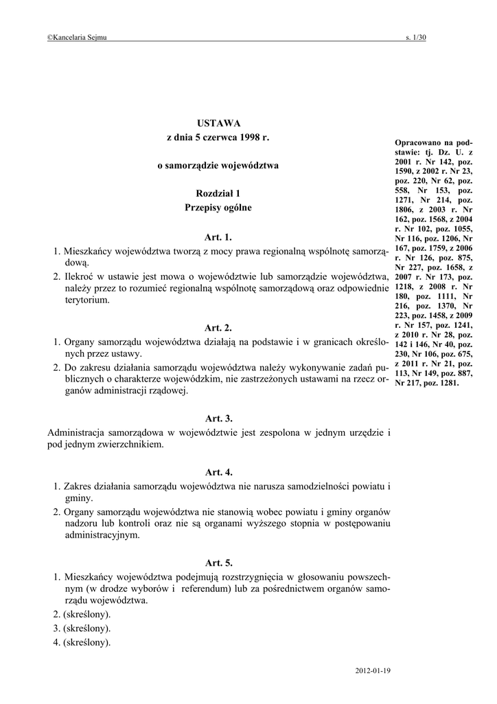 ©Kancelaria Sejmu s. 1/30 USTAWA z dnia 5 czerwca 1998 r. o samorządzie województwa Rozdział 1 Przepisy ogólne Art. 1. 1. Mieszkańcy województwa tworzą z mocy prawa regionalną wspólnotę samorządową. 2. Ilekroć w ustawie jest mowa o województwie lub samorządzie województwa, należy przez to rozumieć regionalną wspólnotę samorządową oraz odpowiednie terytorium. Art. 2. 1. Organy samorządu województwa działają na podstawie i w granicach określonych przez ustawy. 2. Do zakresu działania samorządu województwa należy wykonywanie zadań publicznych o charakterze wojewódzkim, nie zastrzeżonych ustawami na rzecz organów administracji rządowej. Art. 3. Administracja samorządowa w województwie jest zespolona w jednym urzędzie i pod jednym zwierzchnikiem. Art. 4. 1. Zakres działania samorządu województwa nie narusza samodzielności powiatu i gminy. 2. Organy samorządu województwa nie stanowią wobec powiatu i gminy organów nadzoru lub kontroli oraz nie są organami wyższego stopnia w postępowaniu administracyjnym. Art. 5. 1. Mieszkańcy województwa podejmują rozstrzygnięcia w głosowaniu powszechnym (w drodze wyborów i referendum) lub za pośrednictwem organów samorządu województwa. 2. (skreślony). 3. (skreślony). 4. (skreślony). 2012-01-19 Opracowano na podstawie: tj. Dz. U. z 2001 r. Nr 142, poz. 1590, z 2002 r. Nr 23, poz. 220, Nr 62, poz. 558, Nr 153, poz. 1271, Nr 214, poz. 1806, z 2003 r. Nr 162, poz. 1568, z 2004 r. Nr 102, poz. 1055, Nr 116, poz. 1206, Nr 167, poz. 1759, z 2006 r. Nr 126, poz. 875, Nr 227, poz. 1658, z 2007 r. Nr 173, poz. 1218, z 2008 r. Nr 180, poz. 1111, Nr 216, poz. 1370, Nr 223, poz. 1458, z 2009 r. Nr 157, poz. 1241, z 2010 r. Nr 28, poz. 142 i 146, Nr 40, poz. 230, Nr 106, poz. 675, z 2011 r. Nr 21, poz. 113, Nr 149, poz. 887, Nr 217, poz. 1281. ©Kancelaria Sejmu s. 2/30 5. Zasady i tryb przeprowadzania referendum określa odrębna ustawa. Art. 6. 1. Samorząd województwa: 1) wykonuje określone ustawami zadania publiczne w imieniu własnym i na własną odpowiedzialność, 2) dysponuje mieniem wojewódzkim, 3) prowadzi samodzielnie gospodarkę finansową na podstawie budżetu. 2. Województwo ma osobowość prawną. 3. Samodzielność województwa podlega ochronie sądowej. Art. 7. 1. Ustrój województwa jako jednostki samorządu terytorialnego określa statut województwa uchwalony po uzgodnieniu z Prezesem Rady Ministrów. 2. Statut i jego zmiany podlegają ogłoszeniu w wojewódzkim dzienniku urzędowym. Art. 8. 1. W celu wykonywania zadań województwo tworzy wojewódzkie samorządowe jednostki organizacyjne oraz może zawierać umowy z innymi podmiotami. 2. Województwo może zawierać z innymi województwami oraz jednostkami lokalnego samorządu terytorialnego z obszaru województwa porozumienia w sprawie powierzenia prowadzenia zadań publicznych. 3. Do porozumień stosuje się odpowiednio przepisy ustawy z dnia 8 marca 1990 r. o samorządzie gminnym (Dz. U. z 2001 r. Nr 142, poz. 1591). 4. Porozumienia, o których mowa w ust. 2, podlegają ogłoszeniu w wojewódzkim dzienniku urzędowym. Art. 8a. Województwa mogą sobie wzajemnie bądź innym jednostkom samorządu terytorialnego udzielać pomocy, w tym pomocy finansowej. Art. 8b. 1. Województwa mogą tworzyć stowarzyszenia, w tym również z gminami i powiatami. 2. Do stowarzyszeń, o których mowa w ust. 1, stosuje się odpowiednio przepisy ustawy z dnia 7 kwietnia 1989 r. – Prawo o stowarzyszeniach (Dz. U. z 2001 r. Nr 79, poz. 855), z tym że dla założenia stowarzyszenia wymaganych jest co najmniej 3 założycieli. Art. 9. Samorząd województwa, na podstawie upoważnień ustawowych, stanowi akty prawa miejscowego obowiązujące na obszarze województwa. Art. 10. Odrębna ustawa określa siedziby władz samorządu województwa. 2012-01-19 ©Kancelaria Sejmu s. 3/30 Art. 10a. 1. W przypadkach przewidzianych ustawą oraz w innych sprawach ważnych dla województwa mogą być przeprowadzane na jego terytorium konsultacje z mieszkańcami województwa. 2. Zasady i tryb przeprowadzania konsultacji z mieszkańcami województwa określa uchwała sejmiku województwa. Rozdział 2 Zakres działalności Art. 11. 1. Samorząd województwa określa strategię rozwoju województwa, uwzględniającą w szczególności następujące cele: 1) pielęgnowanie polskości oraz rozwój i kształtowanie świadomości narodowej, obywatelskiej i kulturowej mieszkańców, a także pielęgnowanie i rozwijanie tożsamości lokalnej, 2) pobudzanie aktywności gospodarczej, 3) podnoszenie poziomu konkurencyjności i innowacyjności gospodarki województwa, 4) zachowanie wartości środowiska kulturowego i przyrodniczego przy uwzględnieniu potrzeb przyszłych pokoleń, 5) kształtowanie i utrzymanie ładu przestrzennego. 1a. (uchylony). 1b. W strategii rozwoju województwa wydziela się okres niewykraczający poza okres objęty aktualnie obowiązującą średniookresową strategią rozwoju kraju. 1c. Strategia rozwoju województwa zawiera: 1) diagnozę sytuacji społeczno-gospodarczej województwa, 2) określenie celów strategicznych polityki rozwoju województwa, 3) określenie kierunków działań podejmowanych przez samorząd województwa dla osiągnięcia celów strategicznych polityki rozwoju województwa, 4) (uchylony), 5) (uchylony). 1d. Strategia rozwoju województwa uwzględnia cele średniookresowej strategii rozwoju kraju, krajowej strategii rozwoju regionalnego, a także odpowiednich strategii ponadregionalnych oraz jest spójna z planem zagospodarowania przestrzennego województwa. 1e. Samorząd województwa, każdorazowo w terminie 9 miesięcy od dnia wejścia w życie uchwały o przyjęciu lub aktualizacji strategii lub planu, o których mowa w ust. 1d, dostosowuje do nich strategię rozwoju województwa. 2. Samorząd województwa prowadzi politykę rozwoju województwa, na którą składa się: 1) tworzenie warunków rozwoju gospodarczego, w tym kreowan