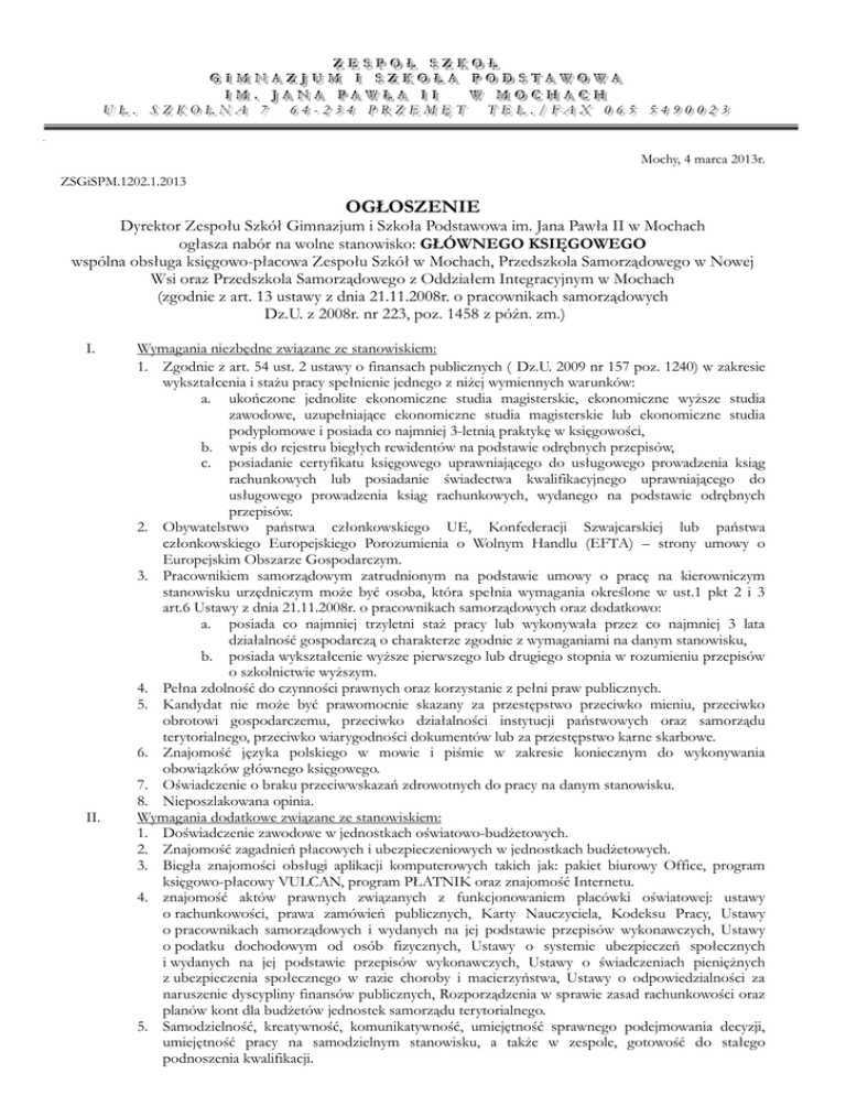 ZZ E E SS PP Ó Ó ŁŁ SS ZZ KK Ó Ó ŁŁ G I M N A Z J U M I S Z K O Ł A P G I M N A Z J U M I S Z K O Ł A PO OD D SS TT AA W WO OW W AA II M W M .. JJ AA N N AA PP AA W W ŁŁ AA II II W M MO O CC H H AA CC H H U U LL .. SS ZZ KK OO LL N NA A 77 66 44 -- 22 33 44 PP RR ZZ EE M M ĘĘ TT TT EE LL .. // FF A AX X 00 66 55 55 44 99 00 00 22 33 Mochy, 4 marca 2013r. ZSGiSPM.1202.1.2013 OGŁOSZENIE Dyrektor Zespołu Szkół Gimnazjum i Szkoła Podstawowa im. Jana Pawła II w Mochach ogłasza nabór na wolne stanowisko: GŁÓWNEGO KSIĘGOWEGO wspólna obsługa księgowo-płacowa Zespołu Szkół w Mochach, Przedszkola Samorządowego w Nowej Wsi oraz Przedszkola Samorządowego z Oddziałem Integracyjnym w Mochach (zgodnie z art. 13 ustawy z dnia 21.11.2008r. o pracownikach samorządowych Dz.U. z 2008r. nr 223, poz. 1458 z późn. zm.) I. II. Wymagania niezbędne związane ze stanowiskiem: 1. Zgodnie z art. 54 ust. 2 ustawy o finansach publicznych ( Dz.U. 2009 nr 157 poz. 1240) w zakresie wykształcenia i stażu pracy spełnienie jednego z niżej wymiennych warunków: a. ukończone jednolite ekonomiczne studia magisterskie, ekonomiczne wyższe studia zawodowe, uzupełniające ekonomiczne studia magisterskie lub ekonomiczne studia podyplomowe i posiada co najmniej 3-letnią praktykę w księgowości, b. wpis do rejestru biegłych rewidentów na podstawie odrębnych przepisów, c. posiadanie certyfikatu księgowego uprawniającego do usługowego prowadzenia ksiąg rachunkowych lub posiadanie świadectwa kwalifikacyjnego uprawniającego do usługowego prowadzenia ksiąg rachunkowych, wydanego na podstawie odrębnych przepisów. 2. Obywatelstwo państwa członkowskiego UE, Konfederacji Szwajcarskiej lub państwa członkowskiego Europejskiego Porozumienia o Wolnym Handlu (EFTA) – strony umowy o Europejskim Obszarze Gospodarczym. 3. Pracownikiem samorządowym zatrudnionym na podstawie umowy o pracę na kierowniczym stanowisku urzędniczym może być osoba, która spełnia wymagania określone w ust.1 pkt 2 i 3 art.6 Ustawy z dnia 21.11.2008r. o pracownikach samorządowych oraz dodatkowo: a. posiada co najmniej trzyletni staż pracy lub wykonywała przez co najmniej 3 lata działalność gospodarczą o charakterze zgodnie z wymaganiami na danym stanowisku, b. posiada wykształcenie wyższe pierwszego lub drugiego stopnia w rozumieniu przepisów o szkolnictwie wyższym. 4. Pełna zdolność do czynności prawnych oraz korzystanie z pełni praw publicznych. 5. Kandydat nie może być prawomocnie skazany za przestępstwo przeciwko mieniu, przeciwko obrotowi gospodarczemu, przeciwko działalności instytucji państwowych oraz samorządu terytorialnego, przeciwko wiarygodności dokumentów lub za przestępstwo karne skarbowe. 6. Znajomość języka polskiego w mowie i piśmie w zakresie koniecznym do wykonywania obowiązków głównego księgowego. 7. Oświadczenie o braku przeciwwskazań zdrowotnych do pracy na danym stanowisku. 8. Nieposzlakowana opinia. Wymagania dodatkowe związane ze stanowiskiem: 1. Doświadczenie zawodowe w jednostkach oświatowo-budżetowych. 2. Znajomość zagadnień płacowych i ubezpieczeniowych w jednostkach budżetowych. 3. Biegła znajomości obsługi aplikacji komputerowych takich jak: pakiet biurowy Office, program księgowo-płacowy VULCAN, program PŁATNIK oraz znajomość Internetu. 4. znajomość aktów prawnych związanych z funkcjonowaniem placówki oświatowej: ustawy o rachunkowości, prawa zamówień publicznych, Karty Nauczyciela, Kodeksu Pracy, Ustawy o pracownikach samorządowych i wydanych na jej podstawie przepisów wykonawczych, Ustawy o podatku dochodowym od osób fizycznych, Ustawy o systemie ubezpieczeń społecznych i wydanych na jej podstawie przepisów wykonawczych, Ustawy o świadczeniach pieniężnych z ubezpieczenia społecznego w razie choroby i macierzyństwa, Ustawy o odpowiedzialności za naruszenie dyscypliny finansów publicznych, Rozporządzenia w sprawie zasad rachunkowości oraz planów kont dla budżetów jednostek samorządu terytorialnego. 5. Samodzielność, kreatywność, komunikatywność, umiejętność sprawnego podejmowania decyzji, umiejętność pracy na samodzielnym stanowisku, a także w zespole, gotowość do stałego podnoszenia kwalifikacji. III. Zakres zadań 1. Prowadzi rachunkowość jednostki. 2. Wykonuje dyspozycje środkami pieniężnymi. 3. Dokonuje wstępnej kontroli zgodności operacji gospodarczych i finansowych z planem finansowym. 4. Dokonuje wstępnej kontroli kompletności i rzetelności dokumentów dotyczących operacji gospodarczych i finansowych. 5. Podpisuje dokumenty dotyczące poszczególnych operacji. 6. Podejmuje decyzje wstępnych zastrzeżeń do przedstawionej oceny prawidłowości merytorycznej tej operacji i jej zgodności z prawem. 7. Zapewnia, że zobowiązania wynikające z operacji mieszczą się w planie finansowym oraz harmonogramie dochodów i wydatków, a jednostka posiada środki finansowe na ich pokrycie. 8. W razie nieprawidłowości, zwraca dokument właściwemu rzeczowo pracownikowi, a w razie ich nie usunięcia odmawia podpisania dokumentu, o czym zawiadamia pisemnie dyrektora. 9. Sporządza prawidłowo, terminowo i zgodnie z obowiązującymi przepisami sprawozdania finansowe składane przez szkołę na zewnątrz. 10. Nadzoruje gospodarkę kasową szkoły, przeprowadza kontrolę kasy szkoły i intendenta. 11. Sporządza, sprawdza i zatwierdza listy płac. 12. Nalicza podatek od wynagrodzeń, zgodnie z obowiązującymi w tym zakresie przepisami. 13. Prowadzi wszelkie rozliczenia szkoły z budżetem państwa, ZUS i innymi instytucjami, z którymi Szkoła współpracuje w zakresie finansowym. 14. Czuwa nad zabezpieczeniem środków finansowych na fundusz socjalny, mieszkaniowy, nadzoruje prawidłowość wypłat z tych funduszów określonych i zatwierdzonych przez Dyrektora Szkoły. 15. Należycie przechowuje i zabezpiecza dokumenty księgowe, księgi rachunkowe oraz sprawozdania fi