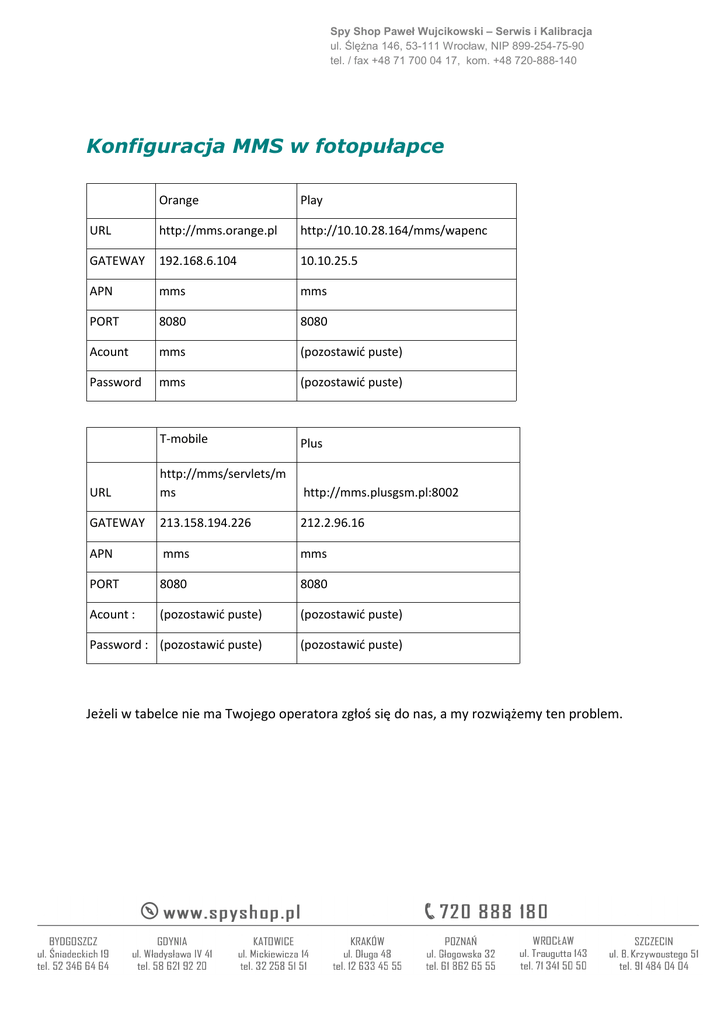 Spy Shop Paweł Wujcikowski – Serwis i Kalibracja ul. Ślężna 146, 53-111 Wrocław, NIP 899-254-75-90 tel. / fax +48 71 700 04 17, kom. +48 720-888-140 Konfiguracja MMS w fotopułapce Orange Play URL http://mms.orange.pl http://10.10.28.164/mms/wapenc GATEWAY 192.168.6.104 10.10.25.5 APN mms mms PORT 8080 8080 Acount mms (pozostawić puste) Password mms (pozostawić puste) T-mobile Plus URL http://mms/servlets/m ms http://mms.plusgsm.pl:8002 GATEWAY 213.158.194.226 212.2.96.16 APN mms mms PORT 8080 8080 Acount : (pozostawić puste) (pozostawić puste) Password : (pozostawić puste) (pozostawić puste) Jeżeli w tabelce nie ma Twojego operatora zgłoś się do nas, a my rozwiążemy ten problem.