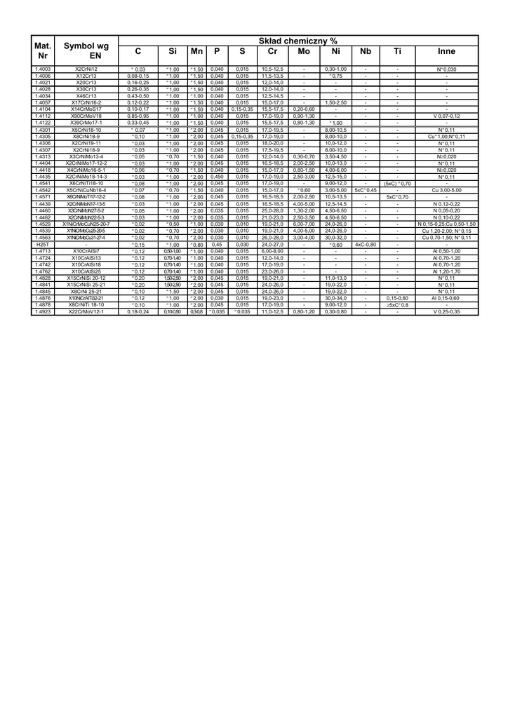 Mat. Nr Symbol wg EN C Si Mn P S 1.4003 1.4006 1.4021 1.4028 1.4034 1.4057 1.4104 1.4112 1.4122 1.4301 1.4305 1.4306 1.4307 1.4313 1.4404 1.4418 1.4435 1.4541 1.4542 1.4571 1.4439 1.4460 1.4462 1.4529 1.4539 1.4563 H25T 1.4713 1.4724 1.4742 1.4762 1.4828 1.4841 1.4845 1.4876 1.4878 1.4923 X2CrNi12 X12Cr13 X20Cr13 X30Cr13 X46Cr13 X17CrNi16-2 X14CrMoS17 X90CrMoV18 X39CrMo17-1 X5CrNi18-10 X8CrNi18-9 X2CrNi19-11 X2CrNi18-9 X3CrNiMo13-4 X2CrNiMo17-12-2 X4CrNiMo16-5-1 X2CrNiMo18-14-3 X6CrNiTi18-10 X5CrNiCuNb16-4 X6CrNiMoTi17-12-2 X2CrNiMoN17-13-5 X3CrNiMoN27-5-2 X2CrNiMoN22-5-3 X1NiCrMoCuN25-20-7 X1NiCrMoCu25-20-5 X1NiCrMoCu31-27-4 X10CrAlSi7 X10CrAlSi13 X10CrAlSi18 X10CrAlSi25 X15CrNiSi 20-12 X15CrNiSi 25-21 X8CrNi 25-21 X10NiCrAlTi32-21 X8CrNiTi 18-10 X22CrMoV12-1 ≤ 0,03 0,08-0,15 0,16-0,25 0,26-0,35 0,43-0,50 0,12-0,22 0,10-0,17 0,85-0,95 0,33-0,45 ≤ 0,07 ≤0,10 ≤0,03 ≤0,03 ≤0,05 ≤0,03 ≤0,06 ≤0,03 ≤0,08 ≤0,07 ≤0,08 ≤0,03 ≤0,05 ≤0,03 ≤0,02 ≤0,02 ≤0,02 ≤0,15 ≤0,12 ≤0,12 ≤0,12 ≤0,12 ≤0,20 ≤0,20 ≤0,10 ≤0,12 ≤0,10 0,18-0,24 ≤1,00 ≤1,00 ≤1,00 ≤1,00 ≤1,00 ≤1,00 ≤1,00 ≤1,00 ≤1,00 ≤1,00 ≤1,00 ≤1,00 ≤1,00 ≤0,70 ≤1,00 ≤0,70 ≤1,00 ≤1,00 ≤0,70 ≤1,00 ≤1,00 ≤1,00 ≤1,00 ≤0,50 ≤0,70 ≤0,70 ≤1,00 0,50-1,00 0,70-1,40 0,70-1,40 0,70-1,40 1,50-2,50 1,50-2,50 ≤1,50 ≤1,00 ≤1,00 0,10-0,50 ≤1,50 ≤1,50 ≤1,50 ≤1,50 ≤1,00 ≤1,50 ≤1,50 ≤1,00 ≤1,50 ≤2,00 ≤2,00 ≤2,00 ≤2,00 ≤1,50 ≤2,00 ≤1,50 ≤2,00 ≤2,00 ≤1,50 ≤2,00 ≤2,00 ≤2,00 ≤2,00 ≤1,00 ≤2,00 ≤2,00 ≤0,80 ≤1,00 ≤1,00 ≤1,00 ≤1,00 ≤2,00 ≤2,00 ≤2,00 ≤2,00 ≤2,00 0,3-0,8 0,040 0,040 0,040 0,040 0,040 0,040 0,040 0,040 0,040 0,045 0,045 0,045 0,045 0,040 0,045 0,040 0,450 0,045 0,040 0,045 0,045 0,035 0,035 0,030 0,030 0,030 0,45 0,040 0,040 0,040 0,040 0,045 0,045 0,045 0,030 0,045 ≤0,035 0,015 0,015 0,015 0,015 0,015 0,015 0,15-0,35 0,015 0,015 0,015 0,15-0,35 0,015 0,015 0,015 0,015 0,015 0,015 0,015 0,015 0,015 0,015 0,015 0,015 0,010 0,010 0,010 0,030 0,015 0,015 0,015 0,015 0,015 0,015 0,015 0,015 0,015 ≤0,035 Skład chemiczny % Cr Mo Ni 10,5-12,5 11,5-13,5 12,0-14,0 12,0-14,0 12,5-14,5 15,0-17,0 15,5-17,5 17,0-19,0 15,5-17,5 17,0-19,5 17,0-19,0 18,0-20,0 17,5-19,5 12,0-14,0 16,5-18,5 15,0-17,0 17,0-19,0 17,0-19,0 15,0-17,0 16,5-18,5 16,5-18,5 25,0-28,0 21,0-23,0 19,0-21,0 19,0-21,0 26,0-28,0 24,0-27,0 6,00-8,00 12,0-14,0 17,0-19,0 23,0-26,0 19,0-21,0 24,0-26,0 24,0-26,0 19,0-23,0 17,0-19,0 11,0-12,5 0,20-0,60 0,90-1,30 0,80-1,30 0,30-0,70 2,00-2,50 0,80-1,50 2,50-3,00 ≤0,60 2,00-2,50 4,00-5,00 1,30-2,00 2,50-3,50 6,00-7,00 4,00-5,00 3,00-4,00 0,80-1,20 0,30-1,00 ≤0,75 1,50-2,50 ≤1,00 8,00-10,5 8,00-10,0 10,0-12,0 8,00-10,0 3,50-4,50 10,0-13,0 4,00-6,00 12,5-15,0 9,00-12,0 3,00-5,00 10,5-13,5 12,5-14,5 4,50-6,50 4,50-6,50 24,0-26,0 24,0-26,0 30,0-32,0 ≤0,60 11,0-13,0 19,0-22,0 19,0-22,0 30,0-34,0 9,00-12,0 0,30-0,80 Nb Ti Inne 5xC≤0,45 4xC-0,80 - (5xC) ≤0,70 5xC≤0,70 0,15-0,60 ≥5xC≤0,8 - N≤0,030 V 0,07-0,12 N≤0,11 Cu≤1,00;N≤0,11 N≤0,11 N≤0,11 N≥0,020 N≤0,11 N≥0,020 N≤0,11 Cu 3,00-5,00 N 0,12-0,22 N 0,05-0,20 N 0,10-0,22 N 0,15-0,25;Cu 0,50-1,50 Cu 1,20-2,00; N≤0,15 Cu 0,70-1,50; N≤0,11 Al 0,50-1,00 Al 0,70-1,20 Al 0,70-1,20 Al 1,20-1,70 N≤0,11 N≤0,11 N≤0,11 Al 0,15-0,60 V 0,25-0,35