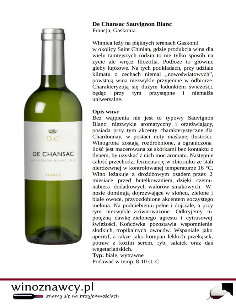 De Chansac Sauvignon Blanc Francja, Gaskonia Winnica leży na pięknych terenach Gaskonii w okolicy Saint Chinian, gdzie produkcja wina dla wielu tamtejszych rodzin to nie tylko sposób na życie ale wręcz filozofia. Podłoże to głównie gleby łupkowe. Na tych podkładach, przy udziale klimatu o cechach niemal „nowoświatowych”, powstają wina niezwykle przyjemne w odbiorze. Charakteryzują się dużym ładunkiem świeżości, będąc przy tym przystępne i niemalże uniwersalne. Opis wina: Bez wątpienia nie jest to typowy Sauvignon Blanc: niezwykle aromatyczny i orzeźwiający, posiada przy tym akcenty charakterystyczne dla Chardonnay, w postaci nuty maślanej tłustości. Winogrona zostają rozdrobnione, a ograniczona ilość jest macerowana ze skórkami bez kontaktu z tlenem, by uzyskać z nich moc aromatu. Następnie całość przechodzi fermentację w zbiorniku ze stali nierdzewnej w kontrolowanej temperaturze 16 °C. Wino leżakuje z drożdżowym osadem przez 2 miesiące przed butelkowaniem, dzięki czemu nabiera dodatkowych walorów smakowych. W nosie dominują dojrzewające w słońcu, zielone i białe owoce, przyozdobione akcentem soczystego melona. Na podniebieniu pełne i dojrzałe, a przy tym niezwykle zrównoważone. Odkryjemy tu potężną dawkę zielonego agrestu i cytrusowej świeżości. Końcówka pozostawia wspomnienie słodkich, tropikalnych owoców. Wspaniałe jako aperitif, a także jako kompan lekkich przekąsek, potraw z kozim serem, ryb, sałatek oraz dań wegetariańskich. Typ: białe, wytrawne Podawać w temp. 8-10 st. C