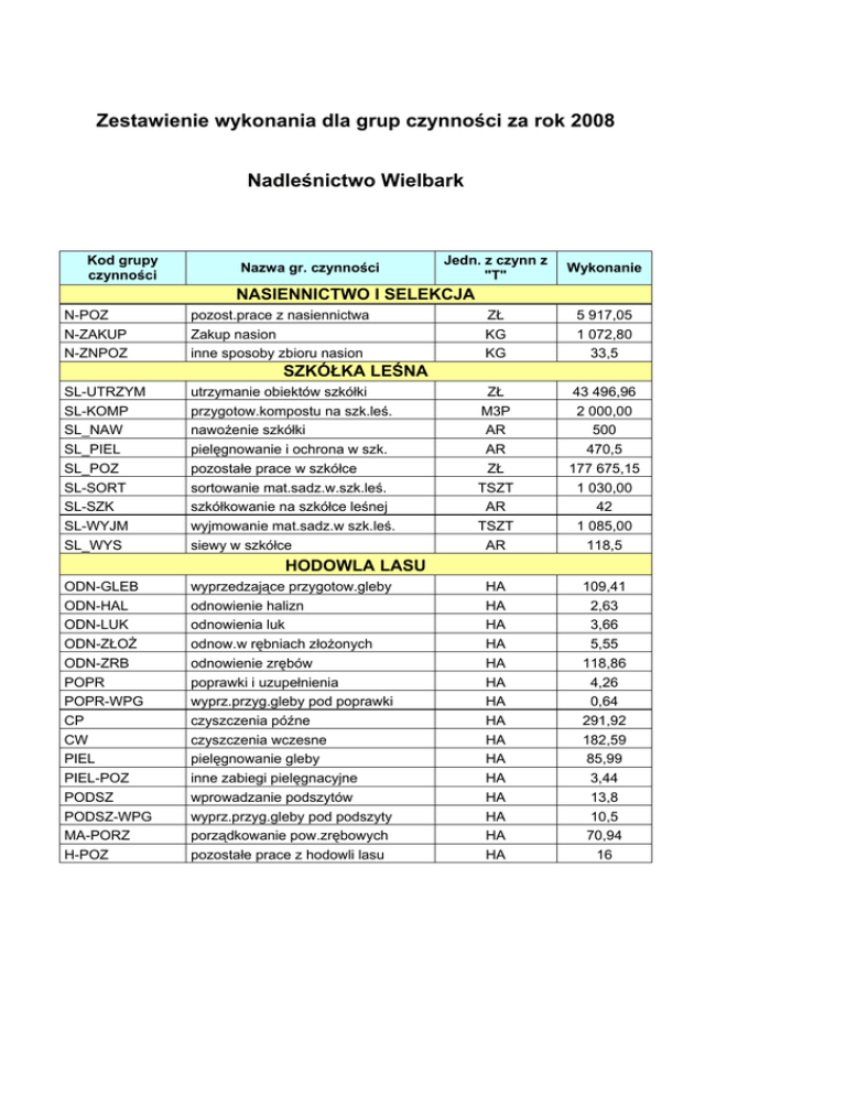 Zestawienie wykonania dla grup czynności za rok 2008 Nadleśnictwo Wielbark Kod grupy czynności Nazwa gr. czynności Jedn. z czynn z "T" Wykonanie NASIENNICTWO I SELEKCJA N-POZ N-ZAKUP N-ZNPOZ pozost.prace z nasiennictwa Zakup nasion inne sposoby zbioru nasion ZŁ KG KG 5 917,05 1 072,80 33,5 ZŁ M3P AR AR ZŁ TSZT AR TSZT AR 43 496,96 2 000,00 500 470,5 177 675,15 1 030,00 42 1 085,00 118,5 HA HA HA HA HA HA HA HA HA HA HA HA HA HA HA 109,41 2,63 3,66 5,55 118,86 4,26 0,64 291,92 182,59 85,99 3,44 13,8 10,5 70,94 16 SZKÓŁKA LEŚNA SL-UTRZYM SL-KOMP SL_NAW SL_PIEL SL_POZ SL-SORT SL-SZK SL-WYJM SL_WYS utrzymanie obiektów szkółki przygotow.kompostu na szk.leś. nawożenie szkółki pielęgnowanie i ochrona w szk. pozostałe prace w szkółce sortowanie mat.sadz.w.szk.leś. szkółkowanie na szkółce leśnej wyjmowanie mat.sadz.w szk.leś. siewy w szkółce HODOWLA LASU ODN-GLEB ODN-HAL ODN-LUK ODN-ZŁOŻ ODN-ZRB POPR POPR-WPG CP CW PIEL PIEL-POZ PODSZ PODSZ-WPG MA-PORZ H-POZ wyprzedzające przygotow.gleby odnowienie halizn odnowienia luk odnow.w rębniach złożonych odnowienie zrębów poprawki i uzupełnienia wyprz.przyg.gleby pod poprawki czyszczenia późne czyszczenia wczesne pielęgnowanie gleby inne zabiegi pielęgnacyjne wprowadzanie podszytów wyprz.przyg.gleby pod podszyty porządkowanie pow.zrębowych pozostałe prace z hodowli lasu Kod grupy czynności Nazwa gr. czynności Jedn. z czynn z "T" Wykonanie SZT SZT HM HA HA HA SZT SZT HA HA ZŁ M3 ZŁ SZT SZT KG HA HA 58 433 85,82 12,24 66,19 132,98 70 83 4 061,10 181,8 37 096,02 213 1 448,00 540 6 173,00 558 0,33 2,25 SZT SZT ZŁ KMTR HA ZŁ SZT SZT ZŁ KMTR SZT 3 286 17 455,57 2,6 53,55 13 362,30 1 1 839,14 213 32 OCHRONA LASU O-PROGND O-PROGNŚ O-GRODZN O-SPAŁM O-ZGRYZC O-ZWRYJM O-ZWWTÓRF O-ZWWTÓRK O-ZWWTÓRT O-ZWGRZBD O-POZ O-SMIECI O-PROGRAM O-BUDKIN O-BUDKIS O-DOKARM O-EKOTON O-REMIZS poszukiw.na d-wach próbnych poszukiwania w ściole grodzenie upraw ochr.mech.przed spałowaniem ochr.chem.przed zgryzaniem zwalcz.ryjkowców mechanicznie zwal.szkod,wtór.-pułapki fero. zwal.szkod.wtór.-pułapki klas. zwal.szkod.wtór.-drzewa troć. zwal.biol.grzyb.-pozost.dstany inne prace z ochrony lasu Sprzątanie śmieci z teren.leśn wyk.dod.oprac.do prog.ochr.prz wieszanie budek lęg.nowych konserwacja budek lęgowych dokarmianie ptaków kształtow. granicy ekotonowej pielęgnacja,konserwacja remiz OCHRONA P-POŻ P-BAZA P-INFO P-INNE P-PASYS P-PORZ P-PROGNOZ P-PUNKTŁ P-PUNKTO P-POŻAR UT-DOJPOZ UT-WODA Wyposaż,utrz.,eksp.sprzęt.ppoż tablice informac.,ostrzegawcze inne zabiegi utrzymanie pasów p-poż porządkowanie terenu Progn,monitor stan.zagroż.ppoż punkty łączności alarmowej punkty obserwacyjne gaszenie, dogaszanie pożarzysk Utrzymanie dojazdów pożarowych Utrzym.istn.punktów czerp.wody UTRZYMANIE OBIEKTÓW LEŚNYCH UT-DROGIL UT-MEL UT-TURYST UT-MIEEDU utrzymanie dróg leśnych utrz. urządzeń melioracyjnych utrzymanie obiektów turystyczn tworz/utrzym.ścieżek przyr-leś KMTR ZŁ SZT SZT 41,47 30574,94 7 1 Kod grupy czynności Nazwa gr. czynności Jedn. z czynn z "T" Wykonanie POZYSKANIE I ZRYWKA DREWNA CP-P IAK IB IBK IIA IIIA IIIAK IIIAU IVDK PR PTP PTPK PTW TPP TPPK TWP TWPK ZM POZ-P pozyskanie w CP rębnia Ia stan sił wyż rębnia Ib rębnia Ib stan sił wyż rębnia IIa rębnia IIIa rębnia IIIa stan sił wyż rębnia IIIa uprzątające rębnia IVd stan sił wyż przygodne-rębne przygodne-trzebieże późne przygodne trz póź.stan sił wyż przygodne-trzebieże wczesne trzebież późna pozytywna trzebież póź. poz.stan sił wyż trzebież wczesna pozytywna trzebież wcze.poz.stan sił wyż zrywka mechaniczna inne czynności z pozysk.d-wna B-ZALE B-POPRAW B-GUPRAW B-ZGRYZC B-PIELE zalesienia kosztem budżetu poprawki kosztem budżetu grodz. upraw kosztem budżetu ochr.chem.przed zgryzan.budżet pielęgn. upraw kosztem budżetu M3 M3 M3 M3 M3 M3 M3 M3 M3 M3 M3 M3 M3 M3 M3 M3 M3 M3 ZŁ 535,9 909,48 19 316,09 6 711,73 186,69 1 225,70 120,13 1 107,91 12 429,75 2 262,73 10 212,84 221,1 11 332,35 24 671,32 301,97 11 306,56 336,06 103 123,02 84 138,77 HA HA HA HA HA 10,01 0,54 0,12 11,21 17,01 SZT 90 ZADANIA BUDŻETOWE DZIAŁALNOŚĆ UBOCZNA CHOINKIL pozysk.choin.,stroi.w lesie DANE DOTYCZĄCE ZWIERZĄT ŁOWNYCH a) zwierzyna gruba Gatunki zwierząt łownych b) zwierzyna drobna Szacowana liczebność zwierzyny na 10.03.2008 r. Gatunki zwierząt łownych Szt. 1. Łosie razem 6 Szacowana liczebność zwierzyny na 10.03.2008 r. Szt. 5. Lisy 240 2. Jelenie razem 384 6. Jenoty 65 3. Sarny razem 4. Dziki razem 714 213 7. Borsuki 8. Kuny razem w tym: Tumak Kamionka 9. Norki amerykańskie 10. Tchórze zwycz. 11. Zające szaraki 12. Kuropatwy 29 88 64 24 228 83 364 205 WYKONANIE INWESTYCJI I REMONTÓW Remonty i modernizacja osad funkcyjnych Wykonano remonty w 10 budynkach mieszkalnych (koszt netto= 140 827,51 zł.) oraz w 3 budynkach gospodarczych (koszt netto= 62 333,16 zł.). Ponadto poddano modernizacji budynek gospodarczy podleśniczówki (budynek z 1895r.), którego koszt wyniósł 66 354,49 zł. Budowa nowych leśniczówek W roku 2008 rozpoczęto budowę leśniczówki Róklas, na którą wydano kwotę netto 451 495,24 zł. Termin zakończenia zadania do dnia 30.09.2009r. Budowa i remonty dróg W 2008r. w nadleśnictwie Wielbark nie powstały żadne nowe drogi leśne, nie były też prowadzone remonty. Bieżące utrzymanie dróg leśnych zostało ograniczone do nawiezienia żwiru i wyprofilowaniu nawierzchni na niewielkich odcinkach. Inne Zakupiono urządzenia do wykorzystania w Szkółce Leśnej tj.: agregat pompowy i przystawkę opryskiwacza (koszt netto= 57 839,12 zł.). Ponadto zakupiono sprzęt komputerowy i oprogramowania (koszt netto= 24 591,77 zł.)