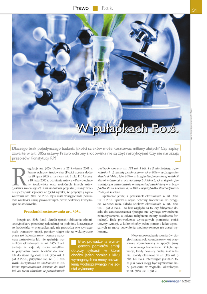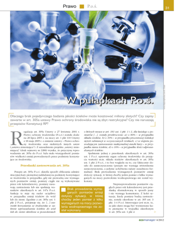 P.o.ś. 31 W pułapkach P.o.ś. www.depositphotos.com/S. Duda Prawo Dlaczego brak pojedynczego badania jakości ścieków może kosztować miliony złotych? Czy zapisy zawarte w art. 305a ustawy Prawo ochrony środowiska nie są zbyt restrykcyjne? Czy nie naruszają przepisów Konstytucji RP? R o których mowa w art. 181 ust. 1 pkt. 1 i 3, dla każdego z pomiarów […], zostały przekroczone: a) o 80% – w przypadku składu ścieków, b) o 10% – w przypadku procentowej redukcji stężeń substancji w oczyszczanych ściekach, c) w stopniu powodującym zastosowanie maksymalnej stawki kary – w przypadku stanu ścieków, d) o 10% – w przypadku ilości odprowadzanych ścieków. Spełnienie jednej z przesłanek określonych w art. 305a ust. 1 P.o.ś. uprawnia organ ochrony środowiska do przyjęcia wartości m.in. składu ścieków określonych w art. 305a ust. 1 pkt 2 P.o.ś., i to bez względu na to, czy faktycznie doPrzesłanki zastosowania art. 305a szło do zanieczyszczenia (przepis nie wymaga stwierdzenia zanieczyszczenia, a jedynie uchybienia natury zasadniczo formalnej). Brak prowadzenia wymaganych pomiarów emisji Przepis art. 305a P.o.ś. określa sposób obliczania adminidotyczy sytuacji, w której choćby jeden pomiar z kilku wymastracyjnej kary pieniężnej nakładanej na podmioty korzystające ganych na mocy pozwolenia wodnoprawnego nie został wyze środowiska w przypadku, gdy nie prowadzą one wymagakonany. nych pomiarów emisji, pomiary ciągłe nie są wykonywane Nieprzeprowadzenie pomiarów ciąprzez rok kalendarzowy, pomiary nasugłych przez rok kalendarzowy jest przewają zastrzeżenia lub nie spełniają waBrak prowadzenia wymasłanką sformułowaną w sposób jasny runków określonych w art. 147a P.o.ś. ganych pomiarów emisji i nie wymaga komentarza. Z kolei sySankcja ta staje się nader uciążliwa dotyczy sytuacji, w której tuacje, kiedy pomiary budzą zastrzeżew przypadku emisji ścieków do wód nia, zostały określone w art. 305 ust. 3 lub do ziemi. Zgodnie z art. 305a ust. 1 choæby jeden pomiar z kilku pkt. 1-4 P.o.ś. Interesujące jest m.in. to, pkt 2 P.o.ś., przyjmuje się, że: […] wawymaganych na mocy pozwoza jaki okres mogą być wymierzane karunki korzystania ze środowiska w zalenia wodnoprawnego nie zory pieniężne w wypadku określonym kresie wprowadzania ścieków do wód sta³ wykonany. w art. 305a ust. 1 pkt 2. lub do ziemi określone w pozwoleniach egulacja art. 305a Ustawy z 27 kwietnia 2001 r. Prawo ochrony środowiska (P.o.ś.) została dodana 28 lipca 2005 r. na mocy art. 1 pkt 110 Ustawy z 18 maja 2005 r. o zmianie ustawy – Prawo ochrony środowiska oraz niektórych innych ustaw („ustawa zmieniająca”). Z uzasadnienia projektu „ustawy zmieniającej” (druk sejmowy nr 3386) wynika, że przyczyną wprowadzenia art. 305a do P.o.ś. była mała wiarygodność pomiarów wielkości emisji prowadzonych przez podmioty korzystające ze środowiska. ecomanager 6/2012 Prawo 32 Kary za uchybienia Regulacja dotycząca administracyjnych kar pieniężnych, wymierzanych w sytuacji określonej w art. 305 ust. 1 pkt 2 P.o.ś., nie odnosi się do okresu, za który mają być wymierzone, a jedynie do określonych uchybień w prowadzeniu pomiarów ścieków. Kara ponoszona jest m.in. za brak pojedynczego badania jakości ścieków. W tym zakresie możliwe jest odwołanie się do przepisów dotyczących pozwoleń wodnoprawnych na odprowadzanie ścieków do wód lub do ziemi. Z regulacji tych wynika, że pozwolenia określają sposób i zakres prowadzenia pomiarów ilości i jakości ścieków wprowadzanych do wód lub do ziemi, o ile wykraczają one poza wymagania wynikające z przepisów (art. 128 ust. 1 pkt 9 ustawy Prawo wodne). W praktyce w pozwoleniach wodnoprawnych określa się częstotliwość badań poprzez wskazanie okresu, którego badania dotyczą, np. raz na kwartał. Z tego względu można przyjąć, że administracyjna kara pieniężna wymierzona na podstawie art. 305a ust. 1 pkt 2 P.o.ś. może dotyczyć takiego okresu, jakiego dotyczą pomiary, których zaniechano (np. kwartału). Doktryna zdaje się potwierdzać taką interpretację1. Należy w tym kontekście wskazać na niespójność tego przepisu z art. 302 ust. 1 P.o.ś., który zasadniczo wiąże wymierzenie administracyjnej kary pieniężnej (kary biegnącej) z okresem, w którym stwierdzono naruszenia, podczas gdy art. 305a ust. 1 pkt 2 P.o.ś. wiąże wymiar administracyjnej kary pieniężnej z konkretnym uchybieniem. Instrument mobilizujący? P.o.ś. Warto dodać, iż nie istnieją instrumenty kwestionowania wysokości przyjętego na podstawie tych regulacji zanieczyszczenia. Przepis art. 305a ust. 1 pkt 2 P.o.ś. nie wprowadza bowiem domniemania ładunku zanieczyszczenia, ale określa go w sposób stanowczy2. Przyjmuje się, że brak pomiarów jest równoznaczny z zanieczyszczeniem, niezależnie od rzeczywistości. Problem okazuje się tym większy, że regulacja zawarta w art. 305a ust. 1 pkt 2 P.o.ś. jest jednolicie i ściśle interpretowana w sądownictwie administracyjnym. Niestety, wykładnia prezentowana przez judykaturę jest niekorzystna dla podmiotów korzystających ze środowiska. W orzecznictwie przyjmuje się bowiem, że brak wykonania pomiarów jakości ścieków uprawnia do zastosowania art. 305a ust. 1 pkt 2 P.o.ś. bez względu na to, czy zanieczyszczenie rzeczywiście miało miejsce [np. wyrok WSA w Warszawie z 21 stycznia 2010 r., sygn. akt IV SA/Wa 1945/09 (orzeczenie prawomocne), wyrok WSA w Warszawie z 3 marca 2010 r., sygn. akt IV SA/Wa 931/10 (orzeczenie prawomocne), wyrok WSA w Warszawie z 29 czerwca 2011 r., sygn. akt IV SA/Wa 604/11 (orzeczenie nieprawomocne), wyrok WSA w Warszawie z 1 czerwca 2011 r., sygn. akt IV SA/Wa 578/11 (orzeczenie nieprawomocne)]. Co więcej, podkreśla się, iż organ ochrony środowiska jest zobowiązany do nałożenia na podmiot korzystający ze środowiska administracyjnej kary pieniężnej w przypadku st