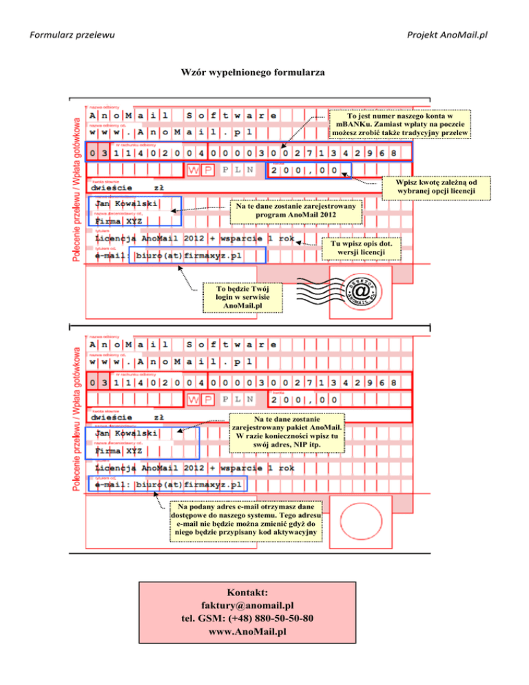 Formularz przelewu Projekt AnoMail.pl Wzór wype nionego formularza To jest numer naszego konta w mBANKu. Zamiast wp aty na poczcie mo-esz zrobi/ tak-e tradycyjny przelew Wpisz kwot1 zale-n8 od wybranej opcji licencji Na te dane zostanie zarejestrowany program AnoMail 2012 Tu wpisz opis dot. wersji licencji To b1dzie Twój login w serwisie AnoMail.pl Na te dane zostanie zarejestrowany pakiet AnoMail. W razie konieczno2ci wpisz tu swój adres, NIP itp. Na podany adres e-mail otrzymasz dane dost1powe do naszego systemu. Tego adresu e-mail nie b1dzie mo-na zmieni/ gdy- do niego b1dzie przypisany kod aktywacyjny Kontakt: [email protected] tel. GSM: (+48) 880-50-50-80 www.AnoMail.pl