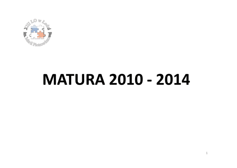 MATURA 2010 - 2014 1 Podstawy prawne Rozporządzenia MEN : • Z dnia 30 kwietnia 2007r. Dz. U. Nr 83 • Z dnia 25 września 2008r. Dz. U. Nr 178 • Z dnia 31 marca 2009r. Dz. U. Nr 58 • Z dnia 28 sierpnia 2007r., które jest podstawą do konstruowania arkuszy egzaminacyjnych. • Z dnia 28 sierpnia 2007r., wprowadza nową strukturę standardów wymagań egzaminacyjnych z matematyki. Deklaracje • Uczeń składa deklarację wstępną do 30 września 2009r. • Zaświadczenie z Poradni Psychologiczno - Pedagogicznej Dwie funkcje egzaminu maturalnego Obowiązkowe: 1) ……….. 2) ……….. 3) ……….. Tu rozstrzygamy CZY MATURZYSTA ZDAŁ MATURĘ Dodatkowe: 0, 1, 2 lub 3 przedmioty do wyboru W celach rekrutacji Egzamin obowiązkowy Obowiązkowe są 3 przedmioty zdawane na poziomie podstawowym język polski (pisemny i ustny) matematyka (pisemny) język obcy nowożytny (pisemny i ustny) Próg zaliczeniowy 30% Uwaga ! Te same przedmioty tzn. polski, matematyka, język obcy, mogą być zdawane także jako dodatkowe ale tylko na poziomie rozszerzonym. Dla przedmiotów dodatkowych nie obowiązuje próg zaliczeniowy Klasy dwujęzyczne W przypadku klas dwujęzycznych język zdawany jest na poziomie dwujęzycznym. Jeżeli uczeń jest w klasie dwujęzycznej i ubiega się o Attestation to może, ale nie musi wybrać arkusz w języku francuskim z matematyki, pomimo że matematyka jest obowiązkowa. Może wybrać inny przedmiot, który miał nauczany w języku francuskim, ale przechodzi oczywiście przez arkusz w języku polskim (podstawowy bądź rozszerzony) i musi uzyskać min.30%. STRUKTURA EGZAMINU MATURALNEGO 2010 - 1014 CZĘŚĆ USTNA Obowiązkowa min. 30% Część obowiązkowa: • Język polski (jednakowy dla wszystkich) – prezentacja • Język obcy nowożytny – poziom podstawowy, poziom dwujęzyczny (klasy dwujęzyczne) Część pisemna obowiązkowa min.30% • Język polski – poziom podstawowy • Język obcy nowożytny – poziom podstawowy, poziom dwujęzyczny (dla klas dwujęzycznych) • Matematyka – poziom podstawowy Egzaminy dodatkowe 0, 1, 2, 3 Część ustna • język obcy nowożytny - ten sam co w części obowiązkowej – poziom rozszerzony. • język obcy nowożytny – inny niż w części obowiązkowej – poziom podstawowy albo rozszerzony Egzaminy dodatkowe 0, 1, 2, 3 Część pisemna przedmioty z części obowiązkowych tzn. język polski, matematyka, język obcy – tylko poziom rozszerzony. przedmioty dodatkowe określone w rozporządzeniu MEN: biologia, chemia, filozofia, fizyka i astronomia, geografia, historia, historia muzyki, historia sztuki, informatyka, język łaciński i kultura antyczna, język obcy nowożytny (inny niż w części obowiązkowej), WOS, wiedza o tańcu (poziom podstawowy albo rozszerzony) Laureaci i finaliści Olimpiad Przedmiotowych Laureaci i finaliści Olimpiad przedmiotowych z list MEN zwolnieni są z egzaminu ustnego i pisemnego i otrzymują wynik 100%. Zdają egzamin ustny z języka francuskiego – na podstawie porozumienia –Ambasada Francji INFORMACJE www.men.gov.pl www.cke.edu.pl www.komisja.pl www.13lo.edu.pl