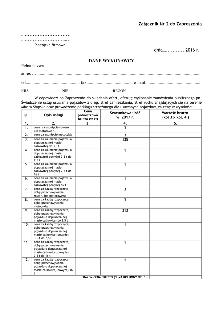 Załącznik Nr 2 do Zaproszenia …............................ ….......................…... Pieczątka firmowa dnia…........... 2016 r. DANE WYKONAWCY Pełna nazwa …......…........................………………………………………………………………… adres ….................................................................................................................................................. tel................................................ fax......................................... e-mail................................................. KRS.................................. NIP............................................... REGON ……………………………… W odpowiedzi na Zaproszenie do składania ofert, oferuję wykonanie zamówienia publicznego pn. Świadczenie usług usuwania pojazdów z dróg, stref zamieszkania, stref ruchu znajdujących się na terenie Miasta Słupska oraz prowadzenie parkingu strzeżonego dla usuwanych pojazdów, za cenę w wysokości: Opis usługi Cena jednostkowa brutto (w zł) Szacunkowa ilość w 2017 r. Wartość brutto (kol 3 x kol. 4 ) 1. 2. 3. cena za usunięcie roweru lub motoroweru cena za usunięcie motocykla 4. 3 5. 1. Lp. 2. 3. 4. 5. 6. 7. 8. 9. 10. 11. 12. cena za usunięcie pojazdu o dopuszczalnej masie całkowitej do 3,5 t cena za usunięcie pojazdu o dopuszczalnej masie całkowitej powyżej 3,5 t do 7,5 t cena za usunięcie pojazdu o dopuszczalnej masie całkowitej powyżej 7,5 t do 16 t cena za usunięcie pojazdu o dopuszczalnej masie całkowitej powyżej 16 t cena za każdą rozpoczętą dobę przechowywania roweru lub motoroweru cena za każdą rozpoczętą dobę przechowywania motocykla cena za każdą rozpoczętą dobę przechowywania pojazdu o dopuszczalnej masie całkowitej do 3,5 t cena za każdą rozpoczętą dobę przechowywania pojazdu o dopuszczalnej masie całkowitej powyżej 3,5 t do 7,5 t cena za każdą rozpoczętą dobę przechowywania pojazdu o dopuszczalnej masie całkowitej powyżej 7,5 t do 16 t cena za każdą rozpoczętą dobę przechowywania pojazdu o dopuszczalnej masie całkowitej powyżej 16 t 3 135 1 1 1 3 3 313 1 1 1 RAZEM CENA BRUTTO (SUMA KOLUMNY NR. 5): netto: ............................................ podatek VAT (....%)...................... brutto:........................................... słownie:........................................................................................… Oferowane ceny jednostkowe brutto za holowanie pojazdów nie mogą przekroczyć 80% cen wskazanych w Uchwale Nr XVIII/201/15 Rady Miejskiej w Słupsku z dnia 25 listopada 2015 r. w sprawie ustalenia wysokości opłat za usunięcie i przechowywanie pojazdu usuniętego z drogi oraz wysokości kosztów powstałych w razie odstąpienia od usunięcia pojazdu w 2016 roku. 1. Oświadczam, że posiadam wiedzę i doświadczenie oraz dysponuję odpowiednim potencjałem technicznym oraz osobami zdolnymi do wykonania zamówienia. 2. Oświadczam, że zapoznałem się z treścią Zaproszenia do składania ofert i nie wnoszę do niego zastrzeżeń oraz uzyskałem konieczne informacje do przygotowania oferty. 3. Zobowiązuję się do wykonania zamówienia sukcesywnie od dnia 01.01.2017 r. do dnia 31.12.2017 r. 4. Oświadczam, że zamówienie przyjmuję do realizacji bez zastrzeżeń. 5. Oświadczam, że jestem związany ofertą przez 30 dni kalendarzowych, licząc od dnia otwarcia ofert. 6. Oświadczam, że zawarty w Zaproszeniu do składania ofert projekt umowy został przeze mnie zaakceptowany i zobowiązuję się w przypadku wyboru mojej oferty do zawarcia umowy w brzmieniu ustalonym przez Zamawiającego. 7. Akceptuję 30 - dniowy termin płatności, licząc od daty dostarczenia do Zamawiającego prawidłowo wystawionej faktury VAT. 8. Oświadczam,że zamówienie wykonam samodzielnie/przy udziale podwykonawców*, którym zamierzam powierzyć wykonanie części zamówienia:.................................................... 9. Oświadczam, że oferta nie zawiera informacji stanowiących tajemnicę przedsiębiorstwa w rozumieniu przepisów o zwalczaniu nieuczciwej konkurencji./* 10. Oświadczam, że oferta zawiera informacje stanowiące tajemnicę przedsiębiorstwa w rozumieniu przepisów o zwalczaniu nieuczciwej konkurencji./* Informacje takie zawarte są w następujących dokumentach: ............................................................................................................. ............................................................................................................. ...................................................................................................... 11. Oferta zawiera ............... ponumerowanych stron. * Niepotrzebne skreślić POUCZENIE: Art. 297 § 1 KODEKSU KARNEGO: Kto, w celu uzyskania dla siebie lub kogo innego (…) zamówienia publicznego, przedkłada podrobiony, przerobiony, poświadczający nieprawdę albo nierzetelny dokument albo nierzetelne, pisemne oświadczenie dotyczące okoliczności o istotnym znaczeniu dla uzyskania (…) zamówienia, podlega karze pozbawienia wolności od 3 miesięcy do lat 5. .............................. dnia .............................. ............................................................... podpis upoważnionego przedstawiciela Wykonawcy