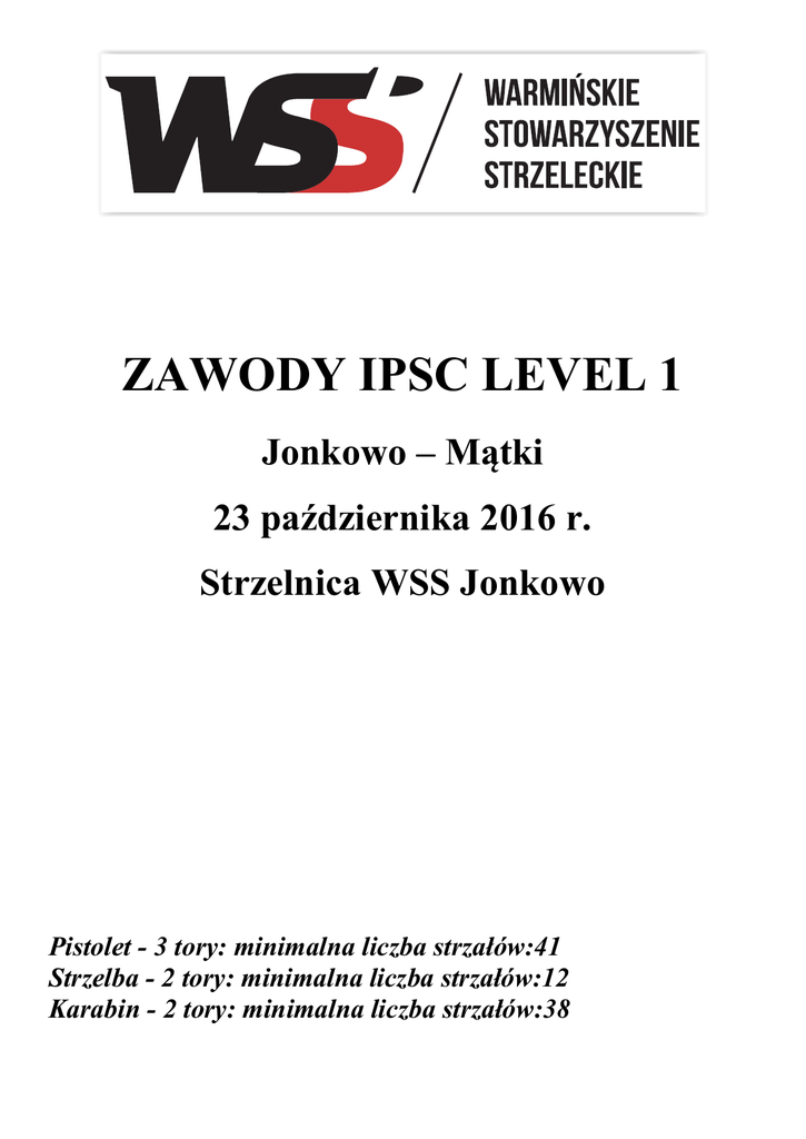 ZAWODY IPSC LEVEL 1 Jonkowo – Mątki 23 października 2016 r. Strzelnica WSS Jonkowo Pistolet - 3 tory: minimalna liczba strzałów:41 Strzelba - 2 tory: minimalna liczba strzałów:12 Karabin - 2 tory: minimalna liczba strzałów:38 1. Strzelba - amunicja śrutowa. NUMER TORU Rodzaj toru Tor krótki. Liczba i rodzaj celów 4 cele metalowe IPSC Mini Popper, 2 cele metalowe płytki IPSC. Minimalna liczba strzałów 6. Pozycja startowa Start z wyznaczonego miejsca. Zawodnik stoi wyprostowany przodem do kulochwytu głównego trzymając strzelbę obiema rękami , kolba dotyka biodra, kabłąk spustu skierowany ku dołowi, wylot lufy skierowany w stronę kulochwytu głównego . Stan broni Broń niezaładowana. Sygnał startowy Sygnał dźwiękowy timera. Procedura Kąty bezpieczeństwa Po sygnale startowym ostrzelać cele w dowolny sposób i w dowolnej kolejności nie opuszczając wyznaczonego obszaru. Maksymalny kąt odchylenia lufy w kierunku lewo-prawo wynosi 90° mierzony od przodu zawodnika ustawionego dokładnie w kierunku środka strzelnicy (kulochwytu). Kąt pionowy jest ograniczony wysokością kulochwytu. 2. Strzelba - amunicja śrutowa. NUMER TORU Rodzaj toru Tor krótki. Liczba i rodzaj celów 3 cele metalowe IPSC Mini Popper, 3 cele metalowe płytki IPSC. Minimalna liczba strzałów 6. Pozycja startowa Stan broni Sygnał startowy Procedura Kąty bezpieczeństwa Start z wyznaczonego miejsca. Zawodnik stoi wyprostowany przodem do kulochwytu głównego trzymając strzelbę obiema rękami , kolba dotyka biodra, kabłąk spustu skierowany ku dołowi, wylot lufy skierowany w stronę kulochwytu głównego. Broń załadowana - magazynek załadowany, komora załadowana, bezpiecznik włączony. Sygnał dźwiękowy timera. Po sygnale startowym ostrzelać cele w dowolny sposób i w dowolnej kolejności nie opuszczając wyznaczonego obszaru. Maksymalny kąt odchylenia lufy w kierunku lewo-prawo wynosi 90° mierzony od przodu zawodnika ustawionego dokładnie w kierunku środka strzelnicy (kulochwytu). Kąt pionowy jest ograniczony wysokością kulochwytu. NUMER TORU 3.Karabin. Rodzaj toru Tor długi. Liczba i rodzaj celów 8 tarcz IPSC, 7 tarcz No-shoot. Minimalna liczba strzałów 16. Pozycja startowa Stan broni Sygnał startowy Procedura Kąty bezpieczeństwa Start z wyznaczonego miejsca. Zawodnik stoi wyprostowany przodem do kulochwytu głównego trzymając karabin obiema rękami , kolba dotyka biodra, kabłąk spustu skierowany ku dołowi, wylot lufy skierowany w stronę kulochwytu głównego. Broń załadowana - magazynek podpięty, komora pusta, zamek zamknięty. Sygnał dźwiękowy timera. Po sygnale startowym ostrzelać cele w dowolny sposób i w dowolnej kolejności nie opuszczając wyznaczonego obszaru. Maksymalny kąt odchylenia lufy w kierunku lewo-prawo wynosi 90° mierzony od przodu zawodnika ustawionego dokładnie w kierunku środka strzelnicy (kulochwytu). Kąt pionowy jest ograniczony wysokością kulochwytu. NUMER TORU 4. Pistolet Rodzaj toru Tor średni. Liczba i rodzaj celów 10 tarcz IPSC, 1 cel metalowy - płytka IPSC, 6 tarcz Noshoot. Minimalna liczba strzałów 21. Pozycja startowa Stan broni Sygnał startowy Procedura Kąty bezpieczeństwa Start z wyznaczonego miejsca, pozycja stojąca, swobodna, twarzą w stronę kulochwytu głównego. Broń rozładowana, leży na krześle, wszystkie magazynki których zamierza użyć zawodnik, leżą na drugim krześle. Sygnał dźwiękowy timera. Po sygnale startowym ostrzelać cele w dowolny sposób i w dowolnej kolejności nie opuszczając wyznaczonego obszaru. Maksymalny kąt odchylenia lufy w kierunku lewo-prawo wynosi 90° mierzony od przodu zawodnika ustawionego dokładnie w kierunku środka strzelnicy (kulochwytu). Kąt pionowy jest ograniczony wysokością kulochwytu. NUMER TORU 5. Pistolet Rodzaj toru Tor krótki. Liczba i rodzaj celów 5 tarcz IPSC, 1 cel metalowy - płytka IPSC, 4 tarcze Noshoot. Minimalna liczba strzałów 11. Pozycja startowa Stan broni Sygnał startowy Procedura Kąty bezpieczeństwa Start z wyznaczonego miejsca, pozycja siedząca, twarzą w stronę kulochwytu głównego, palce splecione na głowie. Broń rozładowana, leży na stole, magazynki których zamierza użyć zawodnik leżą na stole. Sygnał dźwiękowy timera. Po sygnale startowym ostrzelać cele w dowolny sposób i w dowolnej kolejności nie opuszczając wyznaczonego obszaru. Przesłony typu" 9 hole barricade" sięgają do kulochwytów bocznych i "do nieba". Maksymalny kąt odchylenia lufy w kierunku lewo-prawo wynosi 90° mierzony od przodu zawodnika ustawionego dokładnie w kierunku środka strzelnicy (kulochwytu). Kąt pionowy jest ograniczony wysokością kulochwytu. NUMER TORU 6. Pistolet Rodzaj toru Tor krótki. Liczba i rodzaj celów 4 tarcze IPSC, 1 cel metalowy - płytka IPSC, 2 tarcze No-shoot. Minimalna liczba strzałów 9. Pozycja startowa Start z wyznaczonego miejsca, pozycja stojąca, swobodna, twarzą w stronę kulochwytu głównego. Stan broni Broń w kaburze, załadowana. Sygnał startowy Sygnał dźwiękowy timera. Procedura Kąty bezpieczeństwa Po sygnale startowym ostrzelać cele w dowolny sposób i w dowolnej kolejności nie opuszczając wyznaczonego obszaru. Maksymalny kąt odchylenia lufy w kierunku lewo-prawo wynosi 90° mierzony od przodu zawodnika ustawionego dokładnie w kierunku środka strzelnicy (kulochwytu). Kąt pionowy jest ograniczony wysokością kulochwytu. NUMER TORU 7. Karabin. Rodzaj toru Tor długi. Liczba i rodzaj celów 11 tarcz IPSC, 4 tarcze No-shoot. Minimalna liczba strzałów 22. Pozycja startowa Stan broni Sygnał startowy Procedura Kąty bezpieczeństwa Start z wyznaczonego miejsca, pozycja swobodna, twarzą w stronę kulochwytu głównego. Broń rozładowana leży na stole, magazynki których zamierza użyć zawodnik, leżą na stole. Sygnał dźwiękowy timera. Po sygnale startowym ostrzelać cele w dowolny sposób i w dowolnej kolejności nie opuszczając wyznaczonego obszaru. Maksymal