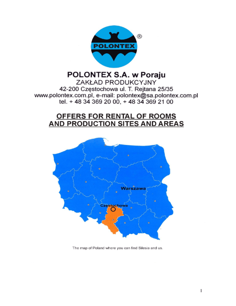 1 2 3 4 5 WAREHOUSE AND PRODUCTION HALL OFFER poz. schematu nr 1 position 1 on the sketch PRODUCTION HALL DATA 1. Name of production hall / Nazwa hali produkcyjnej Hala magazynowo- produkyjna (oznaczona na schemacie nr 1) Hall store/ production ( marked on sketch nr 1) 2. Location / Lokalizacja Town / Street Miasto / Ulica 42-200 Częstochowa ul. Rejtana 25,/35 Province (Voivodship) / Województwo śląskie Special Economic Zone / Specjalna Strefa Ekonomiczna Nie/ No Technology / Industrial Park Park Technologiczny / Przemysłowy Centrum Przemysłowo- Handlowo- Usługowe / Sales/services center Website / Strona internetowa Www.polontex.com.pl 3. Owner / Właściciel obiektu Polontex SA. 3. 1 Contact person / Osoba do kontaktu Name, surname Imię, nazwisko Artur Gacek Tel: +48 34 369 2000 , + 48 606 999111 e-mail: [email protected] 4. Basic data for production hall / Podstawowe dane dotyczące hali produkcyjnej 4.1 Usable space (except: social and office space) / Powierzchnia użytkowa (nie dotyczy: powierzchni socjalnych i biurowych) Area Powierzchnia 600 sq.m. m2 Number of storeys Liczba kondygnacji Height Wysokość 8 m Year of construction Rok budowy Floor carrying capacity Nacisk na posadzkę 1000 kg / sq.m. kg / m 2 Year of modernization Rok modernizacji 1 4.2 Present technical condition / Obecny stan techniczny • Excellent / Doskonały • Standard / Średni • Good / Dobry • Poor / Słaby x 6 4.3 Total area of land Całkowita powierzchnia terenu sq.m. m2 5. Transport link / Połączenia transportowe • Nearest motorway / National road Najbliższa droga szybkiego ruchu / krajowa [km] DK-1 0,5km • Nearest voivodship city Najbliższe miasto wojewódzkie [km] Katowice -75km • Nearest international airport Najbliższe lotnisko międzynarodowe [km] Katowice-Pyrzowice -45 km. 6. Infrastructure / Infrastruktura • Power / Elektryczność x • Sewage system / Kanalizacja x • Water / Woda x • Access road for trucks / Dojazd dla ciężarówek x • Gas / Gaz x • Overhead cranes / Suwnice x • Heating / Ogrzewanie x • Railway siding / Bocznica x 7. Terms of acquisition / Warunki nabycia • • Ownership / Własność Perpetual usufruct / Użytkowanie wieczyste • x Lease / Wynajem 7.1 Price in EUR, including hall and land Cena w eur, hali i działki according to point 8 – to negotiation wg. punktu 8 – do negocjacji 8. Additional information / Dodatkowe informacje Całość hali składa się z czterech hal .Obiekt może być przebudowany w/g życzenia klienta Whole building consist of four halls. Building can be rebuilt accordingly to customer requirements. - Energia elektryczna i cieplna (W sąsiedztwie Polontexu powstaje nowa elektrociepłownia. Istnieje możliwość pozyskania energii elektrycznej po cenach niższych niż ceny rynkowe, bez naliczania kosztów dystrybucji oraz energii cieplnej według kosztów wytworzenia przez elektrociepłownie). - woda– możliwość pozyskania z rzeki. - ścieki – ze względu na bezpośrednie podłączenie odpływu ścieków do oczyszczalni ścieków istnieje możliwość negocjacji ceny za oczyszczanie ścieków bezpośrednio z oczyszczalnią ścieków. - electric energy and heat energy - a power station is currently being constructed on neighbouring premises so there will be a possibility of obtaining, lower than market price ,energy in the very near future. This will eliminate unnecessery additional distribution costs. Heating will also be provided according to the costs of production by the power station - water - there is a possibility of obtaining water from the local river - sewage - as there is a direct connection with the sewage-treatment plant negotiating prices is also a possibility Date of the offer Data przygotowania oferty 02.2012 7 8 poz. schematu nr 2 position 2 on the sketch PRODUCTION HALL OFFER Poz nr2 na schemacie/ position 2 on the sketch PRODUCTION HALL DATA 1. Name of production hall / Nazwa hali produkcyjnej Boksy /210; 220; ;480 600./ Przeznaczenie – Biura-Usługi- Magazyny rooms ( 210, 220, 480, 600 ) to be used as – offices , warehouses 2. Location / Lokalizacja Town / Street Miasto / Ulica 42-200 Częstochowa ul. Rejtana 25/35 Province (Voivodship) / Województwo śląskie Special Economic Zone / Specjalna Strefa Ekonomiczna Nie /No Technological / Industrial Park Park Technologiczny / Przemysłowy Centrum-Przemysłowo/handlowo/usługowe / sales- services center Website / Strona internetowa www.polontex.com.pl 3. Owner / Właściciel obiektu Polontex SA. 3. 1 Contact person / Osoba do kontaktu Name, surname Imię, nazwisko Artur Gacek Tel: +48 34 3692000, + 48 606 999111 e-mail: [email protected] 4. Basic data for production hall / Podstawowe dane dotyczące hali produkcyjnej 4.1 Usable space (except: social and office space) / Powierzchnia użytkowa (nie dotyczy: powierzchni socjalnych i biurowych) Area Powierzchnia 2100 sq.m. m2 Number of storeys Liczba kondygnacji 1-piętro Height Wysokość 5,0 m Year of construction Rok budowy 1975 Floor carrying capacity Nacisk na posadzkę 300 kg / sq.m. kg / m 2 Year of modernization Rok modernizacji 1998 4.2 Present technical condition / Obecny stan techniczny 9 • Excellent / Doskonały • Good / Dobry x 4.3 Total area of land Całkowita powierzchnia terenu • Average / Średni • Poor / Słaby sq.m. m2 5. Transport link / Połączenia transportowe • Nearest motorway / National road Najbliższa droga szybkiego ruchu / krajowa [km] Droga szybkiego ruchu DK-1 0,5km • Nearest voivodship city Najbliższe miasto wojewódzkie [km] Katowice 75 km. • Nearest international airport Najbliższe lotnisko międzynarodowe [km] Katowice Pyrzowice 45 km 6. Infrastructure / Infrastruktura • Power / Elektryczność x • Sewage system / Kanalizacja x • Water / Woda x • Access road for trucks / Dojazd dla ciężarówek x • Gas / Gaz - • Elewator / Winda towarowa x • Heating / Ogrzewanie x • Railway siding / Bocznica x 7. Terms of acquisition / W