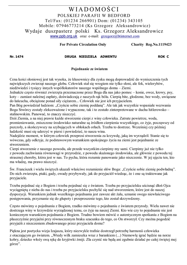 WIADOMOŚCI POLSKIEJ PARAFII W BEDFORD Tel/Fax: (01234 266901) Dom: (01234) 343105 Mobile: 07946773214 (Ks Grzegorz Aleksandrowicz) Wydaje duszpasterz polski Ks. Grzegorz Aleksandrowicz www.ppb.org.uk oraz e-mail: [email protected] For Private Circulation Only Nr. 1474 DRUGA NIEDZIELA ADWENTU Charity Reg.No.1119423 ROK C Pojednanie ze światem Cena kości słoniowej jest tak wysoka, że kłusownicy dla zysku mogą doprowadzić do wyniszczenia tych największych zwierząt naszego globu. Człowiek stał się wrogiem nie tylko słoni, ale fok, wielorybów, niedźwiedzi i tysięcy innych współlokatorów naszego wspólnego domu – Ziemi. Jednakże często również zwierzęta przeznaczone przez Boga dla nas jako pomoc – konie, owce, krowy, psy, koty – zamiast należnej zapłaty, doświadczają z naszych rąk bólu. Cierpią bite, głodzone, bez wody, uwiązane do łańcucha, obciążone ponad siły ciężarem... Człowiek nie jest ich przyjacielem. Pan Bóg powiedział ludziom: „Czyńcie sobie ziemię poddaną”. Ale tak jak wszystkie wspaniałe wezwania Boga Stwórcy zostały zlekceważone i wypaczone, tak i to zostało zinterpretowane w duchu hitlerowsko – stalinowskim. Panować, to znaczy niszczyć. Dziś Ziemia, a na niej prawie każde stworzenie cierpi z winy człowieka. Zatrute powietrze, woda, promieniowanie, zniszczone środowisko naturalne są źródłem cierpienia wszystkiego, co żyje, począwszy od pszczoły, a skończywszy na szybujących w obłokach orłach. Trzeba to dostrzec. Wcześniej czy później ludzkość musi się uderzyć w piersi i powiedzieć, to nasza wina. Nadejdzie moment, w którym człowiek przeprosi stworzenia za krzywdę, jaką im wyrządził. Stanie się to wówczas, gdy odkryje, że podstawowym warunkiem spokojnego życia na ziemi jest pojednanie ze stworzeniem. Cierpi stworzenie z naszego powodu, ale przede wszystkim cierpimy my sami. Cierpimy już nie tylko z powodu zachwiania równowagi w przyrodzie, z powodu skażonego środowiska, ale głównie z powodu tej strasznej choroby, która jest w nas. To pycha, która rozumie panowanie jako niszczenie. W jej ujęciu ten, kto ma władzę, ma prawo niszczyć. Św. Franciszek i wielu świętych ukazali właściwe rozumienie słów Boga: „Czyńcie sobie ziemię podwładną”. Do nich zwierzęta, ptaki, gady, owady przybywały, jak do przyjaciół wiedząc, że i one są traktowane jak przyjaciele. Trzeba pojednać się z Bogiem i trzeba pojednać się z światem. Trzeba po przyjacielsku uścisnąć dłoń Ojca wyciągniętą z nieba do nas i trzeba po przyjacielsku pochylić się nad stworzeniem, które jest do naszej dyspozycji. Warunkiem jednak wszelkiego pojednania jest zawsze akt żalu, uznanie swego niewłaściwego postępowania, przyznanie się do głupoty i przeproszenie tego, kto został skrzywdzony. Często mówimy o pojednaniu z Bogiem, rzadko mówimy o pojednaniu z światem przyrody. Wielu nawet nie dostrzega winy w krzywdzie wyrządzonej temu, co żyje na naszej Ziemi. Kto wie czy to pojednanie nie jest koniecznym warunkiem pojednania z Bogiem. Trudno bowiem mówić o autentycznym spotkaniu z Bogiem na płaszczyźnie przyjaźni przy równoczesnym braku szacunku do tego, co On stworzył. Czy można pogodzić przyjaźń z niszczeniem zbudowanego przez przyjaciela domu? Piękna jest poetycka wizja Izajasza, który niezwykle trafnie dostrzegł potrzebę harmonii człowieka z otaczającym go światem. „Wtedy wilk zamieszka wraz z barankiem (...) Niemowlę igrać będzie na norze kobry, dziecko włoży swą rękę do kryjówki żmiji. Zła czynić nie będą ani zgubnie działać po całej świętej mej górze”. Niedziela,4.12.2016 Godz. 9.30 Godz.11.00 Godz.18.00 Godz.19.00 Poniedziałek, 5.12.2016 Godz. 9.30 Godz.19.00 Wtorek. 6.12.2016 Godz. 9.30 Św. Mikołaja Godz.19.00 Środa, 7.12.2016 Godz. 9.30 Św. Ambrożego Godz.19.00 Czwartek,8.12.2016 Godz. 9.30 Godz.19.00 Piątek, 9.12.2016 Godz.15.00 Godz.19.00 Sobota, 10.12.2016 Godz. 9.30 Godz.19.00 Niedziela,11.12.2016 Godz. 9.30 Godz.11.00 Godz.19.00 Poniedziałek, 12.12.2016 Godz. 9.30 Św. Ambrożego Godz.19.00 Wtorek, 13.12.2016 Godz. 9.30 Św. Łucji Godz.19.00 Środa, 14.12.2016 Godz. 9.30 Św.Jana od Krzyża Godz.19.00 Czwartek,15.12.2016 Godz. 9.30 Godz.19.00 Piątek, 16.12.2016 Godz.15.00 Sobota, 17.12.2016 Godz.19.00 Godz. 9.30 Godz.18.00 Godz.19.00 DRUGA NIEDZIELA ADWENTU Rok A - za dusze ś.p. Edwarda i Zofii Kleczkowskich - int. syna z rodziną. - za dusze ś.p. Janiny Miniewskiej - int. rodziny. - ADORACJA NAJŚWIĘTSZEGO SAKRAMENTU. - za dusze ś.p. Wiesława i Danuty Chilickich, Genowefy i Franciszka Dębskich i ś.p. Władysława Mamulewicz - int. dzieci. - za dusze ś.p. Janiny Miniewskiej - int. rodziny. - Intencja wolna. - za dusze ś.p. Janiny Miniewskiej - int. rodziny. - O błog. Boże i opiekę Matki Bożej i dar Chrztu św. dla Feliksa Nash – int.babci. - za dusze ś.p.Janiny Miniewskiej - int. rodziny. - O błog. Boże i łaskę wiary dla Natalki za wst. św.Ambrożego – int. matki. UROCZYSTOŚĆ NIEPOKALANEGO POCZĘCIA NAJŚW.MARYI PANNY - za dusze ś.p. Janiny Miniewskiej - int. rodziny. - za dusze ś.p. Bogumiły Powroźnik - int. dzieci i wnuków. - O zdrowie, błog. Boże i opiekę Matki Bożej dla Leokadii Romanowskiej. KORONKA DO MIŁOSIERDZIA BOŻEGO. - za dusze ś.p. Janiny Miniewskiej - int. rodziny. - za dusze ś.p. Janiny Miniewskiej - int. rodziny. Adoracja Najśw.Sakramentu. Spowiedź święta. - Intencja wolna. - TRZECIA NIEDZIELA ADWENTU Rok A - za dusze ś.p. Janiny Miniewskiej - int. rodziny. - Intencja wolna. - W intencji ofiar głodu, przemocy, wojen przez wszystkich cierpiących z prośbą o potrzebne łaski - int. Parafian. - za dusze ś.p. Janiny Miniewskiej - int. rodziny. - Intencja wolna. - za dusze ś.p. Janiny Miniewskiej - int. rodziny. - Intencja wolna. - za dusze ś.p. Janiny Miniewskiej - int. rodziny. - Intencja wolna. - za dusze ś.p. Janiny Miniewskiej - int. rodziny. - Msz