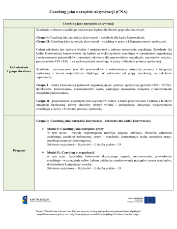 Coaching jako narzędzie aktywizacji (CNA) Coaching jako narzędzie aktywizacji Szkolenie z obszaru coachingu realizowane będzie dla dwóch grup szkoleniowych: Grupa I: Coaching jako narzędzie aktywizacji – szkolenie dla kadry kierowniczej; Grupa II: Coaching jako narzędzie aktywizacji – coaching w pracy z klientem pomocy społecznej. Celem szkolenia jest nabycie wiedzy i umiejętności z zakresu stosowania coachingu. Szkolenie dla kadry kierowniczej koncentrować się będzie na wykorzystaniu coachingu w zarządzaniu organizacją i motywowaniu pracowników, natomiast szkolenie dla pracowników socjalnych, asystentów rodziny, pracowników CIS i KIS – na wykorzystaniu coachingu w pracy z klientem pomocy społecznej. Cel szkolenia i grupa docelowa Szkolenie przeznaczone jest dla pracowników i wolontariuszy instytucji pomocy i integracji społecznej z terenu województwa śląskiego. W zależności od grupy docelowej, na szkolenie zapraszamy: Grupa I – kadrę kierowniczą jednostek organizacyjnych pomocy społecznej (głównie OPS i PCPR)dyrektorów, kierowników, koordynatorów, osoby zajmujące stanowiska związane z kierowaniem zespołami pracowników. Grupa II –pracowników socjalnych oraz asystentów rodzin, a także pracowników Centrów i Klubów Integracji Społecznej, którzy chcieliby zdobyć wiedzę i umiejętności dotyczące wykorzystania coachingu w pracy z klientami pomocy społecznej. Grupa I: Coaching jako narzędzie aktywizacji – szkolenie dla kadry kierowniczej Moduł I: Coaching jako narzędzie pracy w tym m.in.: metody wspomagania rozwoju, pojęcie, odmiany, filozofia, założenia coachingu, coaching holistyczny, coach – standardy, kompetencje, etyka, narzędzia pracy, przebieg rozmowy coachingowej. Szkolenie wyjazdowe – liczba dni – 3, liczba godzin – 24 Program Moduł II: Coaching w organizacji w tym m.in.: leadership, budowanie skutecznego zespołu, motywowanie, prowadzenie coachingu - wyznaczanie celów i planu działania; monitorowanie postępów; ocena rezultatów, doskonalenie kompetencji coacha. Szkolenie wyjazdowe – liczba dni – 3, liczba godzin – 24 Projekt “Kształcenie i doradztwo dla kadr pomocy i integracji społecznej województwa śląskiego” współfinansowany jest przez Unię Europejską w ramach Europejskiego Funduszu Społecznego. Coaching jako narzędzie aktywizacji (CNA) Grupa II: Coaching jako narzędzie aktywizacji – coaching w pracy z klientem pomocy społecznej Moduł I: Coaching jako narzędzie pracy w tym m.in.: metody wspomagania rozwoju, pojęcie, odmiany, filozofia, założenia, coaching holistyczny, coach – standardy, kompetencje, etyka, narzędzia pracy, przebieg rozmowy coachingowej, wykorzystanie coachingu na gruncie pomocy społecznej, doskonalenie kompetencji, trudne sytuacje w pracy coacha. Szkolenie wyjazdowe – liczba dni – 3, liczba godzin – 24 Moduł II: Coaching w pracy z klientem pomocy społecznej w tym m.in.: prowadzenie coachingu - wyznaczanie celów i planu działania; monitorowanie postępów; ocena rezultatów, doskonalenie umiejętności stosowania różnych metod coachingowych, coaching w pomocy społecznej z wykorzystaniem modelu GAP i OSKAR, jobcoaching. Szkolenie wyjazdowe – liczba dni – 3, liczba godzin – 24 Liczba miejsc – 32 (po 16 osób w każdej grupie) Liczba grup – 2 Liczba dni szkoleniowych- 6 dni (3 dni + 3 dni) Termin: wrzesień – listopad 2014 roku Informacje organizacyjne Łączna liczba godzin dydaktycznych dla całego szkolenia wynosi 48 (6 dni szkoleniowych). Szkolenie będzie realizowane w dni robocze w jednym z hoteli na terenie województwa śląskiego w formie dwóch trzydniowych zjazdów. Podczas szkoleń wyjazdowych organizator bezpłatnie zapewnia nocleg, wyżywienie, przerwę kawową oraz materiały dydaktyczne. Organizator nie pokrywa kosztów dojazdu uczestników do miejsc realizacji zajęć. Dokładne miejsca realizacji zajęć oraz terminy i szczegółowy zakres tematyczny poszczególnych spotkań zostaną wskazane po wyłonieniu Wykonawcy. Projekt “Kształcenie i doradztwo dla kadr pomocy i integracji społecznej województwa śląskiego” współfinansowany jest przez Unię Europejską w ramach Europejskiego Funduszu Społecznego.