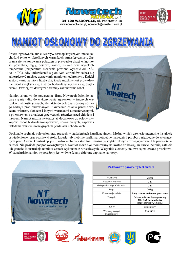 34-100 WADOWICE, ul. Podstawie 10 www.nowatech.com.pl, [email protected] Proces zgrzewania rur z tworzyw termoplastycznych może zachodzić tylko w określonych warunkach atmosferycznych. Zabrania się wykonywania połączeń w przypadku dużej wilgotności powietrza, mgły, deszczu, wiatru, niskich oraz wysokich temperatur (temperatura otoczenia powinna wynosić od +5oC do +40oC). Aby uniezależnić się od tych warunków zaleca się zabezpieczyć miejsce zgrzewania namiotem ochronnym. Dzięki zastosowaniu namiotu liczba dni, kiedy możliwe jest prowadzenie robót zwiększa się, a sezon budowlany wydłuża się, dzięki czemu łatwiej jest dotrzymać terminy zakończenia robót. Namiot osłonowy do zgrzewania firmy Nowatech świetnie nadaje się nie tylko do wykonywania zgrzewów w trudnych warunkach atmosferycznych, ale także do ochrony i osłony różnego rodzaju prac budowlanych. Skutecznie osłania przed deszczem, wiatrem, słońcem i innymi warunkami atmosferycznymi, a po wstawieniu urządzeń grzewczych, również przed chłodem i mrozem. Namiot można wykorzystać dodatkowo do osłony wykopów, robót budowlano-naprawczo, spawalniczych, napraw i układania warstw izolacyjnych na jezdniach i chodnikach. Doskonale spełniają rolę osłon przy pracach w studzienkach kanalizacyjnych. Można w nich zawiesić przenośne instalacje oświetleniowe, oraz rozstawić stoły, krzesła lub mobilne szafki na potrzebne narzędzia i przybory niezbędne do wymaganych prac. Całość konstrukcji jest bardzo mobilna i stabilna , można ją szybko złożyć i zmagazynować lub przenieść w całości. Nie posiada podpór wewnętrznych. Namiot może być montowany na kostce brukowej, murawie, betonie, asfalcie lub gruncie. Konstrukcja namiotu została wykonana z rur stalowych. Wszystkie elementy stalowe są malowane proszkowo. W standardzie namiot wyposażony jest w dwie ściany dzielone zapinane na rzepy. Podstawowe parametry techniczne: Wymiary : 3x3m Wysokość wejścia: 2m Maksymalna Wys. Całkowita : 3m Waga 70 kg Konstrukcja stelaża Rury stalowe malowane proszkowo Pokrycie Ściany poliester impregnowany 270g,/m2 Dach poliester impregnowany 360 g/m2 Kolor cementowy Wymiary skrzyni transportowej 210/50/21