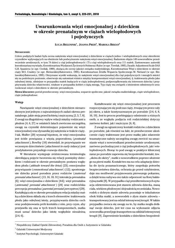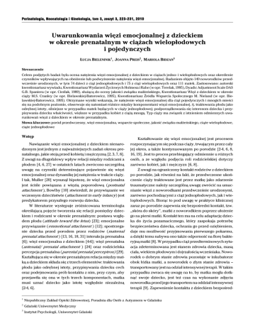 Perinatologia, Neonatologia i Ginekologia, tom 3, zeszyt 3, 223-231, 2010 Uwarunkowania więzi emocjonalnej z dzieckiem w okresie prenatalnym w ciążach wielopłodowych i pojedynczych ŁUCJA BIELENINIK1, JOANNA PREIS2, MARIOLA BIDZAN3 Streszczenie Celem podjętych badań była ocena natężenia więzi emocjonalnej z dzieckiem w ciążach jedno- i wielopłodowych oraz określenie czynników wpływających na obniżenie lub podwyższenie natężenia więzi emocjonalnej. Badaniem objęto 149 noworodków przedwcześnie urodzonych, w tym 74 dzieci z ciąż jednopłodowych i 75 z ciąż wielopłodowych oraz 111 matek. Zastosowano: autorski kwestionariusz wywiadu, Kwestionariusz Wydarzeń Życiowych Holmesa i Rahe (w opr. Terelak, 1995), Dyadic Adjustment Scale DAS G.B. Spaniera (w opr. Cieślak, 1989), służącą do oceny jakości związku małżeńskiego, Kwestionariusz Więź z dzieckiem w okresie ciąży M.S. Cranley (w opr. Bielawskiej-Batorowicz, 1995), Kwestionariusz Źródła Wsparcia Społecznego M. Nieland (w opr. Bielawskiej-Batorowicz, 1995). Otrzymane wyniki wskazują, że natężenie więzi emocjonalnej dla ciąż pojedynczych i mnogich mieści się na podobnym poziomie, obserwuje się natomiast różnice między komponentami więzi emocjonalnej, tj. traktowania płodu jako odrębnej istoty, silniejsze w przypadku matek będących w ciąży jednopłodowej; podporządkowania się interesom dziecka i przypisywania dziecku właściwości, większe w przypadku kobiet z ciążą mnogą. Typ ciąży ma związek z istnieniem odmiennych uwarunkowań więzi z dzieckiem w okresie prenatalnym. Słowa kluczowe: poród przedwczesny, więź emocjonalna, wsparcie społeczne, jakość związku małżeńskiego, ciąże wielopłodowe, ciąże jednopłodowe Wstęp Nawiązanie więzi emocjonalnej z dzieckiem nienarodzonym jest jednym z najważniejszych zadań okresu prenatalnego, jakie stoją przed kobietą i mężczyzną [2, 3, 7, 8]. Z uwagi na długofalowy wpływ relacji między rodzicami a płodem [4, 6, 27] w ostatnich latach zwrócono szczególną uwagę na czynniki determinujące pojawienie się więzi emocjonalnej oraz dynamikę jej natężenia w trakcie ciąży. I tak, Muller [20] wysunął hipotezę, że więź emocjonalna jest ściśle powiązana z więzią poporodową (postnatal attachment ), Bowlby [10] stwierdził, że przywiązanie we wczesnym dzieciństwie (attachment in early infancy) jest predykatorem przyszłego rozwoju dziecka. W literaturze występuje zróżnicowana terminologia określającą pojęcie tworzenia się relacji pomiędzy dzieckiem i rodzicami w okresie prenatalnym: postawa względem płodu (attitude toward the fetus) [23]; emocjonalne przywiązanie (emmotional attachment ) [12]; spostrzeganie dziecka przed porodem przez rodziców (maternal prenatal attachment ) [13, 16, 18, 31] interakcja prenatalna [6]; więź emocjonalna z dzieckiem [4-6]; więź prenatalna (antenatal/ prenatal attachment ) [24] oraz rodzicielska percepcja prenatalna (parental prenatal perceptron) [29]. Kształtująca się w okresie prenatalnym relacja między matką a dzieckiem składa się z trzech elementów: traktowania płodu jako odrębnej istoty, przypisywania dziecku cech oraz podejmowania prób kontaktu z nim, przy czym, aby przejawiła się ona w tych trzech komponentach, matka musi uznać dziecko jako istotę względnie niezależną [2-4, 6]. Kształtowanie się więzi emocjonalnej jest procesem rozpoczynającym się podczas ciąży, trwającym przez cały jej okres, a także kontynuowanym po porodzie [2-4, 6, 8, 16, 19]. Jest to proces przebiegający odmiennie u różnych osób, a ze względu podjęcia roli rodzicielskiej dotyczy zarówno kobiet, jak i mężczyzn [6, 8]. Z uwagi na ograniczony kontakt rodziców z dzieckiem po porodzie, jak również na fakt, że przedwczesne ukończenie ciąży traktowane jest przez matkę jako zdarzenie traumatyczne należy szczególną uwagę zwrócić na umacnianie więzi z noworodkami przedwcześnie urodzonymi, zarówno pochodzącymi z ciąż jednopłodowych, jak i wielopłodowych. Biorąc to pod uwagę w praktyce klinicznej zaraz po porodzie zapewnia się bezpośredni kontakt, tzw. „skóra do skóry”, matki z noworodkiem poprzez ułożenie go na piersi matki. Kontakt ten ma na celu adaptację dziecka do życia pozamacicznego, który zaspokaja potrzebę bezpieczeństwa dziecka, ochrania go przed oziębieniem, daje mu możliwość przyjmowania pierwszego pokarmu, a dzięki temu nabywa ono także odporność na florę bakteryjną matki [8]. W przypadku ciąż przedterminowych sytuacja zdeterminowana jest stanem zdrowia dziecka, masą ciała, wiekiem płodowym i dojrzałością wcześniaka. Noworodek o dobrym stanie zdrowia pozostaje w inkubatorze obok łóżka matki, a noworodek o złym stanie zdrowia – transportowany jest na odział intensywnej terapii. W takim przypadku zwraca się uwagę na to, by matka mogła dotknąć swoje dziecko, jest też czas na wykonanie zdjęcia noworodka przed jego transportem na oddział intensywnej terapii [9]. Zapewnienie kontaktu z dzieckiem bezpośred- 1 Niepubliczny Zakład Opieki Zdrowotnej, Poradnia dla Osób z Autyzmem w Gdańsku 2 Gdański Uniwersytet Medyczny 3 Instytut Psychologii, Uniwersytet Gdański 224 Ł. Bieleninik, J. Preis, M. Bidzan nio po porodzie jest pierwszorzędnym celem z uwagi na prozdrowotne i propsychologiczne aspekty więzi, jaka powstaje między nimi. Już Klaus i Kennel wysunęli koncepcję „okresu krytycznego”, trwającego 12 godzin, kiedy powinno dojść do bezpośredniego kontaktu, aby więź emocjonalna mogła zaistnieć [4]. Obecnie okres ten wydłużono do trzech dni po porodzie i nazwano „okresem szczególnej wrażliwości” [4]. Wyznaczenie tej granicy jest szczególnie istotne w przypadku dzieci urodzonych przedterminowo ze względu na utrudniony kontakt matki z noworodkiem. Inne badania, np.: Sluckin i in. [4] odnoszące się do dzieci urodzonych przedterminowo ni