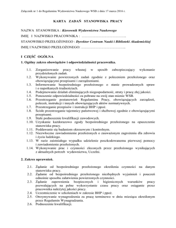 Załącznik nr 1 do Regulaminu Wydawnictwa Naukowego WSB z dnia 17 marca 2016 r. KARTA ZADAŃ STANOWISKA PRACY NAZWA STANOWISKA : Kierownik Wydawnictwa Naukowego IMIĘ I NAZWISKO PRACOWNIKA : ……………………………….. STANOWISKO PRZEŁOŻONEGO : Dyrektor Centrum Nauki i Biblioteki Akademickiej IMIĘ I NAZWISKO PRZEŁOŻONEGO: ……………………………….. I CZĘŚĆ OGÓLNA 1. Ogólny zakres obowiązków i odpowiedzialności pracownika. 1.1. 1.2. 1.3. 1.4. 1.5. 1.6. 1.7. 1.8. 1.9. 1.10. 1.11. 1.12. 1.13. 1.14. Zorganizowanie pracy własnej w sposób zabezpieczający wykonanie przydzielonych zadań. Wykonywanie powierzonych zadań zgodnie z poleceniem przełożonego oraz obowiązującymi przepisami i zarządzeniami. Informowanie bezpośredniego przełożonego o stanie prowadzonych spraw i o napotkanych trudnościach. Podejmowanie działań eliminujących niegospodarność, straty i pracę złej jakości. Ponoszenie odpowiedzialności za pobrane na swój stan mienie WSB. Przestrzeganie postanowień Regulaminu Pracy, obowiązujących zarządzeń, poleceń, instrukcji i innych obowiązujących aktów normatywnych. Przestrzeganie przepisów i instrukcji BHP i ppoż. Ścisłe przestrzeganie tajemnicy państwowej i służbowej zgodnie z obowiązującymi przepisami. Stałe podnoszenie kwalifikacji zawodowych. Uzyskanie każdorazowo zgody bezpośredniego przełożonego na opuszczenie stanowiska pracy. Poddawanie się badaniom okresowym i kontrolnym. Niezwłoczne zawiadomienie przełożonych o zauważonym zagrożeniu dla zdrowia i życia ludzkiego. W razie zaistniałego wypadku udzielenie poszkodowanemu pierwszej pomocy i zawiadomienie przełożonych. Wykonywanie prac i czynności zleconych przez przełożonego wynikających z aktualnych potrzeb wydawnictwa, Uczelni. 2. Zakres uprawnień. 2.1. Żądanie od bezpośredniego przełożonego określenia czynności na danym stanowisku pracy. 2.2. Żądanie od bezpośredniego przełożonego niezbędnych wyjaśnień i pouczeń odnośnie sposobu załatwienia powierzonych czynności. 2.3. Żądanie zapewnienia bezpiecznych i higienicznych warunków pracy pozwalających na pełne wykorzystanie czasu pracy oraz osiąganie przez pracownika należytej jakości pracy. 2.4. Uczestniczenie w szkoleniach w zakresie BHP i ppoż. 2.5. Otrzymywanie wynagrodzenia za pracę terminowo w dniu miesiąca określonym przez Regulamin Wynagradzania. 2.6. Podnoszenie kwalifikacji. Załącznik nr 1 do Regulaminu Wydawnictwa Naukowego WSB z dnia 17 marca 2016 r. II CZĘŚĆ SZCZEGÓŁOWA 1. Koordynowanie pracy Wydawnictwa. 1.1. 1.2. 1.3. 1.4. Wnioskowanie zmian personalnych w Wydawnictwie (wnioskowanie o zatrudnianie pracowników, awanse, nagrody itd.). Organizowanie i prowadzenie zebrań Wydawnictwa. Delegowanie obowiązków i zadań oraz kontrolowanie stanu ich wykonania. Nadzór nad przestrzeganiem przepisów obowiązujących w Uczelni przez podległych pracowników, w tym dotyczących bhp oraz dyscypliny pracy. 2. Plan wydawniczy. 2.1. 2.2. 2.3. Udział w posiedzeniach Komisji ds. Badań Naukowych i Wydawnictw. Sprawdzanie Wniosków o publikację po posiedzeniu Komisji ds. Badań Naukowych i Wydawnictw. Tworzenie, monitorowanie i aktualizowanie planu wydawniczego. 3. Koordynacja procesu wydawniczego. 3.1. 3.2. 3.3. 3.4. 3.5. 3.6. 3.7. 3.8. Ustalanie propozycji wysokości honorariów dla Autorów/Redaktorów Naukowych zgodnie z zasadami określonymi przez Rektora. Zatwierdzanie wniosków o umowy o dzieło o charakterze licencyjnym dla Autorów/Redaktorów Naukowych. Wybór oferty na opracowanie publikacji. Zatwierdzanie zamówień na publikację. Monitorowanie stanu prac edytorskich. Formalne akceptowanie wszystkich materiałów przed ich publikacją. Rejestracja numerów eISBN. Prowadzenie archiwum Wydawnictwa, w tym archiwizowanie publikacji projektowych. 4. Koordynacja procesu recenzji publikacji. 4.1. 4.2. 4.3. Ustalanie propozycji wysokości honorariów dla Recenzentów zgodnie z zasadami określonymi przez Rektora. Zatwierdzanie wniosków o umowy o dzieło o charakterze licencyjnym dla Recenzentów. Monitorowanie procesu recenzji. 5. Pełnienie funkcji Sekretarza Redakcji czasopisma „Forum Scientiae Oeconomia”. 5.1. 5.2. 5.3. 5.4. 5.5. 5.6. 5.7. Obsługa konta e-mail czasopisma. Kontakt z Autorami i Recenzentami. Prowadzenie dokumentacji czasopisma. Obróbka techniczna artykułów w celu dostosowania ich do wymogów Redakcji. Pozyskiwanie ofert na opracowanie kolejnych numerów czasopisma. Przygotowywanie i zatwierdzanie zamówień na opracowanie kolejnych numerów czasopisma. Aktualizacja strony czasopisma. Załącznik nr 1 do Regulaminu Wydawnictwa Naukowego WSB z dnia 17 marca 2016 r. 6. Promocja Wydawnictwa. 6.1. Reprezentowanie Wydawnictwa na zewnątrz, bez upoważnienia do zaciągania zobowiązań finansowych. 6.2. Tworzenie i aktualizacja strony WWW Wydawnictwa. 6.3. Tworzenie materiałów promocyjnych. 6.4. Promocja Wydawnictwa w mediach społecznościowych. 6.5. Udział w Targach Książki. 6.6. Organizowanie działań promocyjnych o charakterze cyklicznym i eventowym, w tym spotkań autorskich. 6.7. Promocja Wydawnictwa w trakcie różnego rodzaju imprez odbywających się na terenie Uczelni i poza nią. 6.8. Nawiązywanie bezpośrednich relacji z potencjalnymi kontrahentami poprzez odwiedzanie pobliskich księgarń i przedstawianie im oferty Wydawnictwa. 7. Wspieranie pracowników naukowych Uczelni w promocji ich dorobku naukowego. 8. Kształtowanie polityki marketingowej Wydawnictwa. 9. Kształtowanie strategii rozwoju Wydawnictwa. 10. Szukanie nowych dróg promocji dorobku naukowego Uczelni, w tym publikacji naukowych. 11. Zdobywanie nowych kontrahentów, w tym nawiązywanie współpracy z innymi wydawnictwami. 12. Nadzorowanie inwentaryzacji Wydawnictwa. 13. Tworzenie zastawień i sprawozdań zgodnie z potrzebami Uczelni. 14. Przestrzeganie dyscypliny pracy, tajemnicy służbowej, przepisów BHP i zasad współżycia społecznego. 