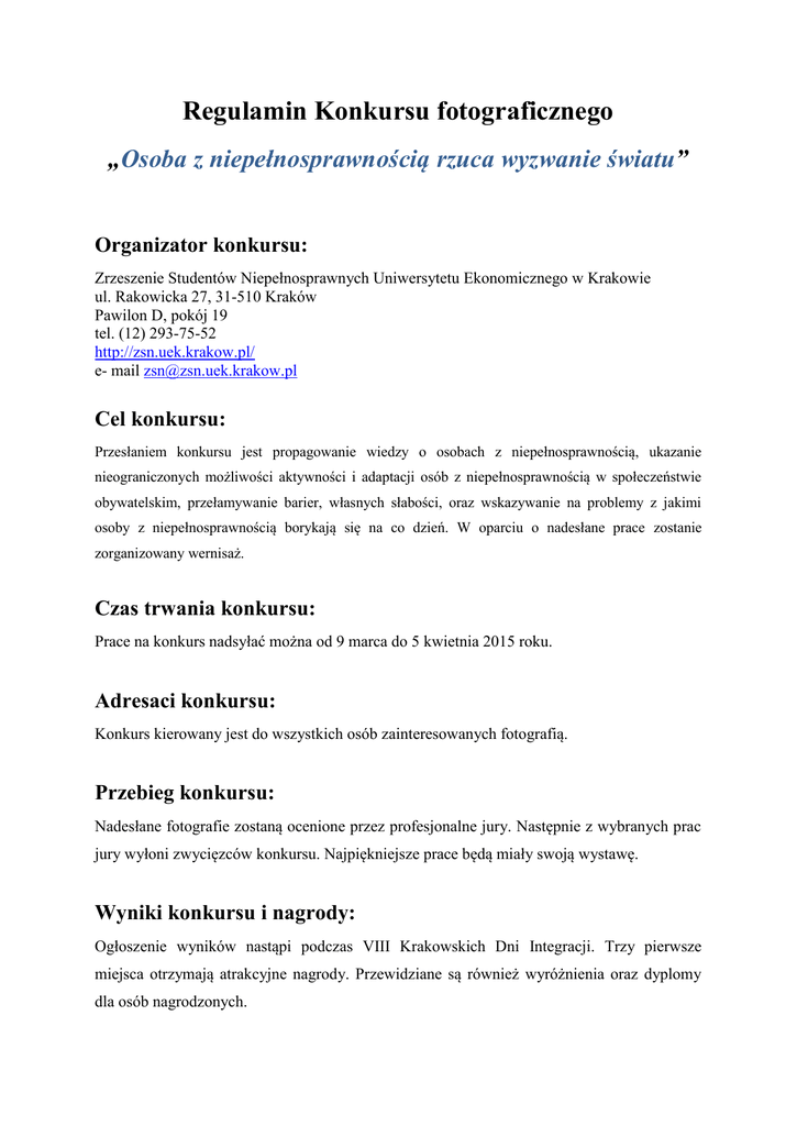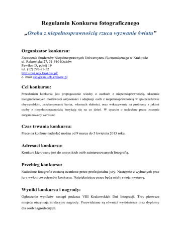 Regulamin Konkursu fotograficznego „Osoba z niepełnosprawnością rzuca wyzwanie światu” Organizator konkursu: Zrzeszenie Studentów Niepełnosprawnych Uniwersytetu Ekonomicznego w Krakowie ul. Rakowicka 27, 31-510 Kraków Pawilon D, pokój 19 tel. (12) 293-75-52 http://zsn.uek.krakow.pl/ e- mail [email protected] Cel konkursu: Przesłaniem konkursu jest propagowanie wiedzy o osobach z niepełnosprawnością, ukazanie nieograniczonych możliwości aktywności i adaptacji osób z niepełnosprawnością w społeczeństwie obywatelskim, przełamywanie barier, własnych słabości, oraz wskazywanie na problemy z jakimi osoby z niepełnosprawnością borykają się na co dzień. W oparciu o nadesłane prace zostanie zorganizowany wernisaż. Czas trwania konkursu: Prace na konkurs nadsyłać można od 9 marca do 5 kwietnia 2015 roku. Adresaci konkursu: Konkurs kierowany jest do wszystkich osób zainteresowanych fotografią. Przebieg konkursu: Nadesłane fotografie zostaną ocenione przez profesjonalne jury. Następnie z wybranych prac jury wyłoni zwycięzców konkursu. Najpiękniejsze prace będą miały swoją wystawę. Wyniki konkursu i nagrody: Ogłoszenie wyników nastąpi podczas VIII Krakowskich Dni Integracji. Trzy pierwsze miejsca otrzymają atrakcyjne nagrody. Przewidziane są również wyróżnienia oraz dyplomy dla osób nagrodzonych. Format i jakość zdjęć: Nadesłane fotografie powinny być w jak najlepszej jakości i rozdzielczości (nie mniej niż 300 dpi). Format pliku .jpg, .jpeg, bmp, raw. Termin nadsyłania: Zdjęcia należy nadsyłać do dnia 5 kwietnia 2015 roku na podany adres: e-mail: [email protected]. Uczestnik może zgłosić do konkursu maksymalnie 5 zdjęć. Każde zdjęcie należy opatrzyć krótkim komentarzem/opisem. Ponadto w e-mailu proszę podać następujące informacje: imię i nazwisko autora, nazwę uczelni, organizacji, numer telefonu kontaktowego. Otrzymanie każdej fotografii zostanie potwierdzone przez organizatorów e-mailem zwrotnym. Jeśli takie potwierdzenie nie zostanie otrzymane, prosimy o niezwłoczny kontakt. Przesłanie fotografii jest jednoznaczne z oświadczeniem posiadania praw autorskich oraz wyrażeniem zgody na przetwarzanie danych osobowych i korzystanie z nich przez organizatorów konkursu w celach związanych z organizacją wystawy i wyłonieniem zwycięzców a także w przypadku zamieszczenia wybranych prac oraz informacji o całym wydarzeniu w mediach. Zgodnie z ustawą z dnia 29.08.1997 roku o Ochronie danych Osobowych (Dz. U. z 2002 roku Nr 101 poz. 926)