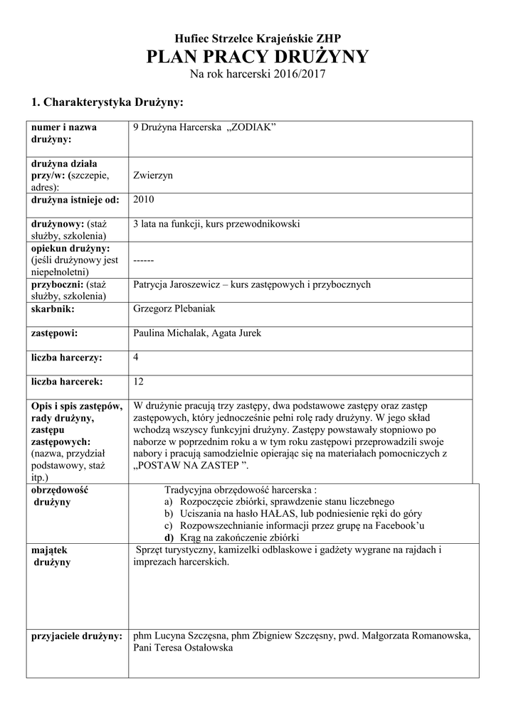 Hufiec Strzelce Krajeńskie ZHP PLAN PRACY DRUŻYNY Na rok harcerski 2016/2017 1. Charakterystyka Drużyny: numer i nazwa drużyny: drużyna działa przy/w: (szczepie, adres): drużyna istnieje od: 9 Drużyna Harcerska „ZODIAK” Zwierzyn 2010 drużynowy: (staż służby, szkolenia) opiekun drużyny: (jeśli drużynowy jest niepełnoletni) przyboczni: (staż służby, szkolenia) skarbnik: 3 lata na funkcji, kurs przewodnikowski zastępowi: Paulina Michalak, Agata Jurek liczba harcerzy: 4 liczba harcerek: 12 Opis i spis zastępów, rady drużyny, zastępu zastępowych: (nazwa, przydział podstawowy, staż itp.) obrzędowość drużyny W drużynie pracują trzy zastępy, dwa podstawowe zastępy oraz zastęp zastępowych, który jednocześnie pełni rolę rady drużyny. W jego skład wchodzą wszyscy funkcyjni drużyny. Zastępy powstawały stopniowo po naborze w poprzednim roku a w tym roku zastępowi przeprowadzili swoje nabory i pracują samodzielnie opierając się na materiałach pomocniczych z „POSTAW NA ZASTEP ”. majątek drużyny przyjaciele drużyny: -----Patrycja Jaroszewicz – kurs zastępowych i przybocznych Grzegorz Plebaniak Tradycyjna obrzędowość harcerska : a) Rozpoczęcie zbiórki, sprawdzenie stanu liczebnego b) Uciszania na hasło HAŁAS, lub podniesienie ręki do góry c) Rozpowszechnianie informacji przez grupę na Facebook’u d) Krąg na zakończenie zbiórki Sprzęt turystyczny, kamizelki odblaskowe i gadżety wygrane na rajdach i imprezach harcerskich. phm Lucyna Szczęsna, phm Zbigniew Szczęsny, pwd. Małgorzata Romanowska, Pani Teresa Ostałowska 2|Strona Stopnie posiadane w drużynie: stopień HR HO Ćwik/Samarytanka Odkrywca/Pionierka Wywiadowca/Tropicielka Młodzik/Ochotniczka Harcerz bez stopnia/na próbie Ilość osób na koniec roku 2012/2013 0 (2 otwarte) 2 2 1 11 2. Charakterystyka środowiska w którym działa drużyna Większość członków drużyny uczęszcza do Zespołu Placówek Oświatowych w Zwierzynie przy ul. Strzeleckiej 4. Jest to o tyle kłopotliwe, że uczniowie tejże szkoły dojeżdżają często po 10-15km i dojazd na zbiórki staje się kłopotliwy. Rodzice nie chętnie chcą wozić dzieci na zbiórki i o ile w okresach wiosennoletnich problem znika tak w zimniejszym okresie jest to utrudnienie. 3. Cele do osiągnięcia Cele w rocznej pracy drużyny mogą dotyczyć takich spraw jak: liczebność drużyny, szkolenie kadry (przybocznych, zastępowych), stosowania systemu zastępowego, zdobywanie stopni i sprawności, gospodarka drużyny, udział lub organizacja przedsięwzięć (imprezy, uroczystości, akcje charytatywne) Cele 1. Kontynuacja pracy w systemie zastępowych 2. Realizacja kilku sprawności całą drużyną oraz otwarcie nowych i zamknięcie trwających prób na stopnie. 3. Organizacja Dnia Myśli Braterskiej 4. Udział w Kweście dla hospicjum św. Kamila w Gorzowie Wlkp. 5. Udział w rajdach, biwakach i imprezach hufcowych i chorągwianych. Zadania 1. organizacja samodzielnych zbiórek w zastępach 2. realizacja cykli sprawności, zamknięcie pozytywnie min. 2. 3. Dzień Myśli Braterskiej w Zwierzynie 4. Kwesta i rozliczenie akcji w hufcu 5. Udział w min. 3 rajdach oraz imprezach hufcowych wg kalendarza hufca w ciągu roku Zamierzenia 1. Samodzielność zastępowych, regularne zbiórki zastępów ( raz na 2 tygodnie ) 2. Rozwój członków jednostki, kształtowanie charakteru i moralności harcerskiej każdego z członków 3. Nabywanie nowych doświadczeń, integracja młodych harcerzy z naszym środowiskiem 4. Rozwój duchowy, zaszczepienie chęci niesienia pomocy w młodzieży. 5. Nabywanie nowych doświadczeń, integracja z innymi środowiskami sporządził: drużynowy pwd. Michał Plebaniak HO dokument zatwierdzony przez radę drużyny w dniu 15.10.2016 3. Harmonogram pracy drużyny M-C TERMIN zadanie do wykonania formy pracy, zdobywane sprawności ZAMIERZENIA - przewidywane efekty, osiągnięcia odpowiedzialny drużynowy Wrzesień Inauguracja roku 2016/17 rozruch zastępu zastępowych Październik Nabór Podsumowanie miesięcznej pracy zastępów Łączność Ognisko Zbiórka w terenie Omówienie spraw organizacyjnych, ustalenie terminów zbiórek, akcji, zbiór pomysłów. Jest to zbiórka inaugurująca pracę z zastępami w drużynie. Zbiórka ma za zadanie zachęcić wybranych przez drużynowego harcerzy do zakładania swoich zastępów. drużynowy Zwiększenie stanu liczebnego zastępów zastępowi Gry i zabawy w GOK’u Zbiórka w terenie Technika harcerska: łączność, szyfry Podsumowanie pracy, rozwianie wszelkich wątpliwości, formalne wprowadzenie nowych członków do drużyny otwarcie prób harcerki/harcerza, zamknięcie prób. Zamierzenia − odbiorca po skończonych zajęciach będzie: • umiał posługiwać się podstawowymi szyframi; • znał imiona swoich kolegów z zastępu; • potrafił posługiwać się siatką alarmową zastępu; • umiał współpracować w grupie rówieśniczej Rada drużyny zastępowi 4|Strona Ekologia Hobby i zainteresowania: przyrodoznawstwo Listopad Bieg na sprawność Zdobywanie sprawności FOTOGRAF Samarytanka • Technika harcerska: samarytanka • Specjalności: ratownictwo • znał imiona swoich kolegów z zastępu; • potrafił określić zagrożenia, jakie czyhają na przyrodę; • umiał współpracować w grupie rówieśniczej. zastępowi uczestnik będzie posiadał umiejętności wymagane na sprawność FOTOGRAFA drużynowy • potrafił złożyć prawidłowy meldunek; • znał poprawny skład podstawowej apteczki; • umiał opatrzyć krwotok i usztywnić złamane kończyny; • potrafił udzielić pierwszej pomocy w przypadku omdlenia. zastępowi + skarbnik Mikołajki + Wigilia z Styczeń Grudzień 10.12 Nocowisko integracja drużyn drużynowi obu jednostek 12 DSH OGIEŃ zbiórka organizacyjna do Wigilii burza mózgów Rada drużyny Historia ZHP Gra planszowa, tabu, kim, zagadki ustalenie szczegółów dt. wigilii Poszerzenie wiedzy harcerskiej 
