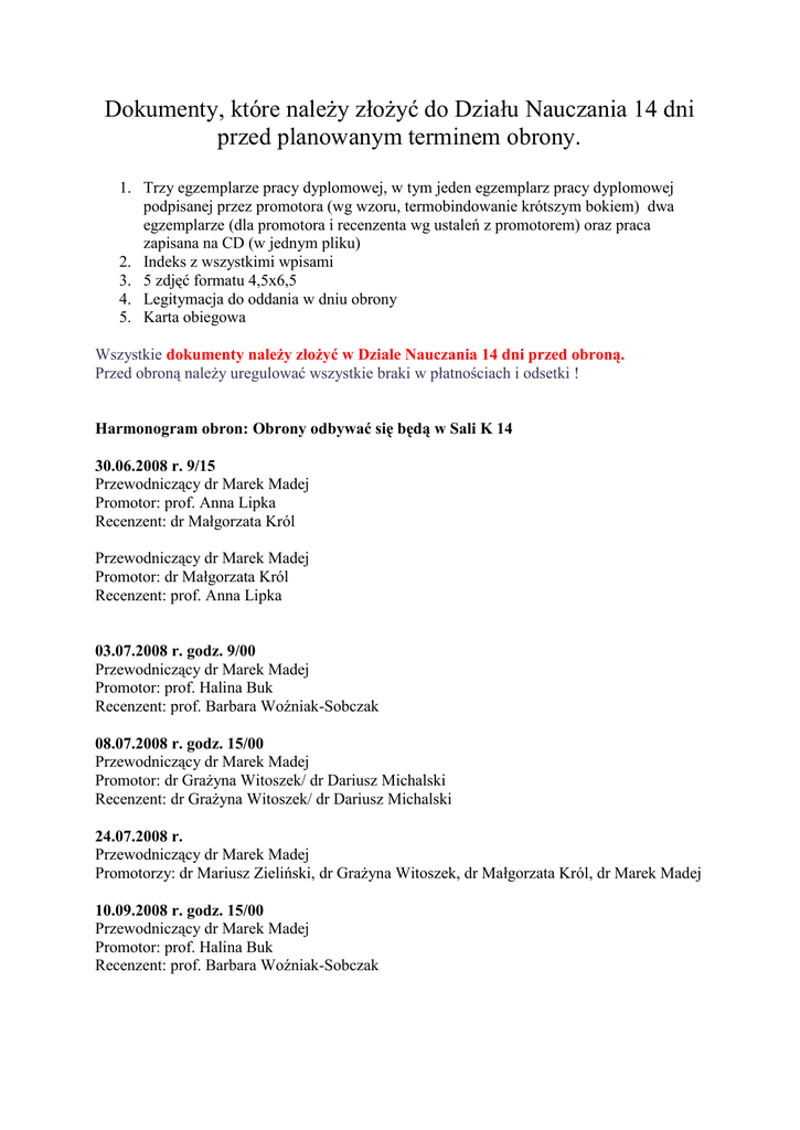 Dokumenty, które należy złożyć do Działu Nauczania 14 dni przed planowanym terminem obrony. 1. Trzy egzemplarze pracy dyplomowej, w tym jeden egzemplarz pracy dyplomowej podpisanej przez promotora (wg wzoru, termobindowanie krótszym bokiem) dwa egzemplarze (dla promotora i recenzenta wg ustaleń z promotorem) oraz praca zapisana na CD (w jednym pliku) 2. Indeks z wszystkimi wpisami 3. 5 zdjęć formatu 4,5x6,5 4. Legitymacja do oddania w dniu obrony 5. Karta obiegowa Wszystkie dokumenty należy złożyć w Dziale Nauczania 14 dni przed obroną. Przed obroną należy uregulować wszystkie braki w płatnościach i odsetki ! Harmonogram obron: Obrony odbywać się będą w Sali K 14 30.06.2008 r. 9/15 Przewodniczący dr Marek Madej Promotor: prof. Anna Lipka Recenzent: dr Małgorzata Król Przewodniczący dr Marek Madej Promotor: dr Małgorzata Król Recenzent: prof. Anna Lipka 03.07.2008 r. godz. 9/00 Przewodniczący dr Marek Madej Promotor: prof. Halina Buk Recenzent: prof. Barbara Woźniak-Sobczak 08.07.2008 r. godz. 15/00 Przewodniczący dr Marek Madej Promotor: dr Grażyna Witoszek/ dr Dariusz Michalski Recenzent: dr Grażyna Witoszek/ dr Dariusz Michalski 24.07.2008 r. Przewodniczący dr Marek Madej Promotorzy: dr Mariusz Zieliński, dr Grażyna Witoszek, dr Małgorzata Król, dr Marek Madej 10.09.2008 r. godz. 15/00 Przewodniczący dr Marek Madej Promotor: prof. Halina Buk Recenzent: prof. Barbara Woźniak-Sobczak 30.09.2008 r. Przewodniczący dr Marek Madej Promotorzy: dr Mariusz Zieliński, dr Grażyna Witoszek, dr Małgorzata Król Obrony pracy dyplomowej - procedura, przepisy § 27 1. Warunkiem dopuszczenia do egzaminu dyplomowego jest: a - zdanie wszystkich egzaminów oraz uzyskanie zaliczeń wszystkich przedmiotów i praktyk przewidzianych planem studiów, b - uzyskanie oceny co najmniej dostatecznej z pracy dyplomowej. c - wpłacenia opłaty za egzamin dyplomowy, ustalanej przez senat na początku każdego roku akademickiego 2. Egzamin dyplomowy odbywa się przed komisją powołaną przez Rektora w skład której wchodzi przewodniczący, promotor i recenzent. 3. Egzamin dyplomowy powinien odbyć się w terminie nie przekraczającym czterech tygodni do daty złożenia pracy dyplomowej. § 28 1. Egzamin dyplomowy jest egzaminem ustnym. 2. Na egzaminie dyplomowym student powinien wykazać się wiedzą z kierunku na którym studiował a w szczególności znajomością problematyki przedmiotów związanych z tematem pracy dyplomowej jak i samej pracy. § 29 1. W przypadku uzyskania z egzaminu dyplomowego oceny niedostatecznej lub usprawiedliwionego nieprzystąpienia do tego egzaminu przez dyplomanta w ustalonym terminie, Rektor wyznacza drugi termin jako ostateczny. Powtórny egzamin może się odbyć nie wcześniej niż przed upływem dwóch miesięcy i nie później niż po upływie trzech miesięcy od daty pierwszego egzaminu. 2. W przypadku nie zdania egzaminu w drugim terminie Rektor wydaje decyzję o: a - zezwoleniu na powtarzanie ostatniego semestru studiów, b - skreśleniu z listy studentów. 3. Osobom, których dotyczy ust.1 nie przysługują uprawnienia studenckie. § 30 1. Ukończenie studiów następuje po złożeniu egzaminu dyplomowego z wynikiem co najmniej dostatecznym. 2. Podstawą obliczenia ostatecznego wyniku studiów są: a - ocena ze studiów, obliczona jako średnia arytmetyczna ocen ze wszystkich zaliczeń i egzaminów, b - ocena pracy dyplomowej stanowiąca średnią arytmetyczną ocen wystawionych przez promotora pracy i recenzenta, c - ocena egzaminu dyplomowego. 3. Wyniki studiów stanowią : 50% oceny wymienionej w ust.2.a, 25% oceny wymienionej w ust.2.b, i 25% oceny wymienionej w ust.2.c. 4. Na dyplomie ukończenia studiów wpisuje się ostateczny wynik studiów sprowadzony do ocen zdefiniowanych w §18 zgodnie z zasadą: do 3,3 dostateczny od 3,3 do 3,75 dostateczny plus od 3,75 do 4,25 dobry od 4,25 do 4,6 dobry plus od 4,6 i więcej bardzo dobry. 5. Komisja egzaminacyjna może podwyższyć ocenę o której mowa w ust.4 o jeden stopień, jeżeli student z pracy dyplomowej oraz egzaminu dyplomowego otrzymał ocenę bardzo dobry a w ciągu ostatnich dwóch lat uzyskał średnią ocenę powyżej dobry /4,0/ 6. Student przed otrzymaniem dyplomu powinien uregulować wszystkie zobowiązania wobec Uczelni. 7. Absolwent ma prawo do zachowania indeksu.