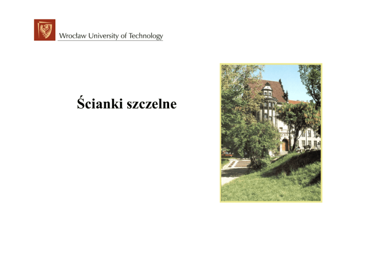 Ścianki szczelne Ściankami szczelnymi nazywamy konstrukcje składające się z zagłębianych w grunt, ściśle do siebie przylegających. Ścianki tymczasowe – potrzebne jedynie w okresie wykonywania robót, np.. W celu zabezpieczenia wykopu przed dopływem wody. Ścianki szczelne stałe stanowią część konstrukcyjną fundamentu Ścianki szczelne mogą spełniać następujące funkcje: • • podtrzymywać ściany wykopów lub uskoków terenu, eliminować lub zmniejszać dopływ wody do wykopu i zabezpieczać przed takimi zjawiskami jak: sufozja, kurzawka - rozmycie dna wykopu, (zastosowanie ścianki szczelnej powoduje przecięcie drogi filtracji lub jej wydłużenie i zmniejszenie średniej wartości spadku hydraulicznego a tym samym prędkości filtracji i ciśnienia spływowego), • zwiększać szczelność podłoża pod podstawą fundamentu we wszelkiego rodzaju budowlach piętrzących wodę, • • umacniać nabrzeża w budownictwie hydrotechnicznym, w posadowieniach bezpośrednich na gruntach nawodnionych, szczególnie w przypadkach piasków drobnych i ruchomych wodach gruntowych, mogą wygrodzić podłoże fundamentów budowli i chronić je przed wypłukiwaniem najdrobniejszych cząstek gruntu. Głębokość wbicia Głębokość wbicia ścianki szczelnej zależy od następujących czynników: • głębokości wykopu lub uskoku terenu, • rodzaju podłoża poniżej dna wykopu (w gruntach kamienistych lub zawierających duże kamienie, kłody drewna itp. przeszkody stosuje się mniejsze głębokości wbicia), • warunków gruntowo-wodnych (głębokość wbicia może wynikać z konieczności zagłębienia ścianki w gruntach nieprzepuszczalnych aby uniemożliwić przepływ wody gruntowej pod ścianką), • wielkości obciążeń przekazywanych na ściankę szczelną, wynikających z parcia gruntu i wody, obciążenia naziomu, obciążenia podłoża w sąsiedztwie ścianki fundamentami istniejących budowli. W praktyce stosuje się następujące rozwiązania: • ścianki szczelne niepodparte, utwierdzone w gruncie (ich stateczność zapewnia odpowiednio duża głębokość wbicia poniżej dna wykopu), • ścianki szczelne podparte, jedno- lub wielokrotnie. Głębokość wbicia ścianek podpartych może być zróżnicowana, zazwyczaj rozpatruje się dwa przypadki: • wbicie na minimalną głębokość wynikającą z warunku stateczności - zapewniającą tzw. „przegubowe podparcie w gruncie”, • wbicie na głębokość zapewniającą jej „utwierdzenie w gruncie”. Głębokość wbicia ścianki ma istotny wpływ na wyniki obliczeń statycznych. Ścianki głębiej wbite są zginane mniejszymi momentami, mniejsze są też reakcje w miejscach podparć (rozpór, zakotwień). Podparcia ścianek realizuje się zazwyczaj poprzez: rozpory (możliwe w wykopach wąskich), kotwy gruntowe, ściągi, (cięgna), przenoszące obciążenia ze ścianki na elementy kotwiące takie jak: płyty i bloki kotwiące, ścianki kotwiące, palowe układy kozłowe. Przy jednokrotnym podparciu, poziom podpory przyjmuje się na głębokości nie większej niż 1/3 wysokości ściany. Rozstaw rozpór, kotew lub ściągów wynika zazwyczaj z wielokrotności szerokości elementu ścianki i sztywności elementu podpierającego ściankę w poziomie kotwienia. Zazwyczaj rozstaw elementów kotwiących nie przekracza 3 m. Rodzaje ścianek szczelnych • ścianki drewniane • ścianki stalowe • ścianki żelbetowe • ścianki betonowe • ścianki szczelne z pali wykonywanych w gruncie Ścianki drewniane Zalety ścianek szczelnych drewnianych: • wykazują znaczną szczelność, która z biegiem czasu wzrasta • są lekkie • są trwałe poniżej zwierciadła wody • mogą pracować na obciążenia pionowe • są tańsze w porównaniu w porównaniu ze stalowymi i żelbetowymi Wady: Mała wytrzymałość, wykazują trudność pokonywania przeszkód w gruncie przy wbijaniu (łatwość uszkodszenia) Ścianki stalowe Zalety ścianek stalowych: • łatwe w wykonaniu, przechodzą przez przeszkody znacznie łatwiej niż inne rodzaje ścianek; • duża wytrzymałość i mały ciężar w stosunku do ścianek żelbetowych; • łatwość sztukowania przez spawanie; • możliwość wielokrotnego użycia grodzic; • dzięki luzom na zamkach można prowadzić ściankę w liniach łukowych Wady: • znaczny koszt; • mniejsza szczelność w porównaniu ze ściankami drewnianymi; • grodzice nie mogą przejmować obciążeń pionowych z wyjątkiem przekrojów skrzyniowych. Ścianki żelbetowe Z uwagi na duży koszt wykonania, szczególnie zaś na trudności w zagłębianiu stosuje się je wyłącznie jako część konstrukcji, nie zaś do czasowej obudowy wykopów. Zalety ścianek żelbetowych: • duża trwałość; • zdolność przenoszenia obciążeń pionowych. Wady: • cięższe od ścianek stalowych; • kruche, łatwo ulegają uszkodzeniu; • duże zużycie stali zbrojeniowej; •Trudniejsze uszczelnienie niż przy ściankach stalowych; • nie mogą być użyte wielokrotnie. Wykonywanie kotwii gruntowych: • wywiercenie otworu, • wprowadzenie w otwór cięgna, • wykonanie zastrzyku na odcinku nośnym kotwii, • napięcie cięgna, • dokończenie zastrzyku.